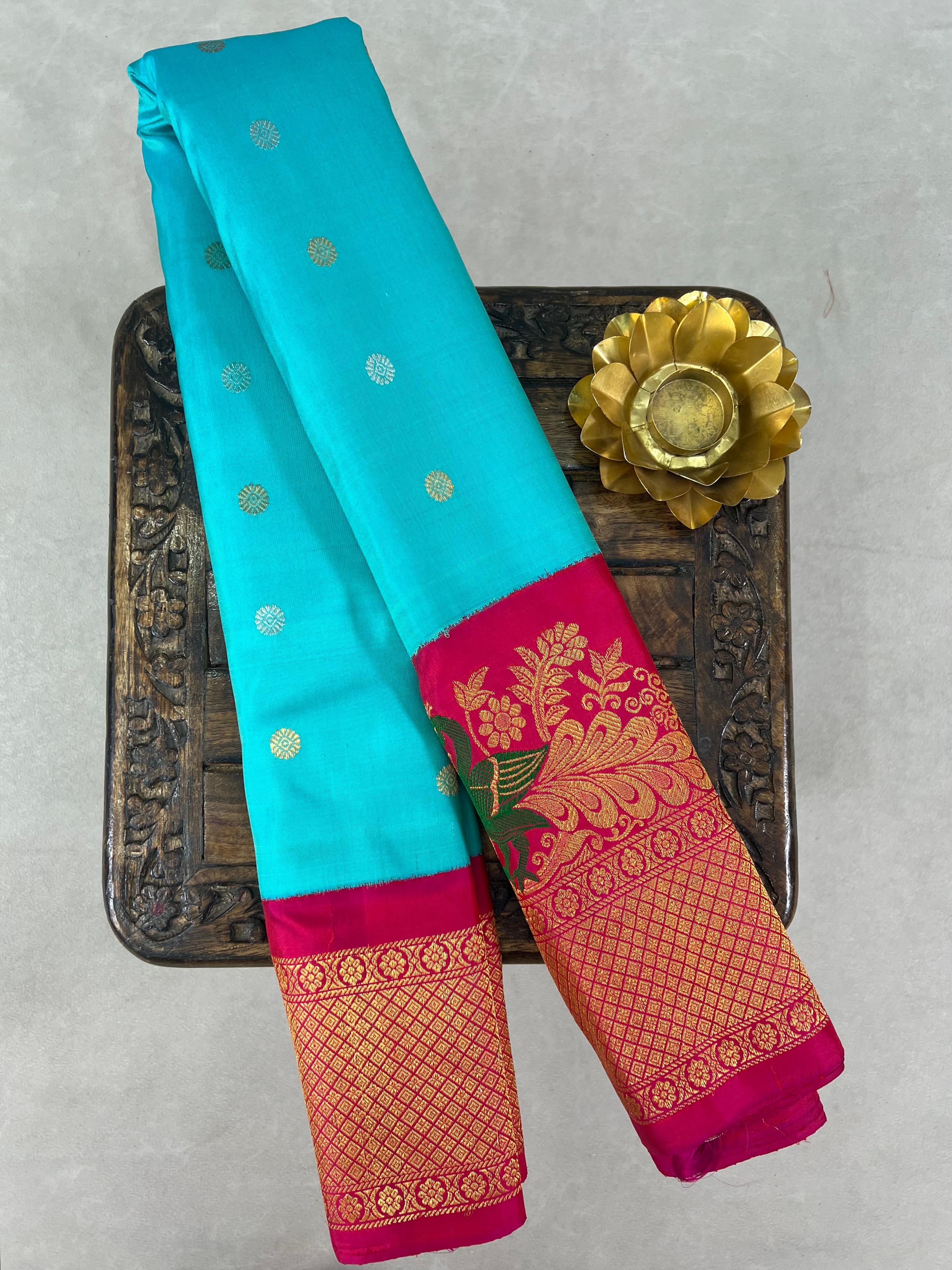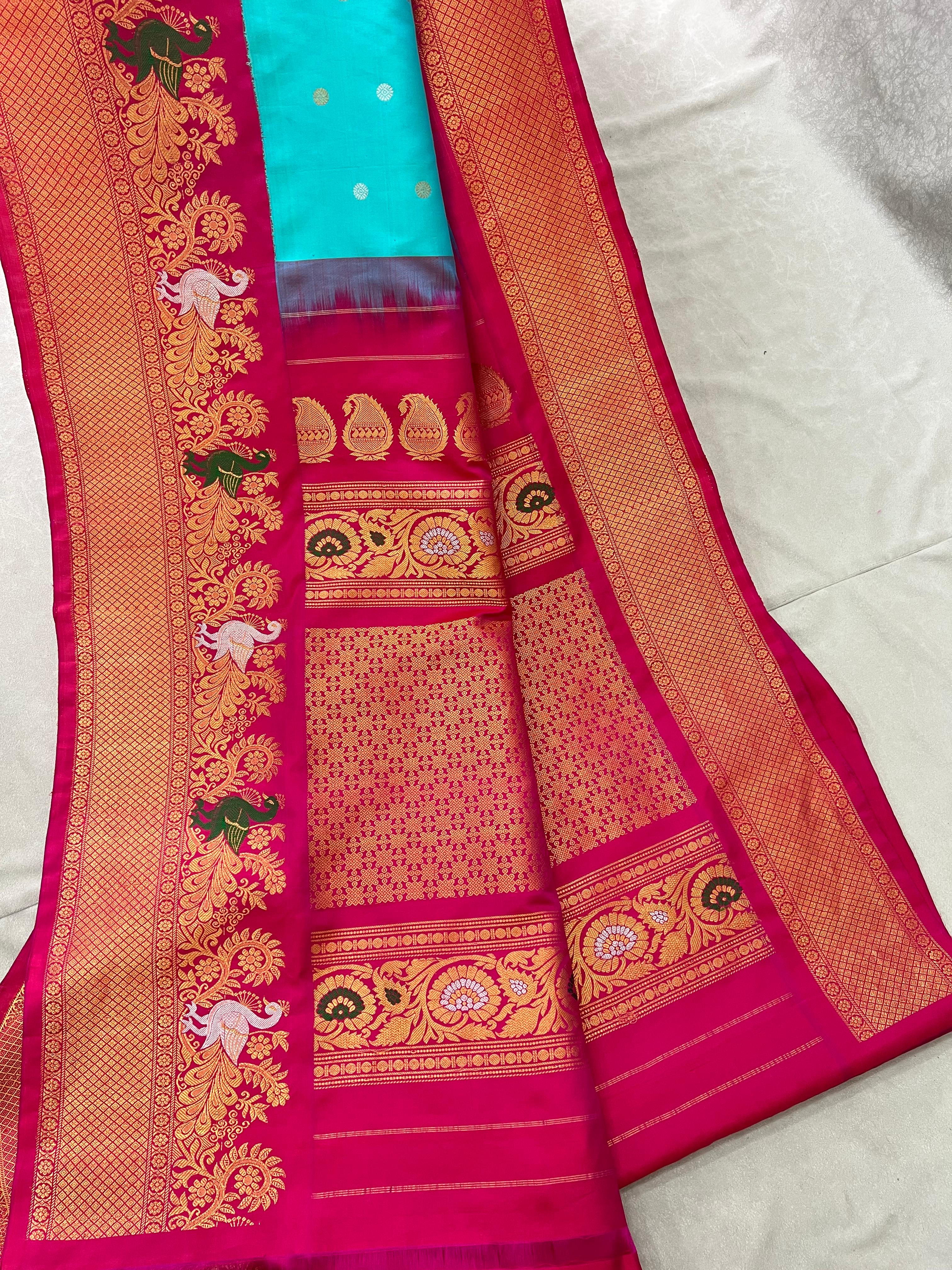 This elegant Gadwal Pure Silk Saree features a vibrant sea blue body adorned with delicate gold and silver buttas. The rich pink kuttu turning border showcases intricate zari peacock motifs and diamond patterns, adding a royal touch. Perfectly handwoven with traditional craftsmanship, this saree beautifully blends heritage and grace—ideal for festive and special occasions. Comes with contrast blouse, and Silk Mark certified — perfect for traditional celebrations.