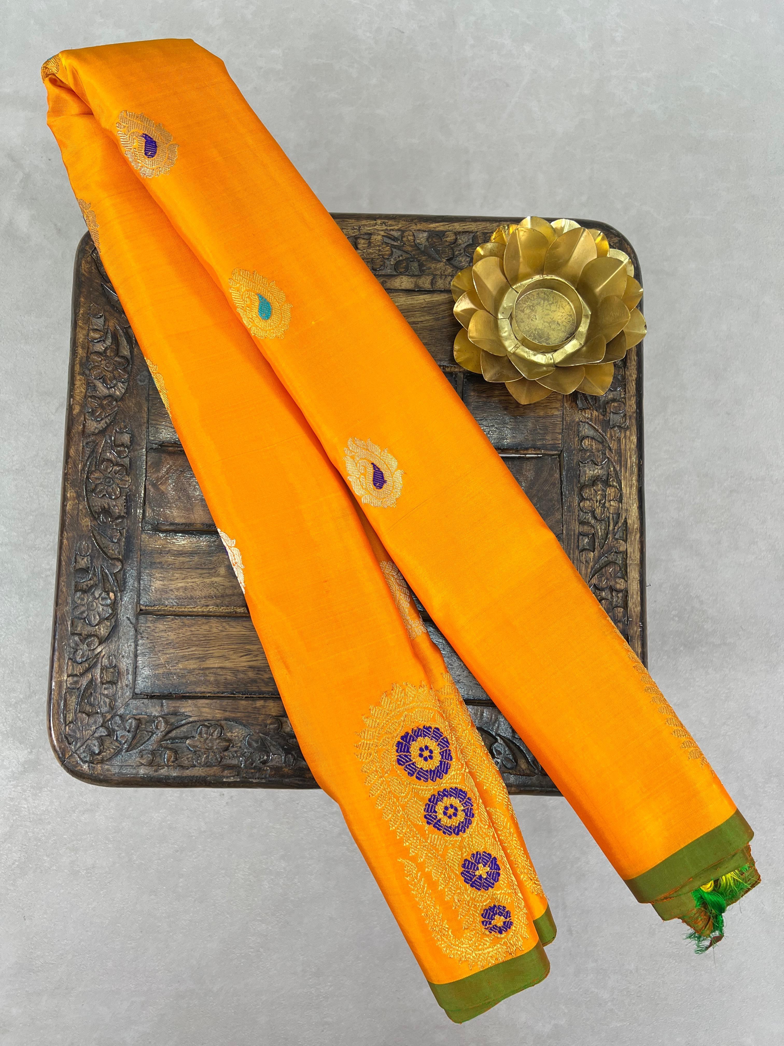 Gracefully crafted, this yellow Gadwal pure silk saree features intricate gold and silver meena butta motifs scattered across the fabric and a beautifully woven gold zari meena butta border. The subtle light green edging adds a refined contrast, making it perfect for festive occasions and traditional celebrations. A timeless piece that reflects the artistry of handloom weaving with a modern touch. Pair with contrast blouse, and is Silk Mark certified for authenticity.