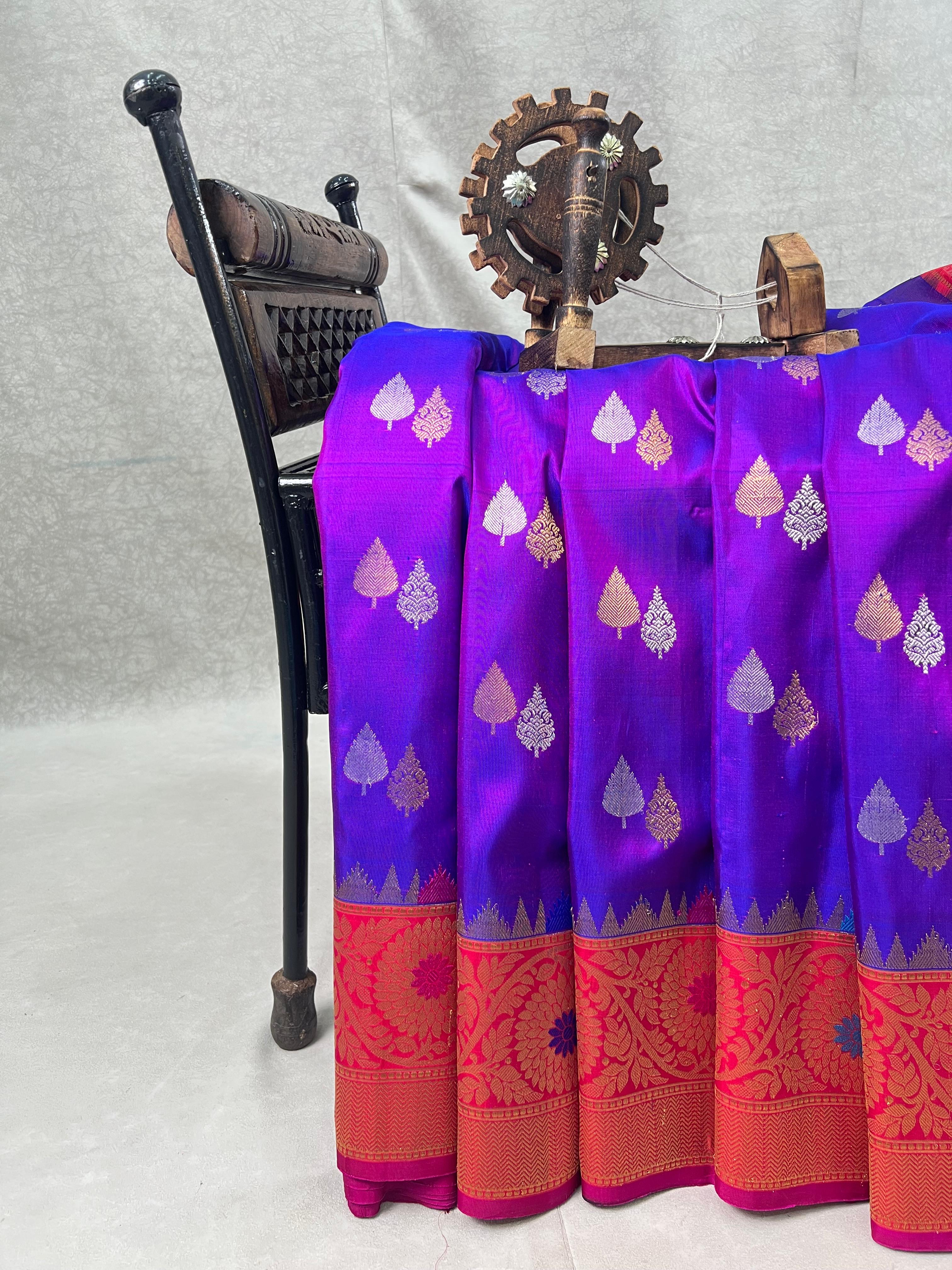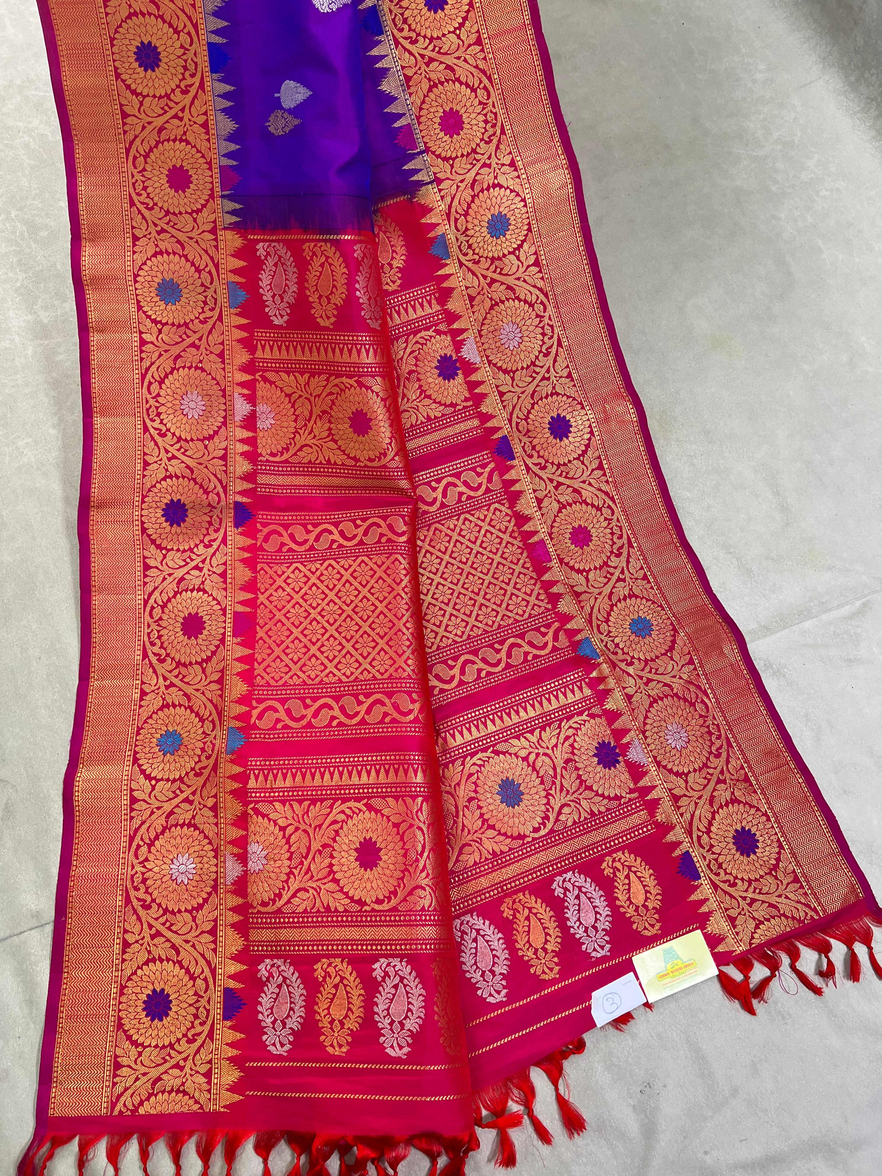 This stunning Gadwal pure silk handloom meenakari tuning border saree features a violet with gold and silver zari motifs. Contrast pink border with meenakari intricate patterns. The touch of gold zari on the edge adds a vibrant finish, making it a perfect choice for festive and traditional celebrations. Comes with contrast blouse, and Silk Mark certified — perfect for traditional celebrations.