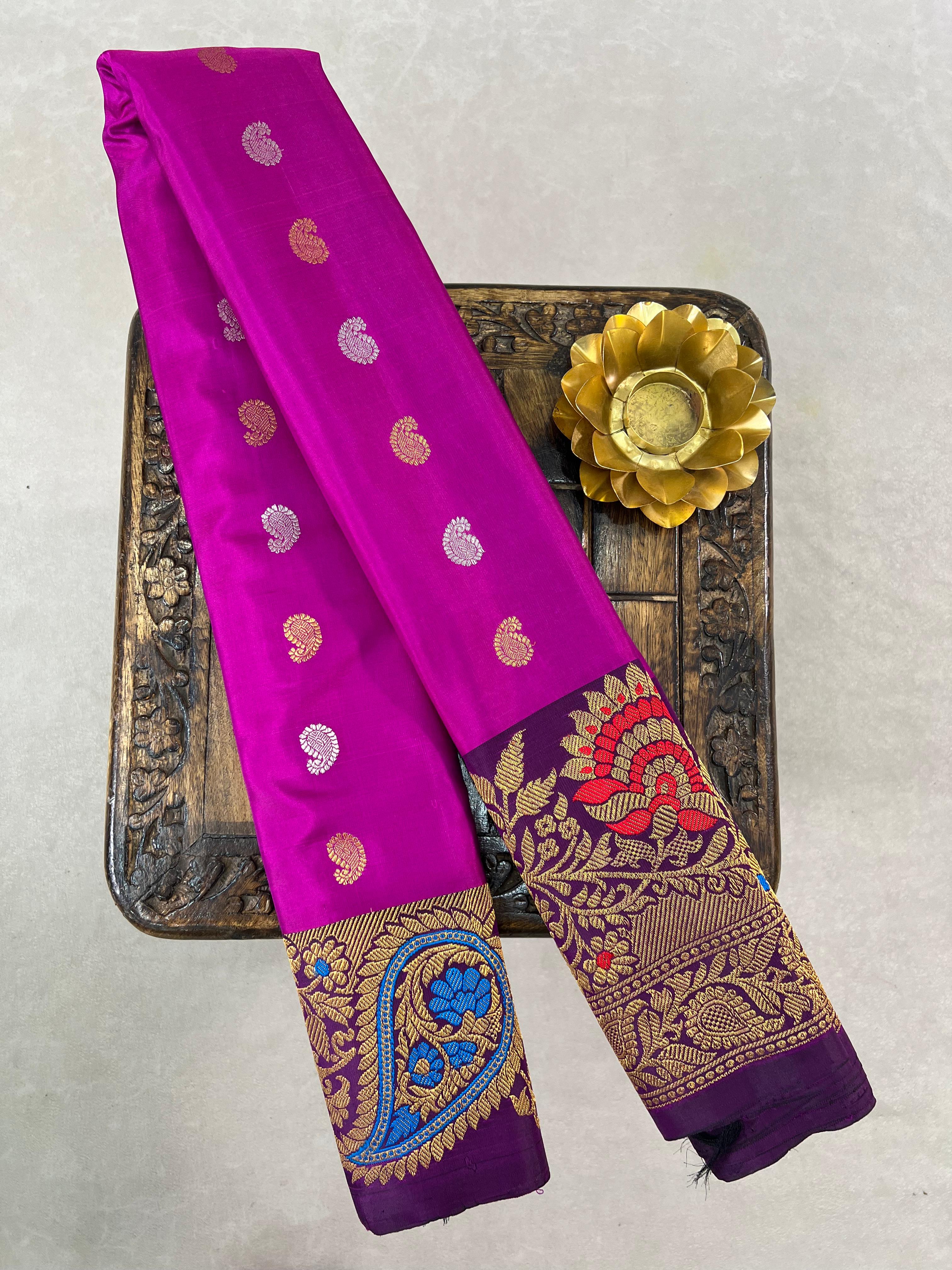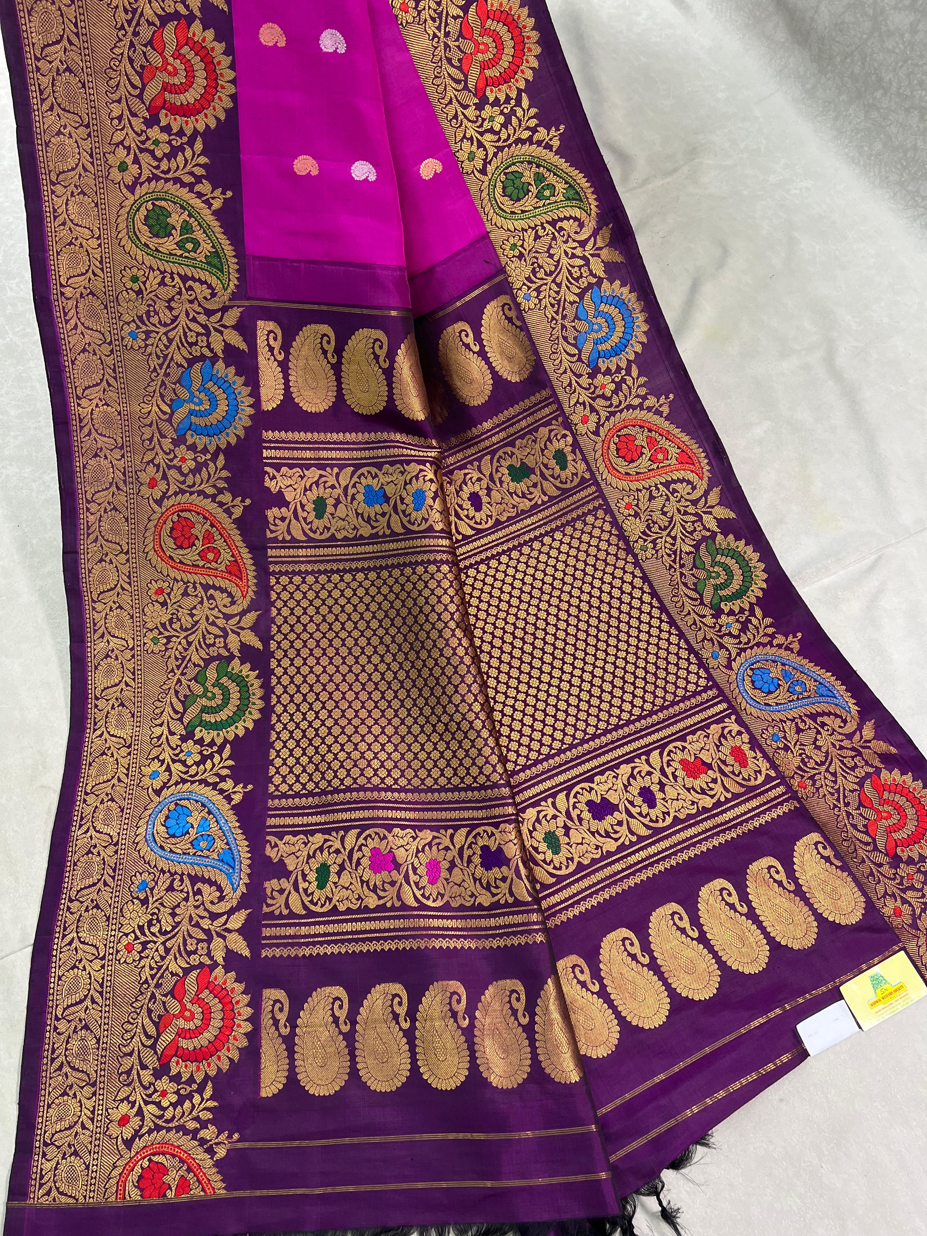 This stunning Gadwal pure silk handloom meenakari tuning border saree features a magenta with gold and silver zari motifs. Contrast dark purple border with meenakari intricate patterns. The touch of gold zari on the edge adds a vibrant finish, making it a perfect choice for festive and traditional celebrations. Comes with contrast blouse, and Silk Mark certified — perfect for traditional celebrations.