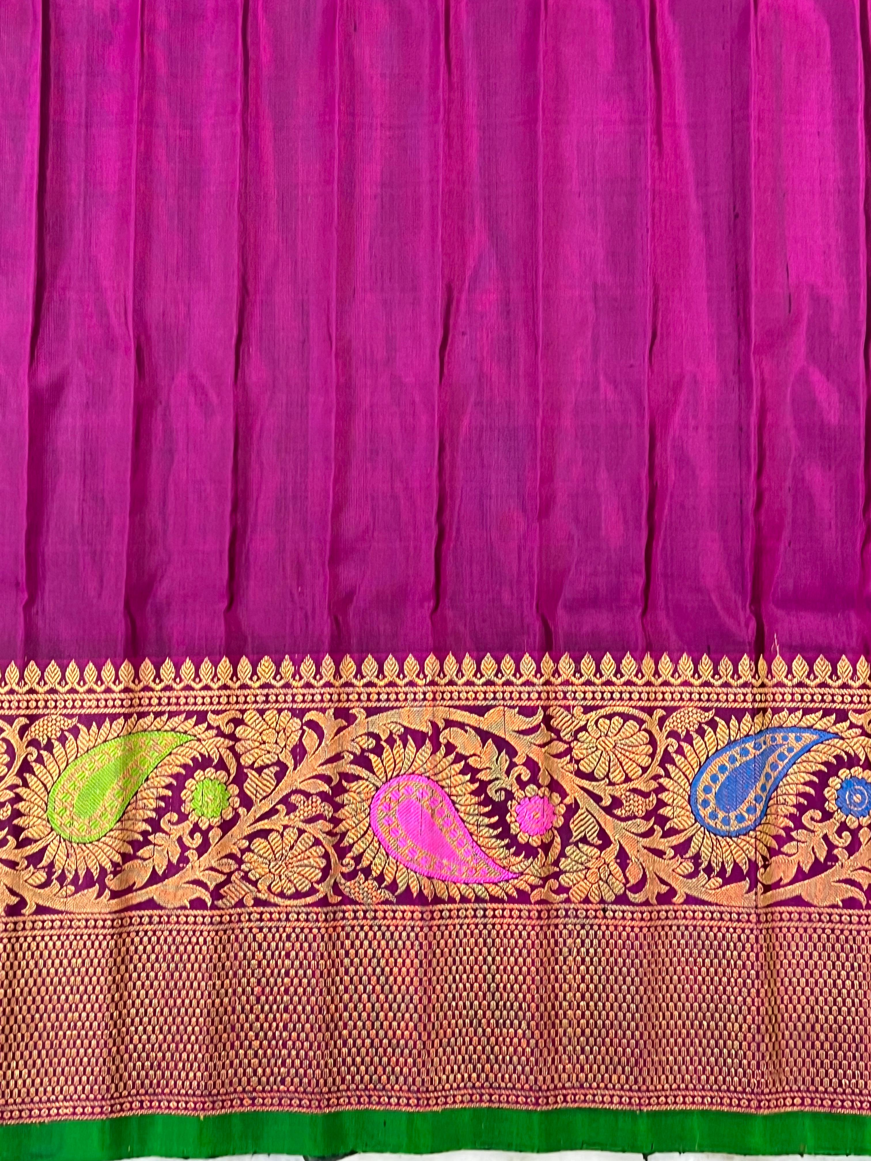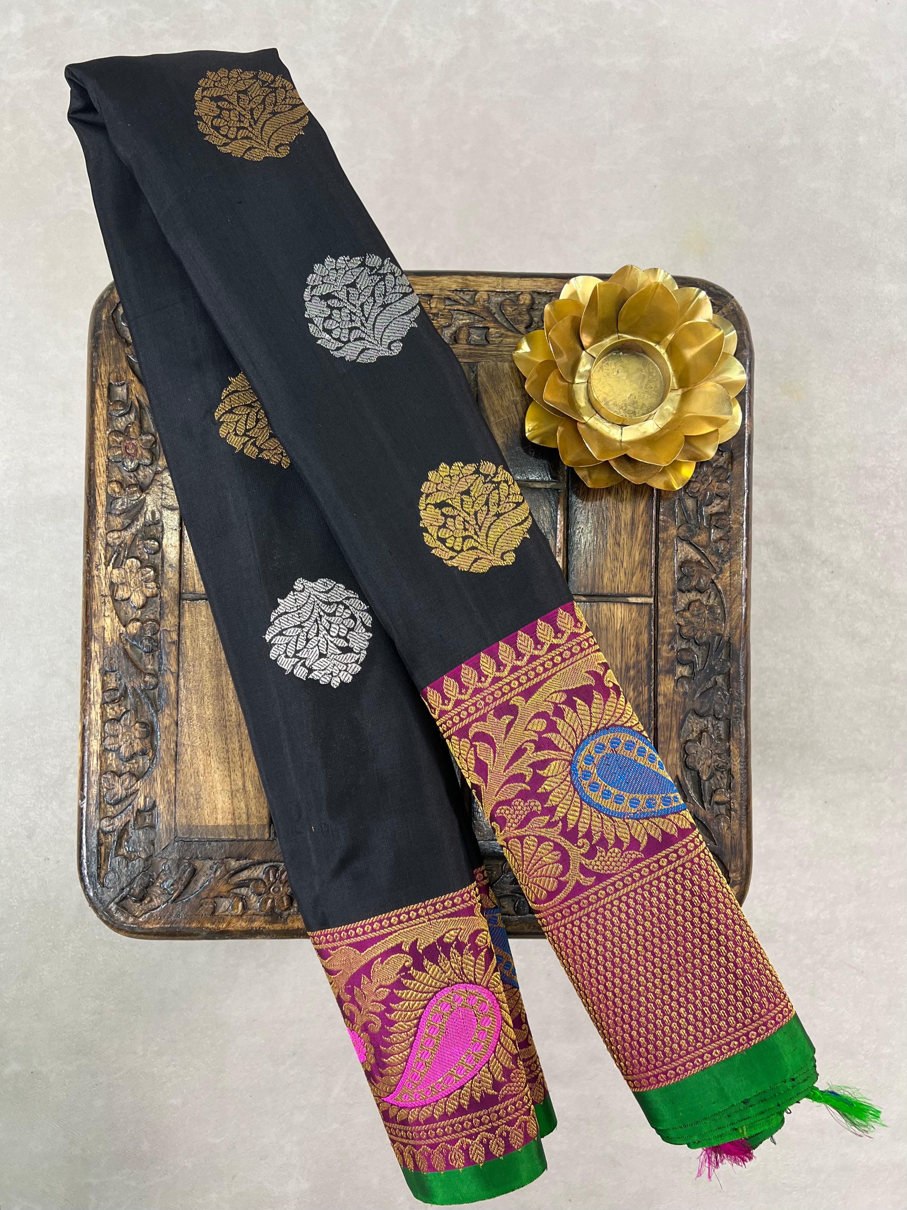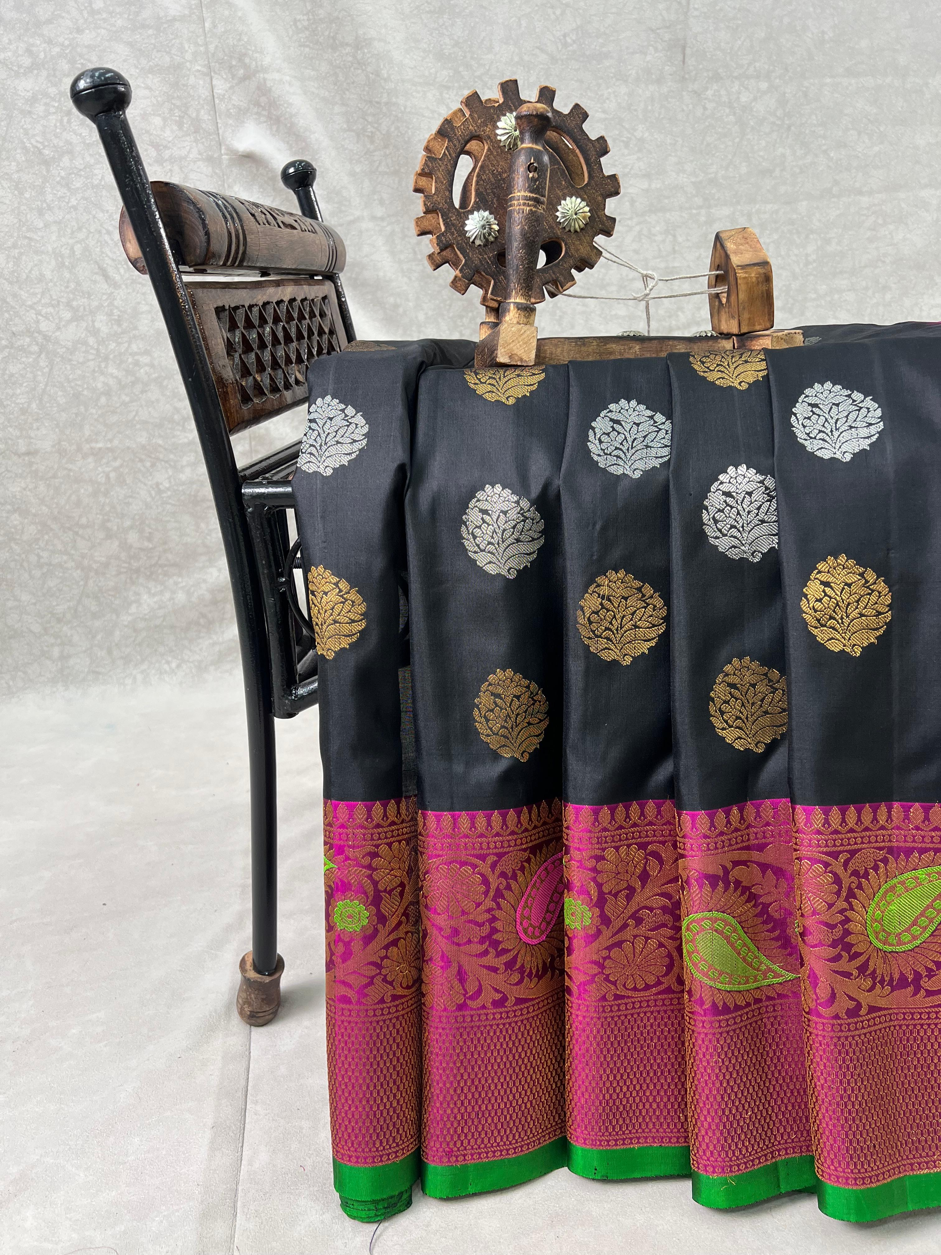 This stunning Gadwal pure silk handloom meenakari tuning border saree features a black with gold and silver zari motifs. Contrast magenta border with meenakari intricate patterns. The touch of green on the edge adds a vibrant finish, making it a perfect choice for festive and traditional celebrations. Comes with contrast blouse, and Silk Mark certified — perfect for traditional celebrations.