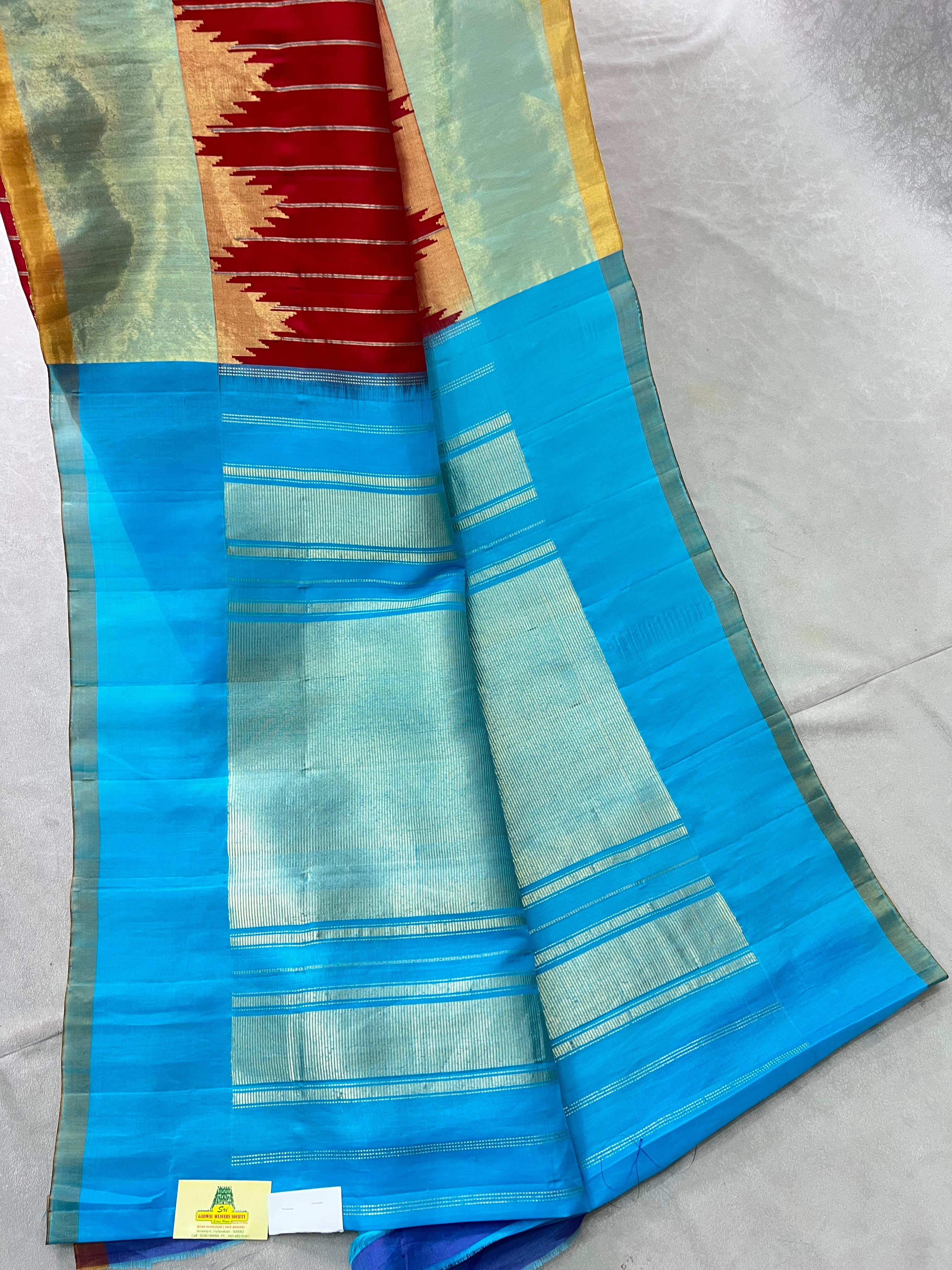 This is a Gadwal Pure Silk Plain Border Handloom Saree, featuring a vibrant red body with subtle stripes patterns, beautifully contrasted by a plain light green tissue border with a mustard edge. The classic color combination and fine handloom weave make it a timeless piece, perfect for traditional occasions and festive celebrations. Pair with contrast blouse, and is Silk Mark certified for authenticity.