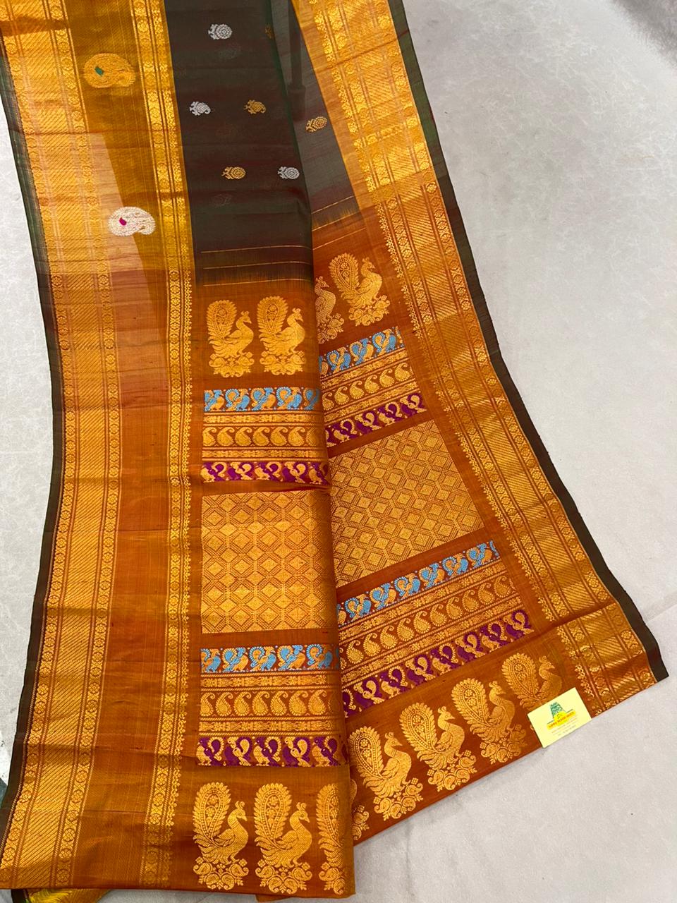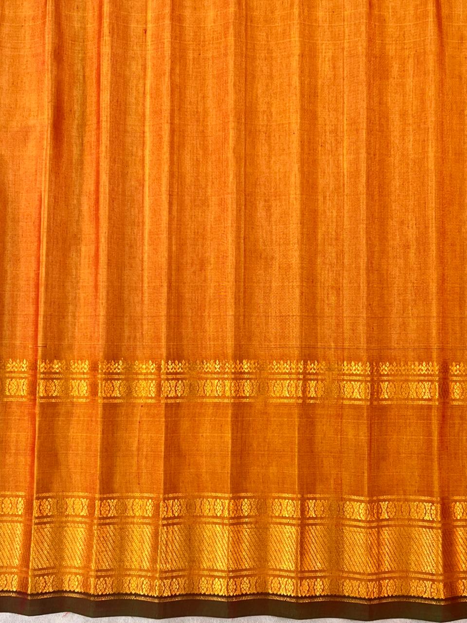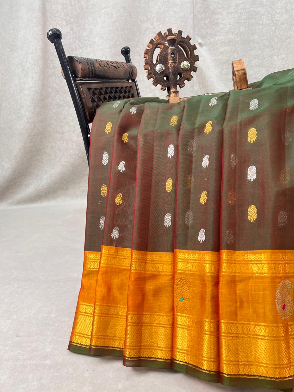 This elegant Gadwal Cotton Silk (SICO) Handloom Saree features a vibrant dual shaded Green body adorned with delicate gold and silver buttas, creating a timeless charm. The Orange meena butta gap border are intricately woven with floral gold zari work and finished with a green selvedge, giving the saree a graceful and traditional look. Lightweight and breathable, it is perfect for festive occasions and summer functions. This saree comes with a contrast blouse