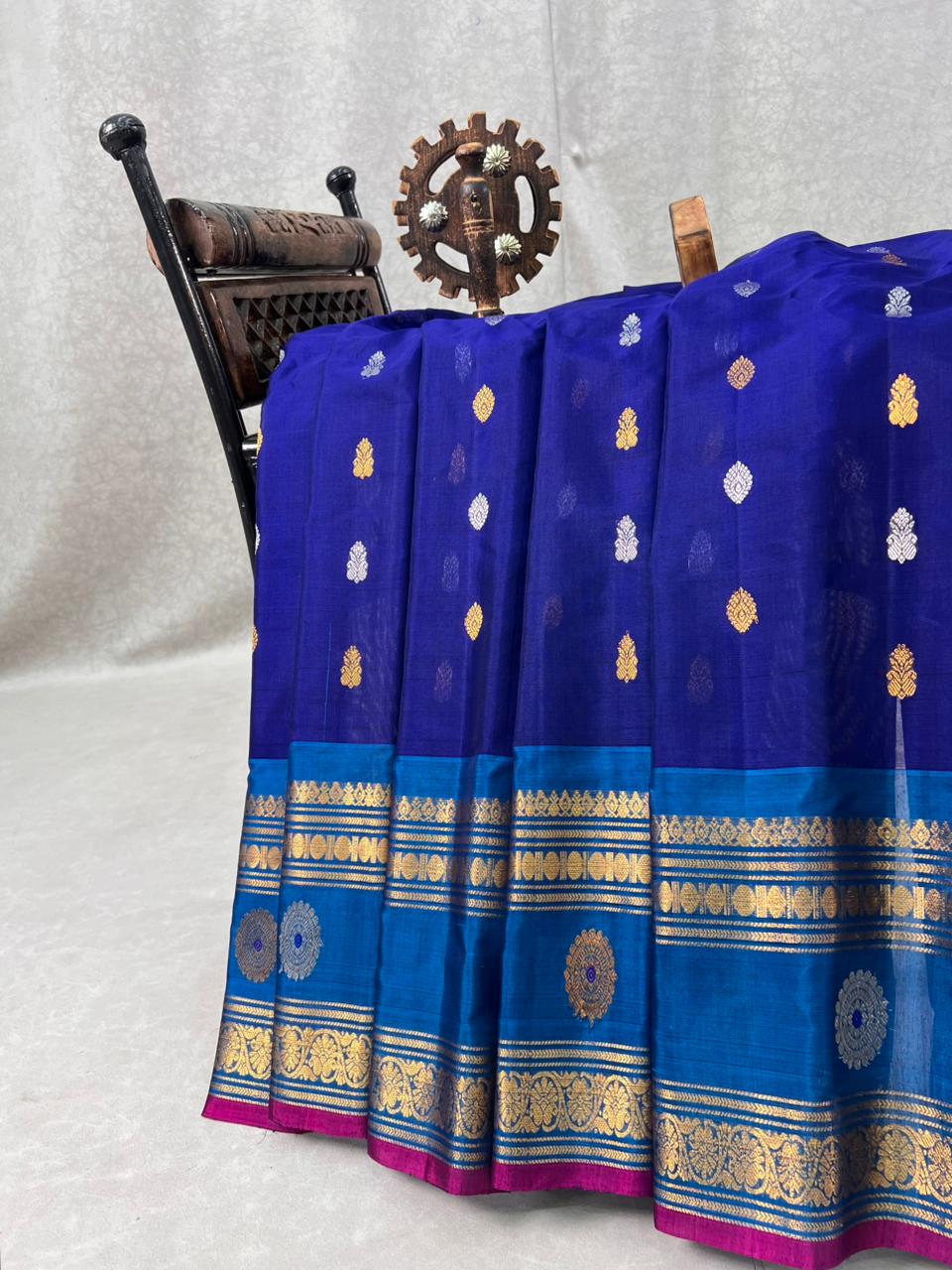 This elegant Gadwal Cotton Silk (SICO) Handloom Saree features a vibrant Dark blue body adorned with delicate gold and silver buttas, creating a timeless charm. The Blue meena butta gap border are intricately woven with floral gold zari work and finished with a Magenta selvedge, giving the saree a graceful and traditional look. Lightweight and breathable, it is perfect for festive occasions and summer functions. This saree comes with a contrast blouse