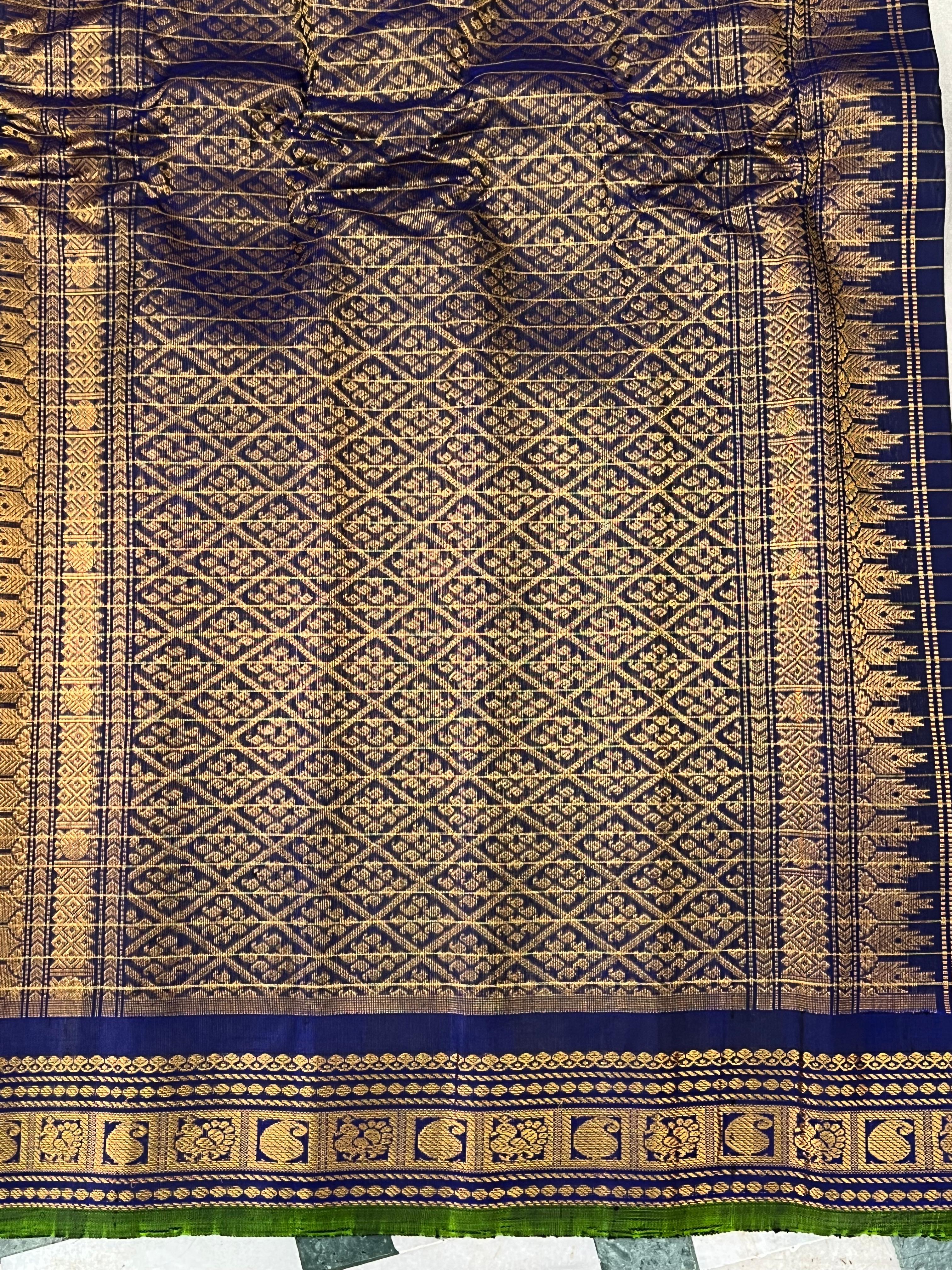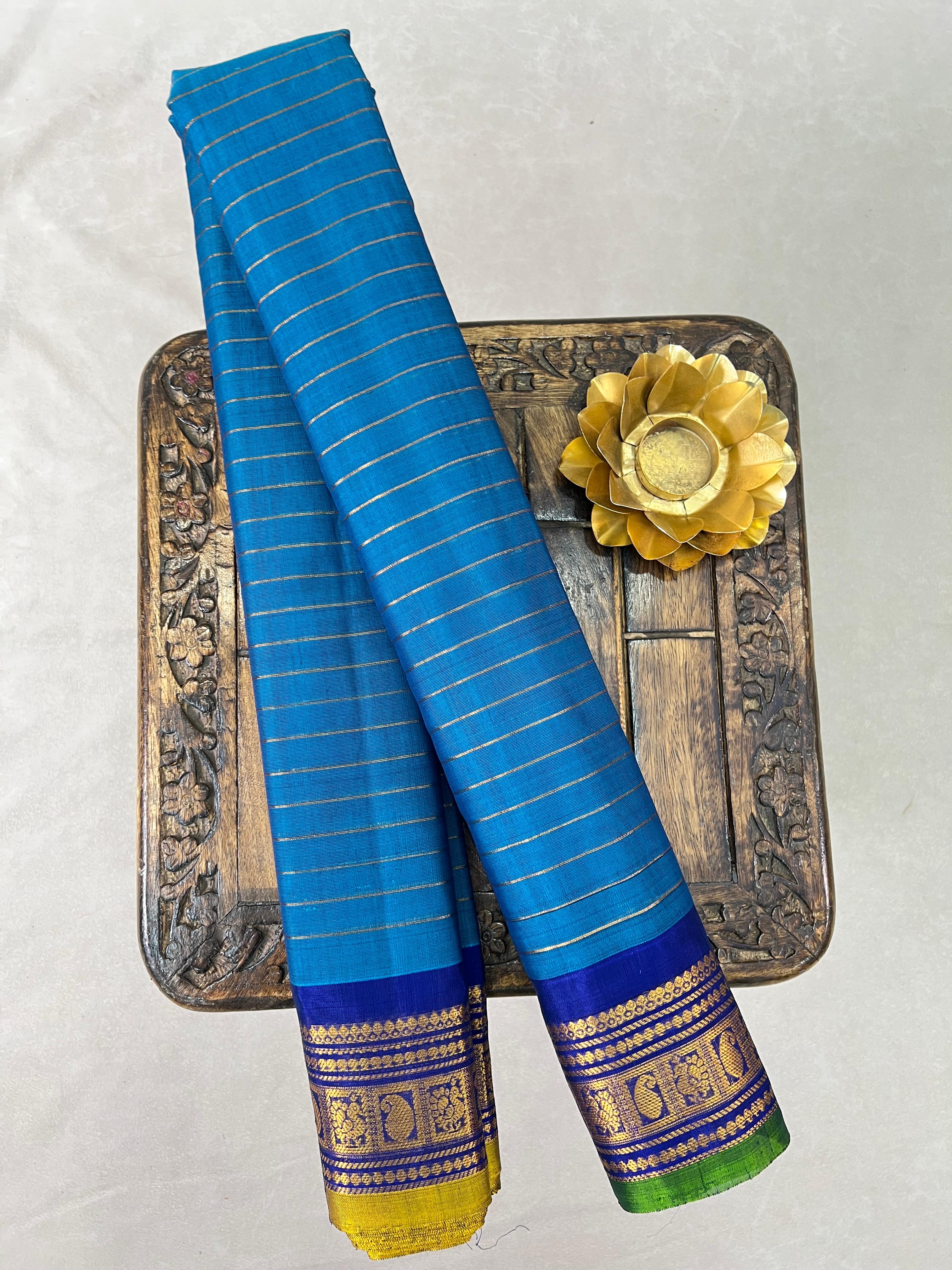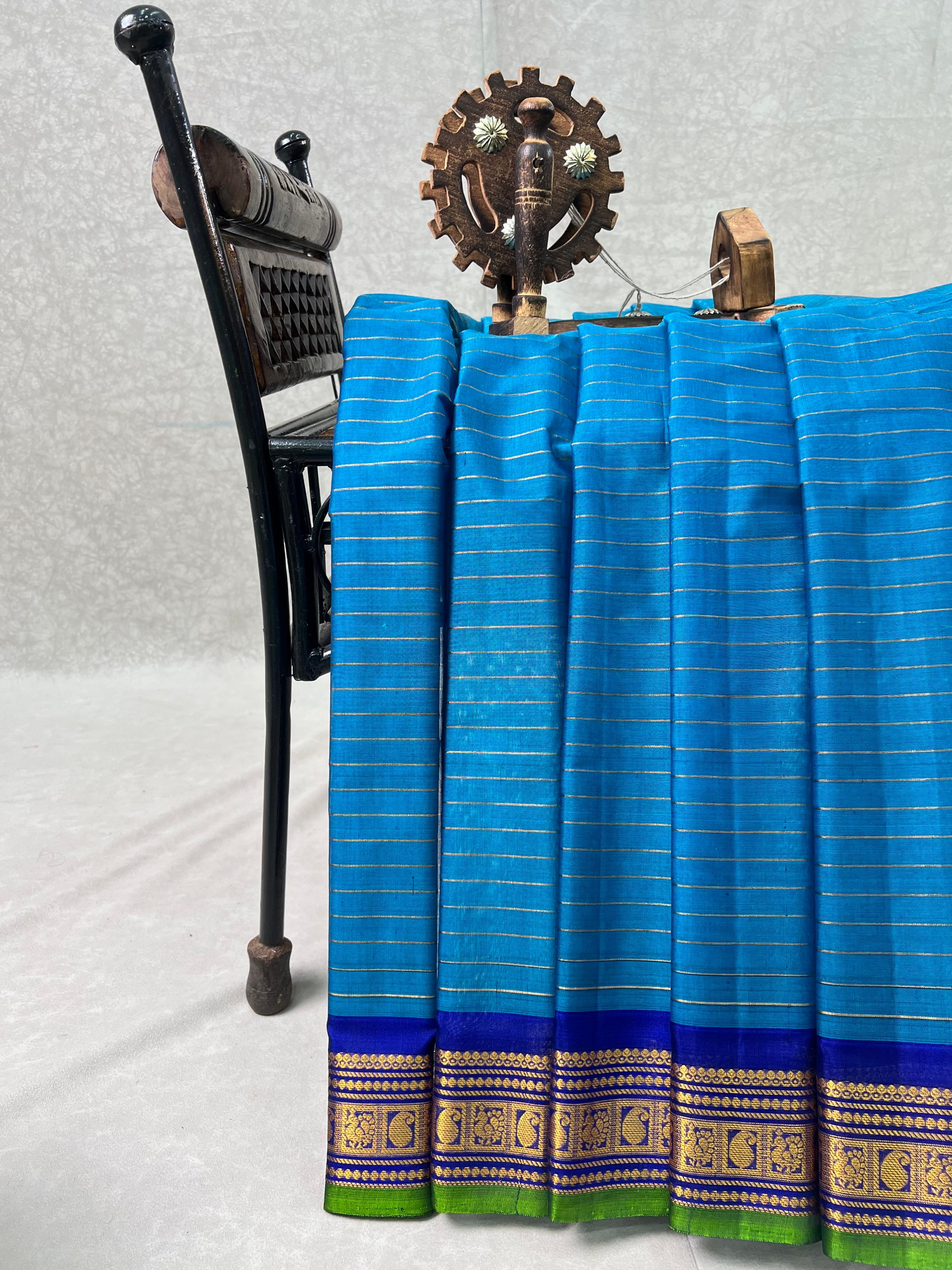 This elegant Gadwal Cotton Silk (Sico) Saree features a refreshing turquoise blue body adorned with subtle thin gold horizontal stripes, exuding timeless grace. The Royal Blue border is beautifully enriched and striking golden stripes with parrot green selvedge, adding a vibrant touch of tradition. Perfect for festive occasions or elegant gatherings, this saree blends the softness of silk with the comfort of cotton - a true handloom masterpiece from Gadwal. Comes with without blouse
