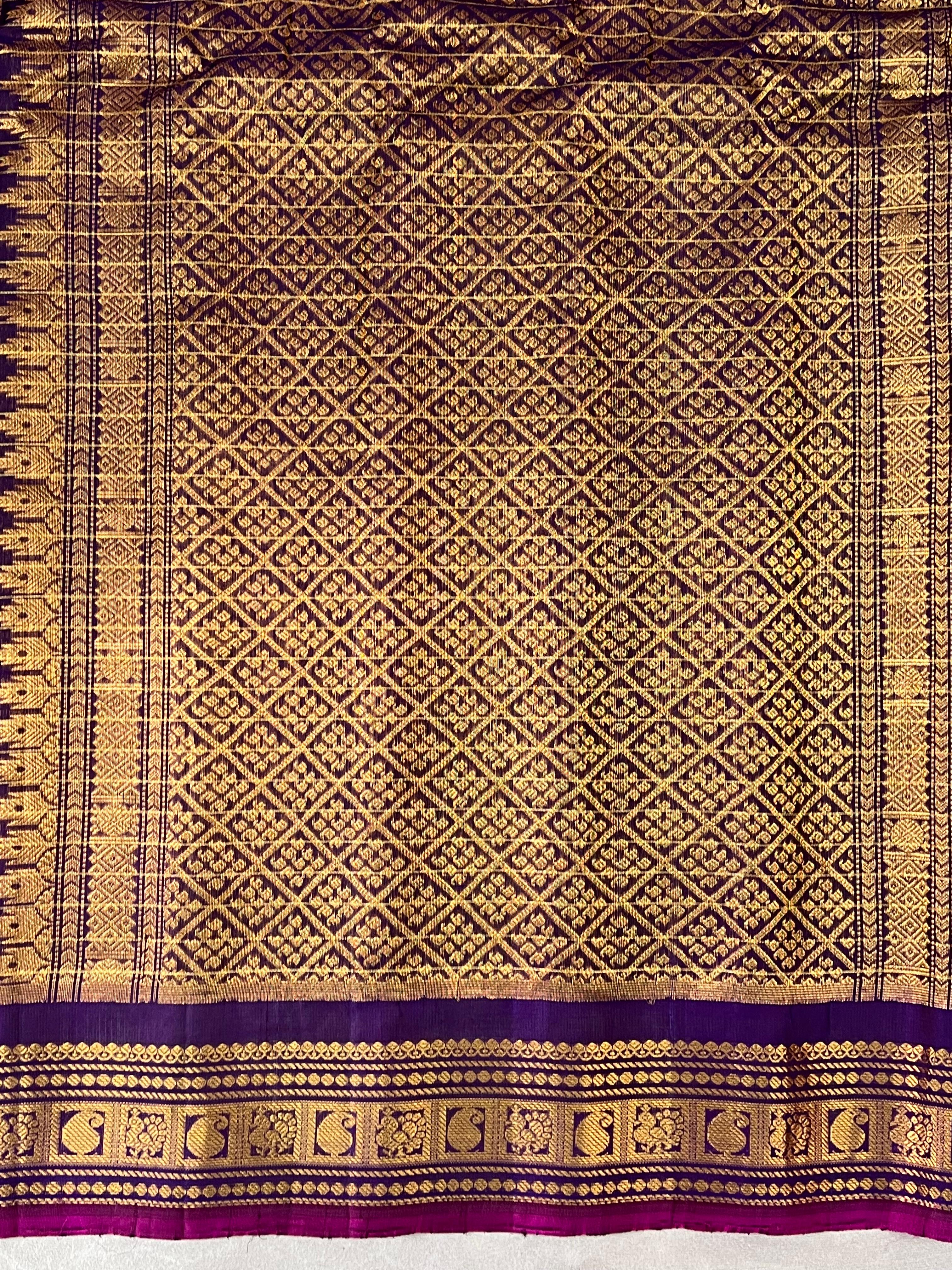 This elegant Gadwal Cotton Silk (Sico) Saree features a refreshing Orange Color body adorned with subtle Golden stripes exuding timeless grace. The Violet border is beautifully enriched with striking golden zari work and a Pink selvedge, adding a vibrant touch of tradition. Perfect for festive occasions or elegant gatherings, this saree blends the softness of silk with the comfort of cotton - a true handloom masterpiece from Gadwal. Comes without blouse