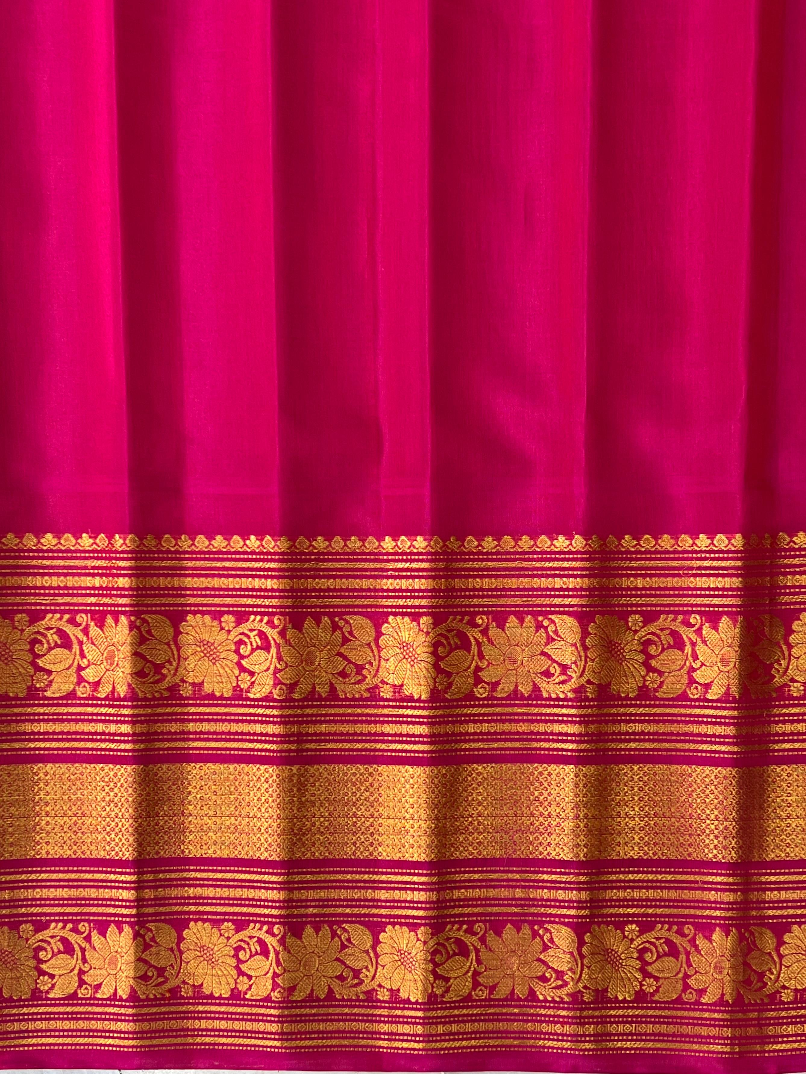 This elegant Gadwal Cotton Silk (Sico) Saree features a graceful onion pink body with delicate buttas in gold and silver, paired with a rich contrast pink border and pallu woven in intricate golden zari motifs. Lightweight yet grand, it beautifully blends the comfort of cotton with the sheen of silk, making it ideal for festive and traditional occasions. Comes with contrast blouse.