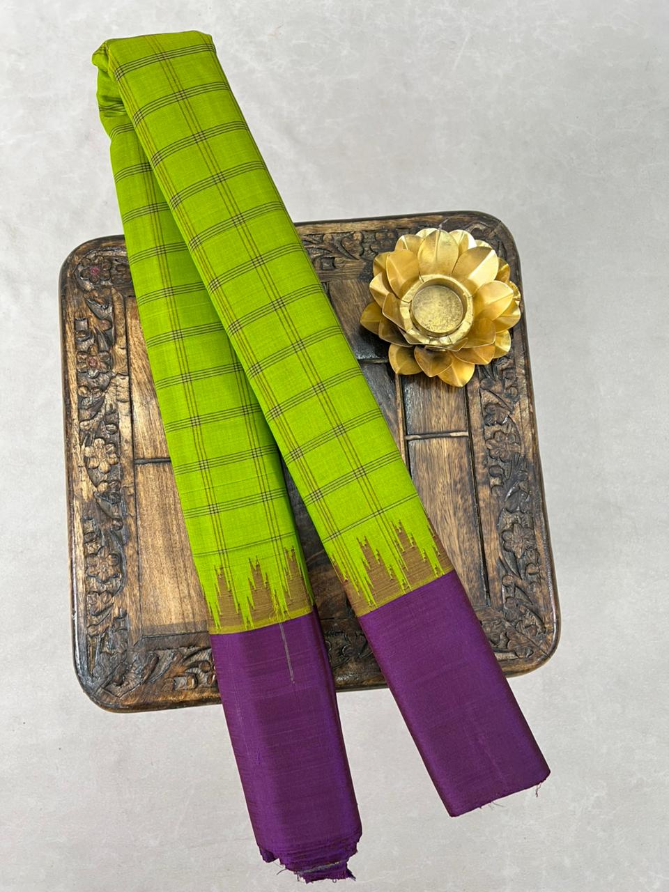 This elegant Gadwal Cotton Silk (Sico) saree features a refreshing Leaf green body adorned with subtle thread checks, exuding timeless grace. The Purple plain kuttu border adds a vibrant touch of tradition. Perfect for festive occasions or elegant gatherings, this saree beautifully blends the softness of silk with the comfort of cotton-a true handloom masterpiece from Gadwal. This saree comes with a contrast blouse and is Silk Mark certified.