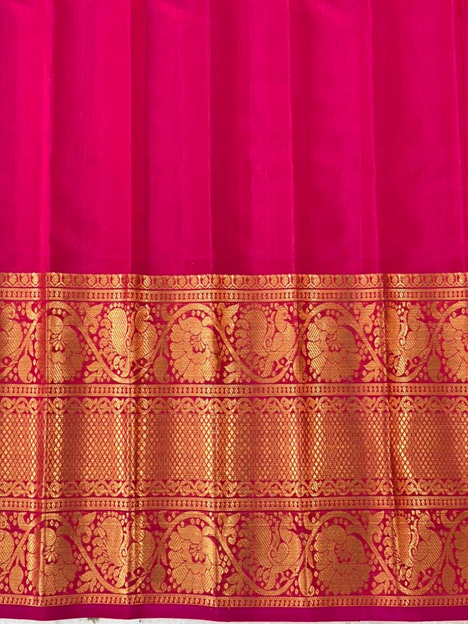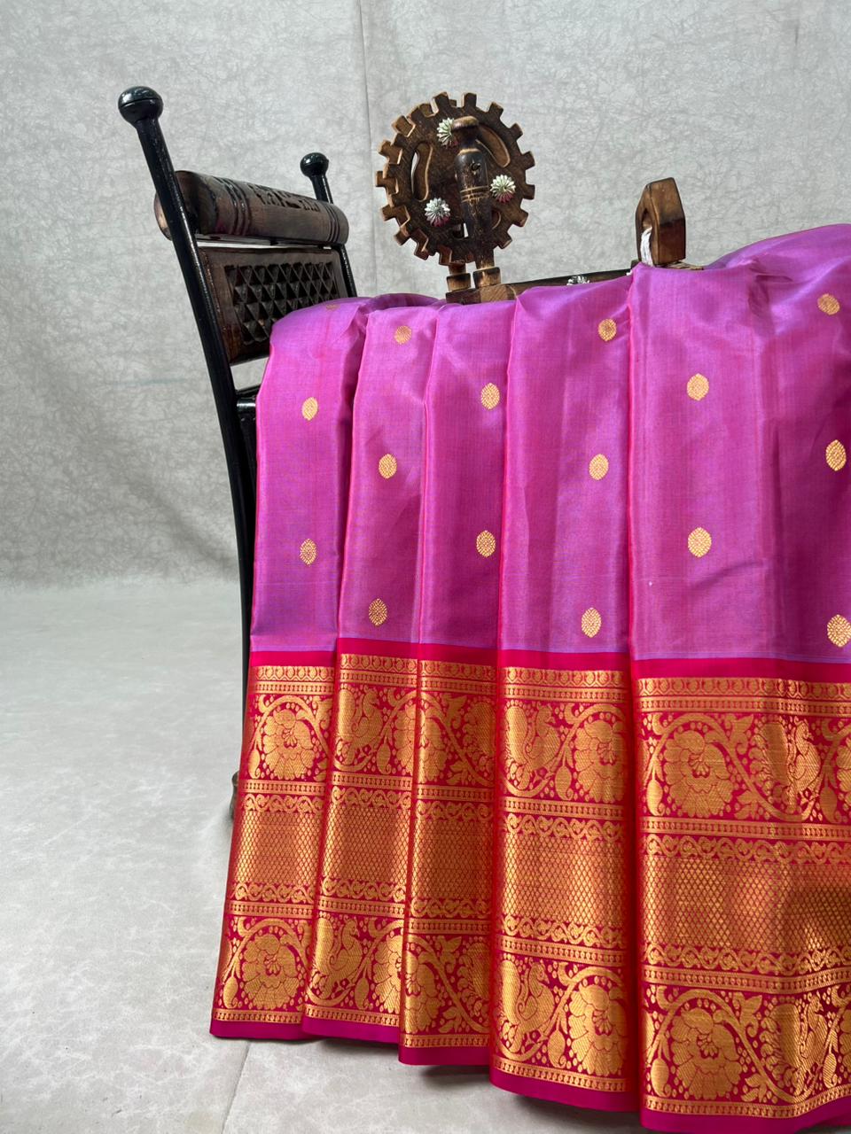 This elegant Gadwal Cotton Silk (Sico) Saree features a graceful dual shade baby pink body with delicate Gold zari buttas, paired with a rich contrast Dark pink border and pallu woven in intricate golden zari motifs. Lightweight yet grand, it beautifully blends the comfort of cotton with the sheen of silk, making it ideal for festive and traditional occasions. Comes with contrast blouse.