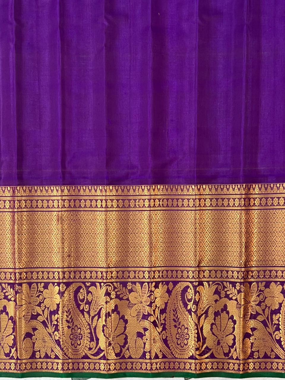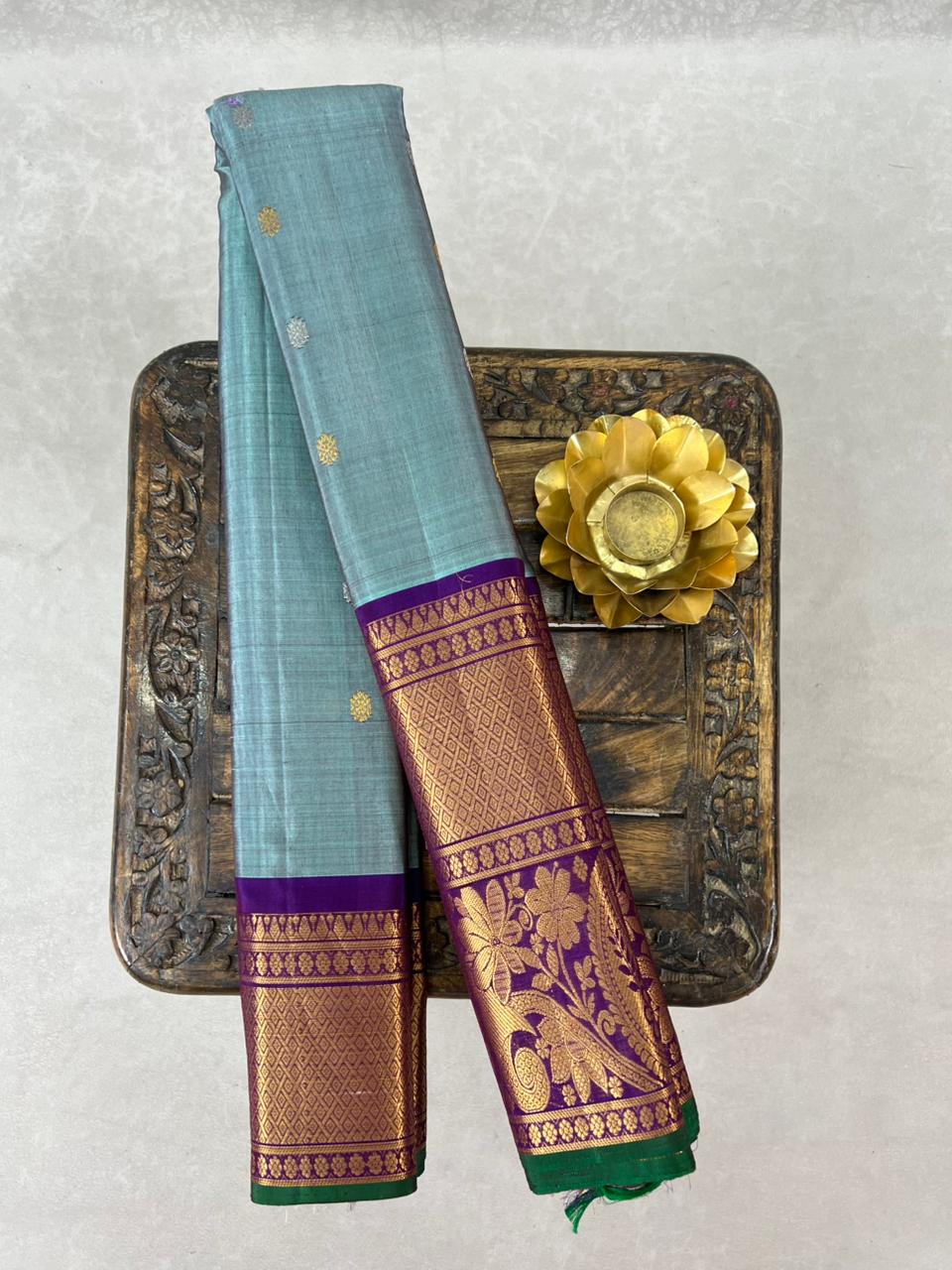 This elegant Gadwal Cotton Silk (Sico) Saree features a graceful Ice blue body with delicate Gold and silver zari buttas, paired with a rich contrast Purple border with green selvedge and pallu woven in intricate golden zari motifs. Lightweight yet grand, it beautifully blends the comfort of cotton with the sheen of silk, making it ideal for festive and traditional occasions. Comes with contrast blouse.