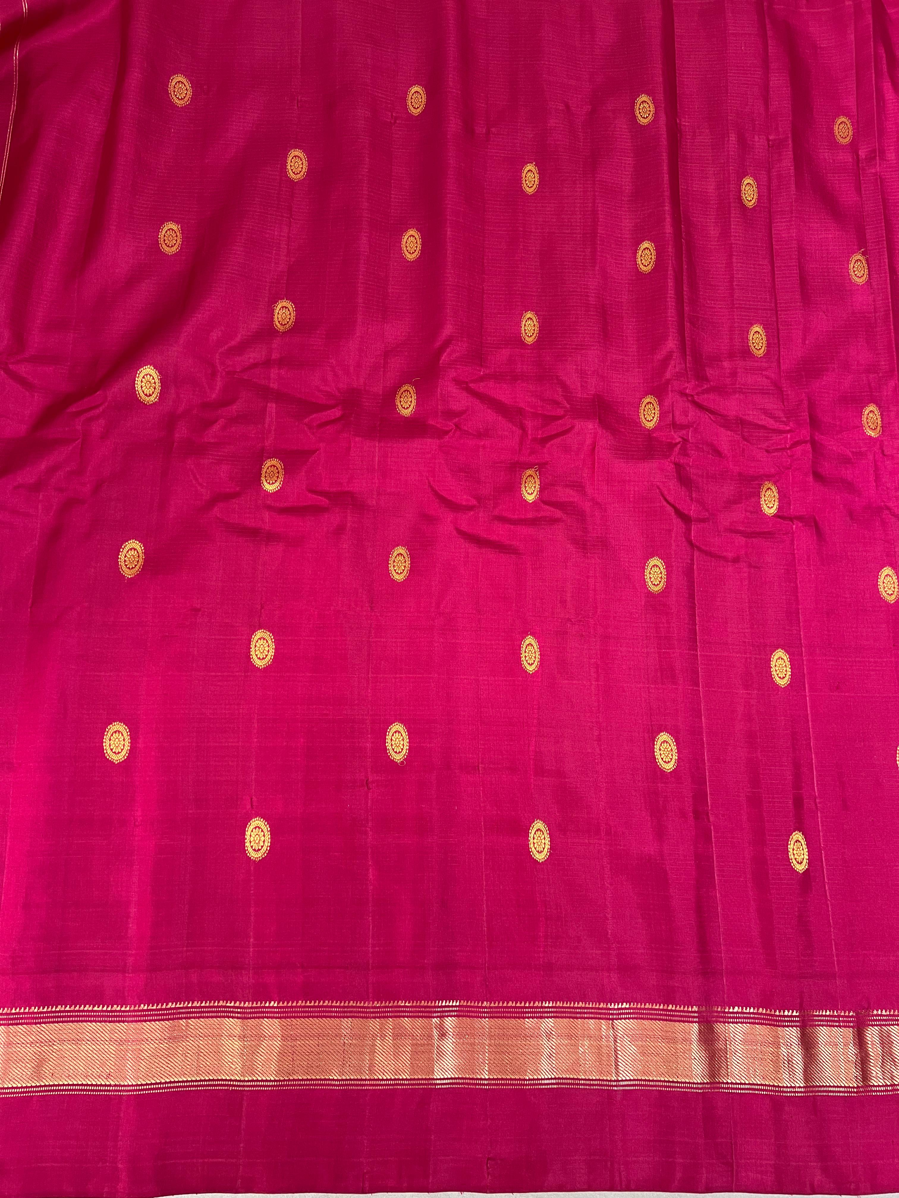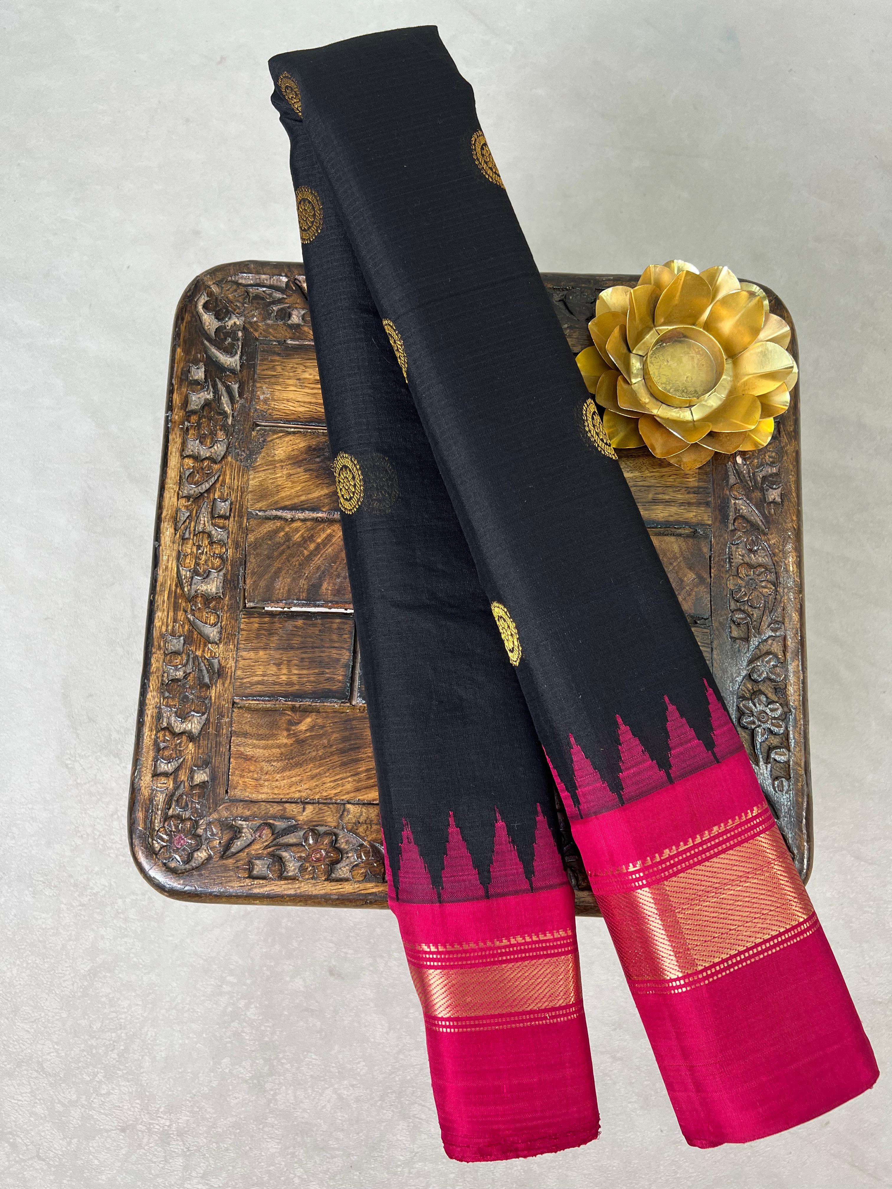 This elegant Gadwal Handloom Cotton Silk Saree features a rich black body adorned with small woven motifs. The striking magenta zari border with traditional temple design and intricate gold weaving adds a regal contrast. Lightweight, soft, and easy to drape, this SICO saree beautifully blends the comfort of cotton with the sheen of silk — perfect for festive and traditional occasions. Comes with contrast blouse.