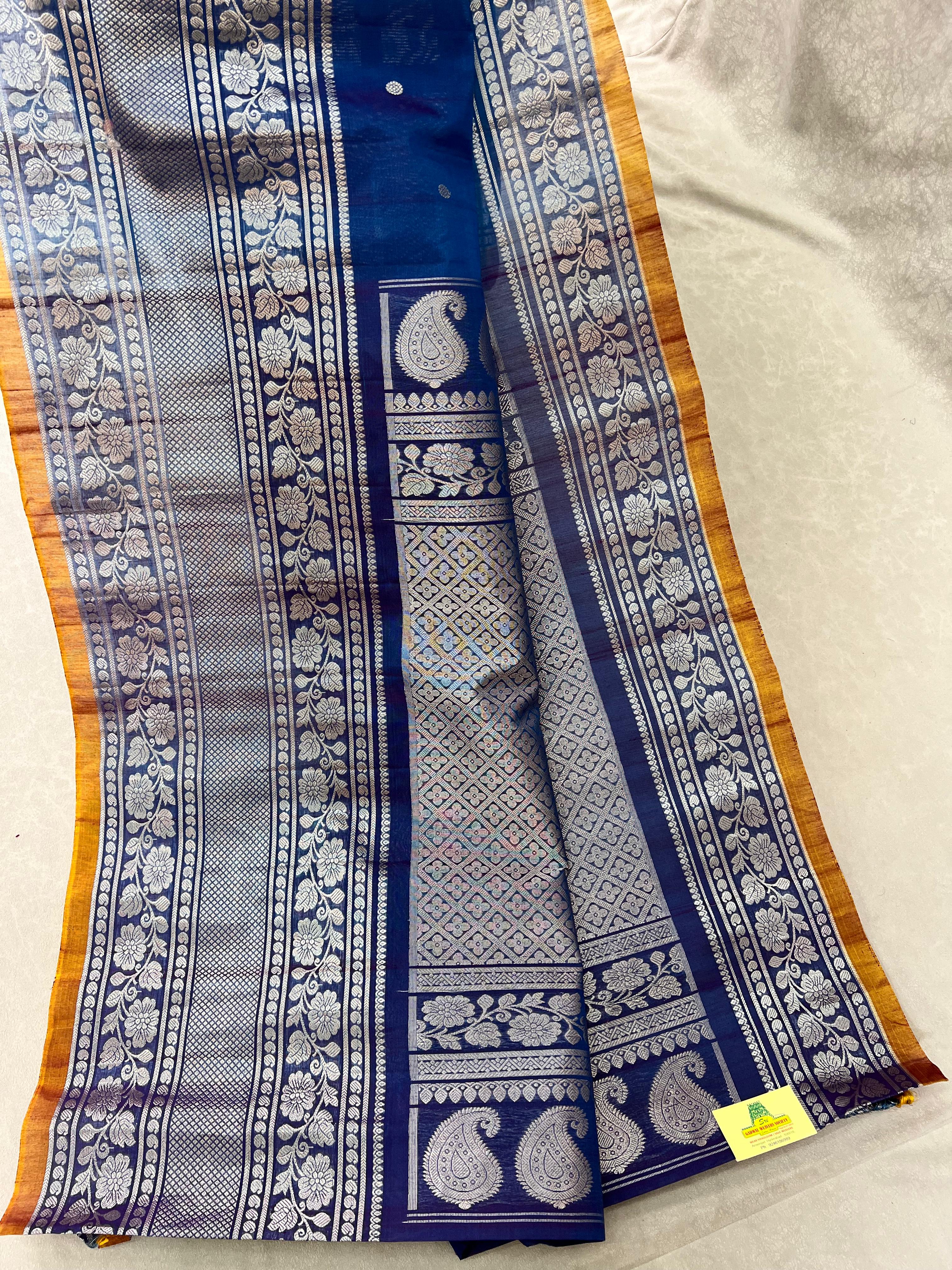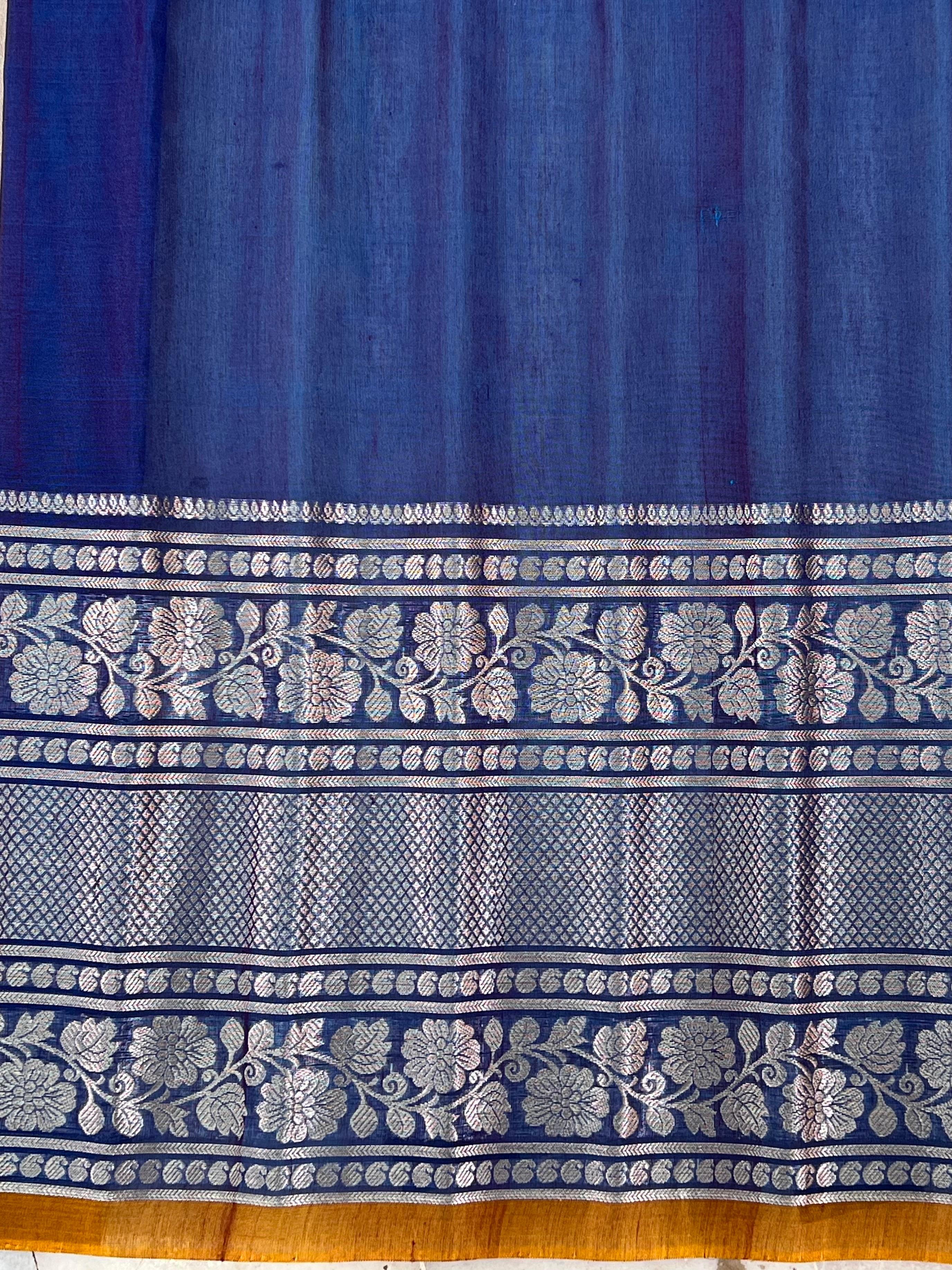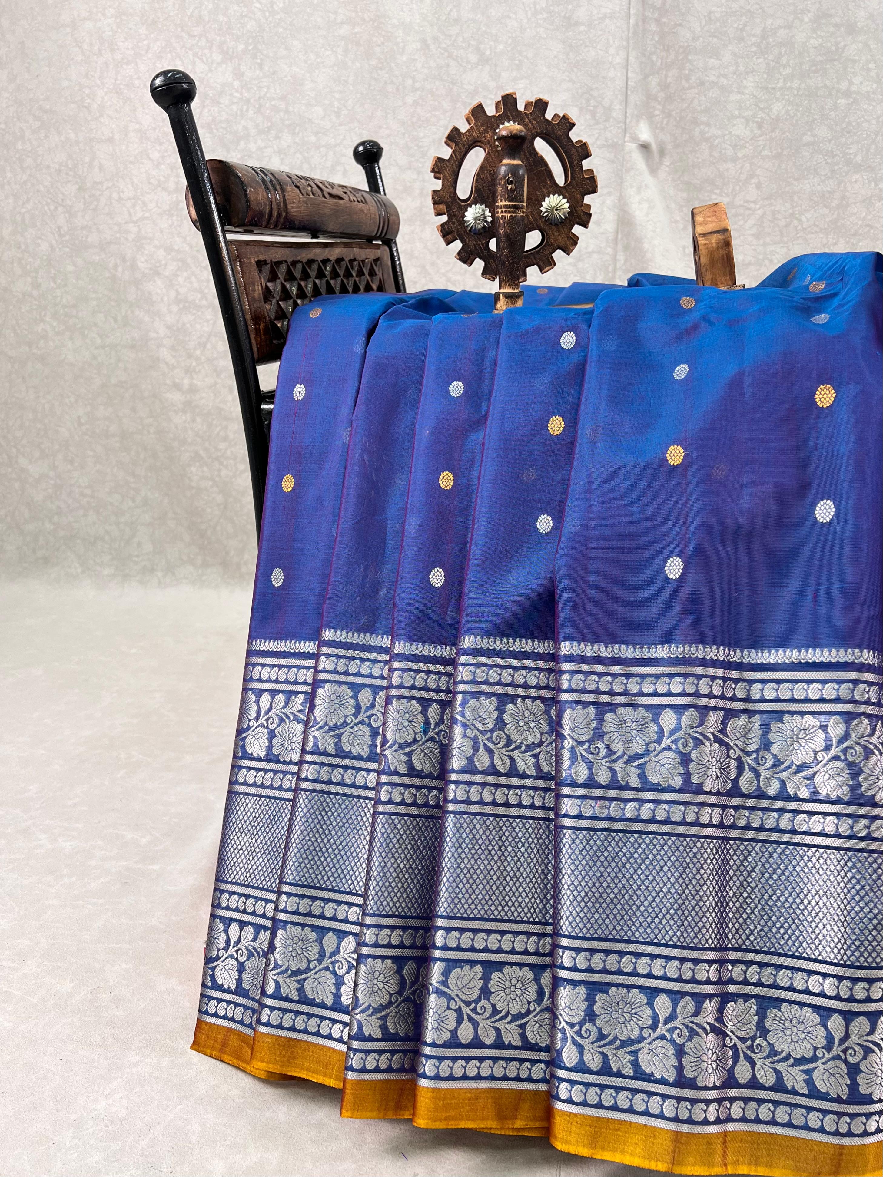 This elegant Gadwal Pure Cotton Silk Handloom Saree features a vibrant dual shade Rama blue body adorned with delicate gold and silver buttas, creating a timeless charm. The rich border and pallu are intricately woven with floral silver zari work with Light yellow selvedge, and this saree comes with Self blouse giving it a graceful and traditional look. Lightweight and breathable, it is perfect for festive occasions and summer functions.
