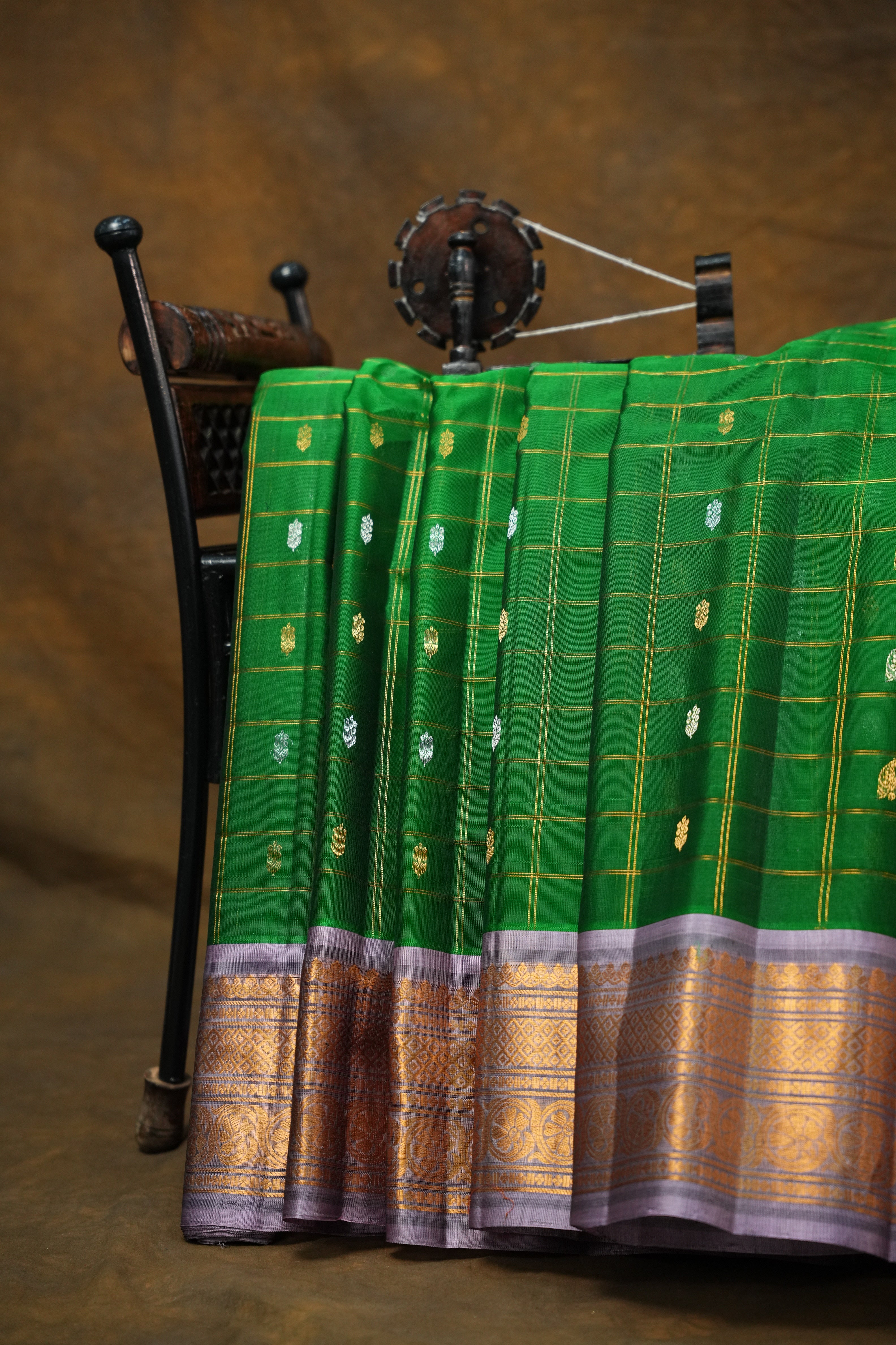 This elegant Gadwal Cotton Silk (Sico) Saree features a refreshing Bottle green body adorned with subtle Gold zari checks with gold and silver buttas, exuding timeless grace. The Lavender border is beautifully enriched with Gold zari detailing, adding a vibrant touch of tradition. Perfect for festive occasions or elegant gatherings, this saree blends the softness of silk with the comfort of cotton a true handloom masterpiece from Gadwal. Comes with contrast blouse