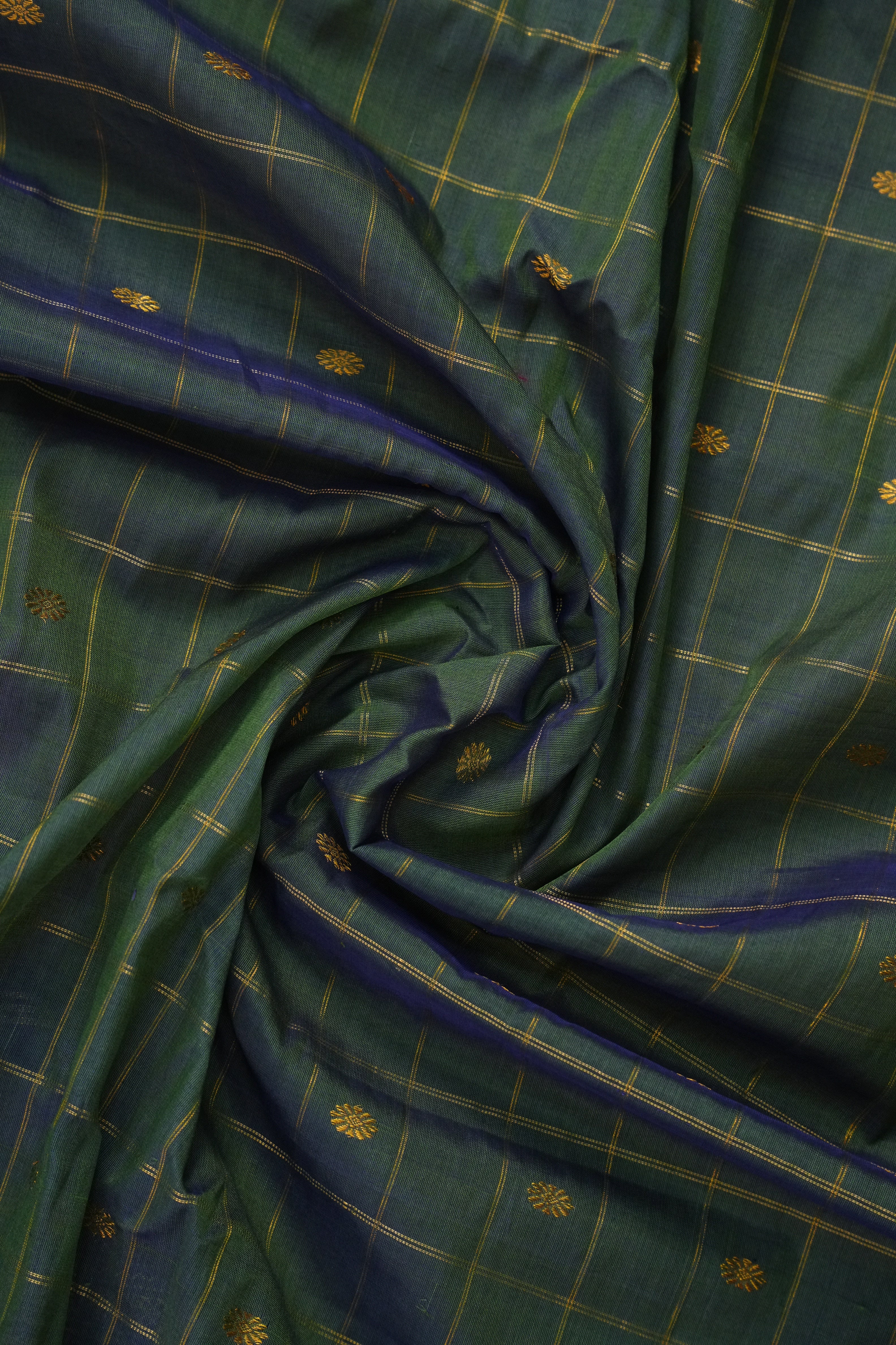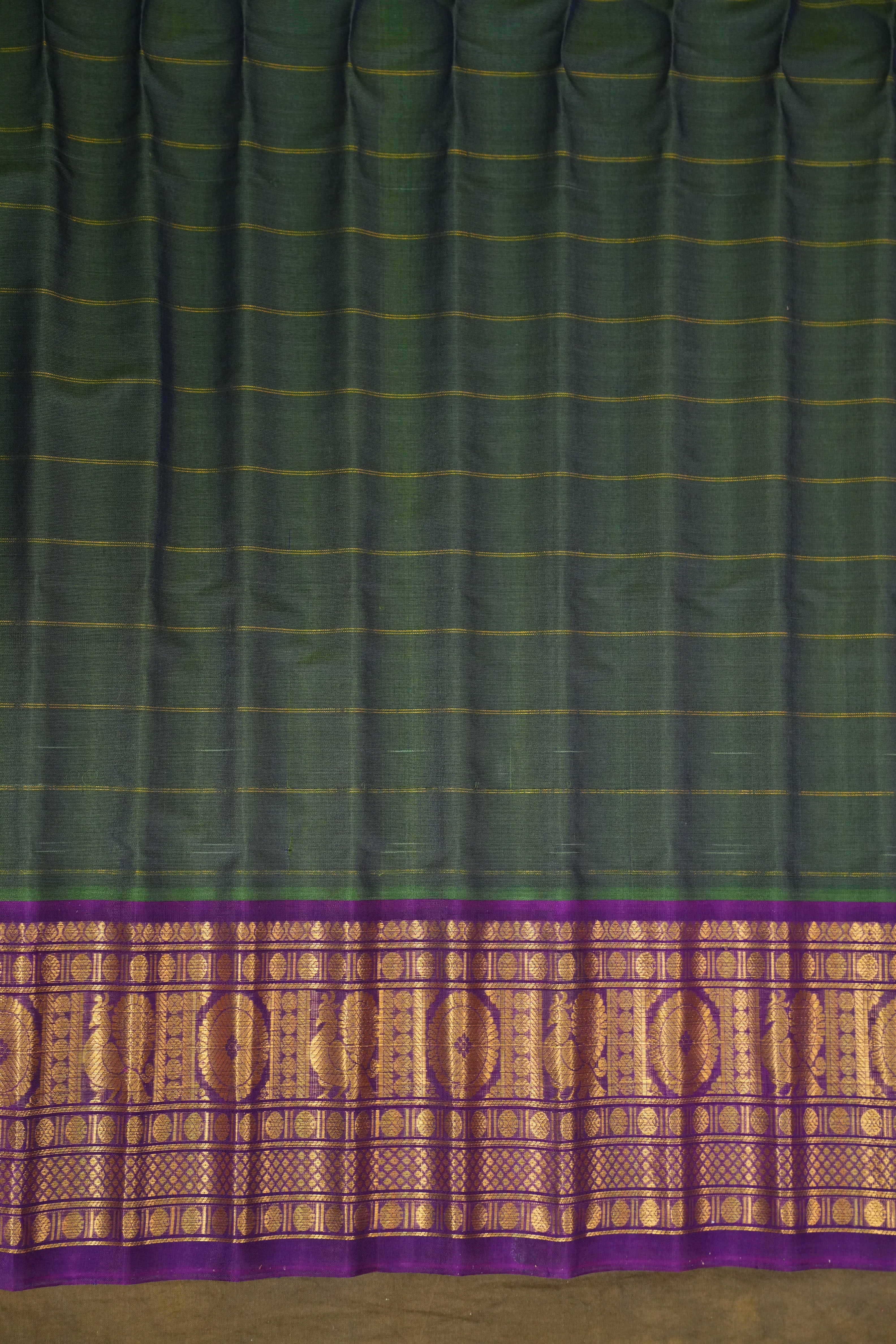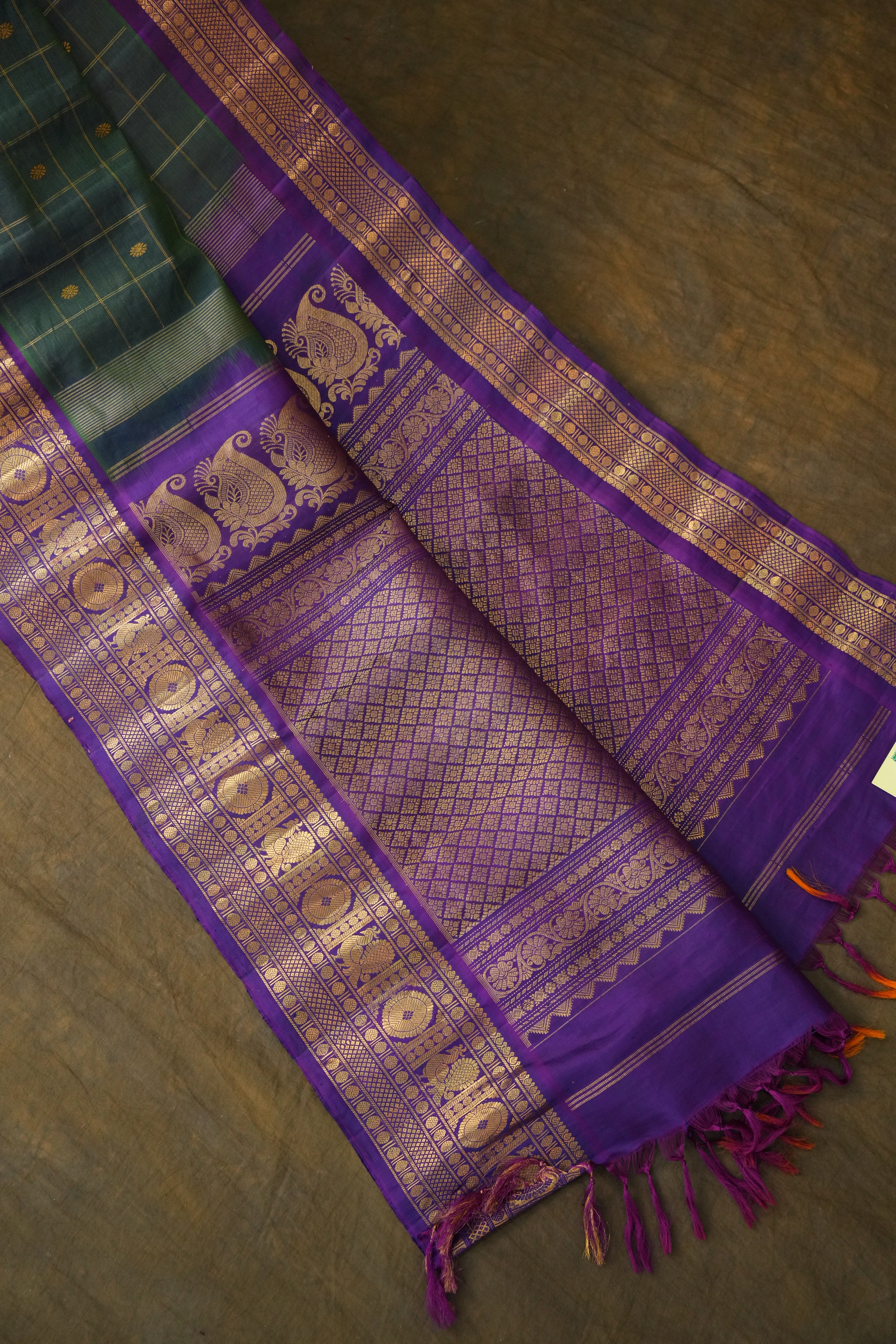 This elegant Gadwal Cotton Silk (Sico) Saree features a refreshing Rama Green body adorned with subtle Gold zari checks with gold buttas, exuding timeless grace. The Dark Purple border is beautifully enriched with Gold zari detailing, adding a vibrant touch of tradition. Perfect for festive occasions or elegant gatherings, this saree blends the softness of silk with the comfort of cotton a true handloom masterpiece from Gadwal. Comes with contrast blouse.