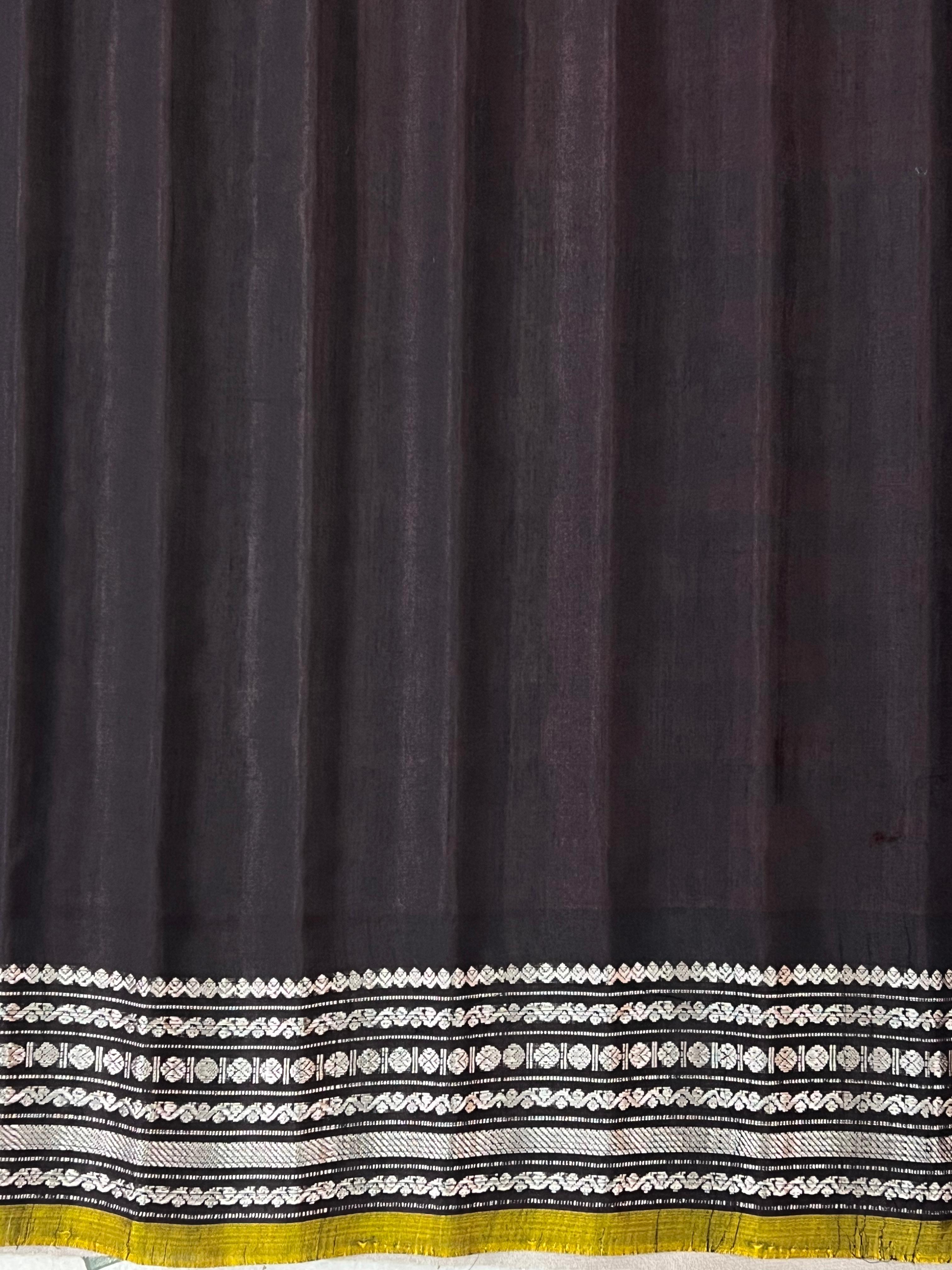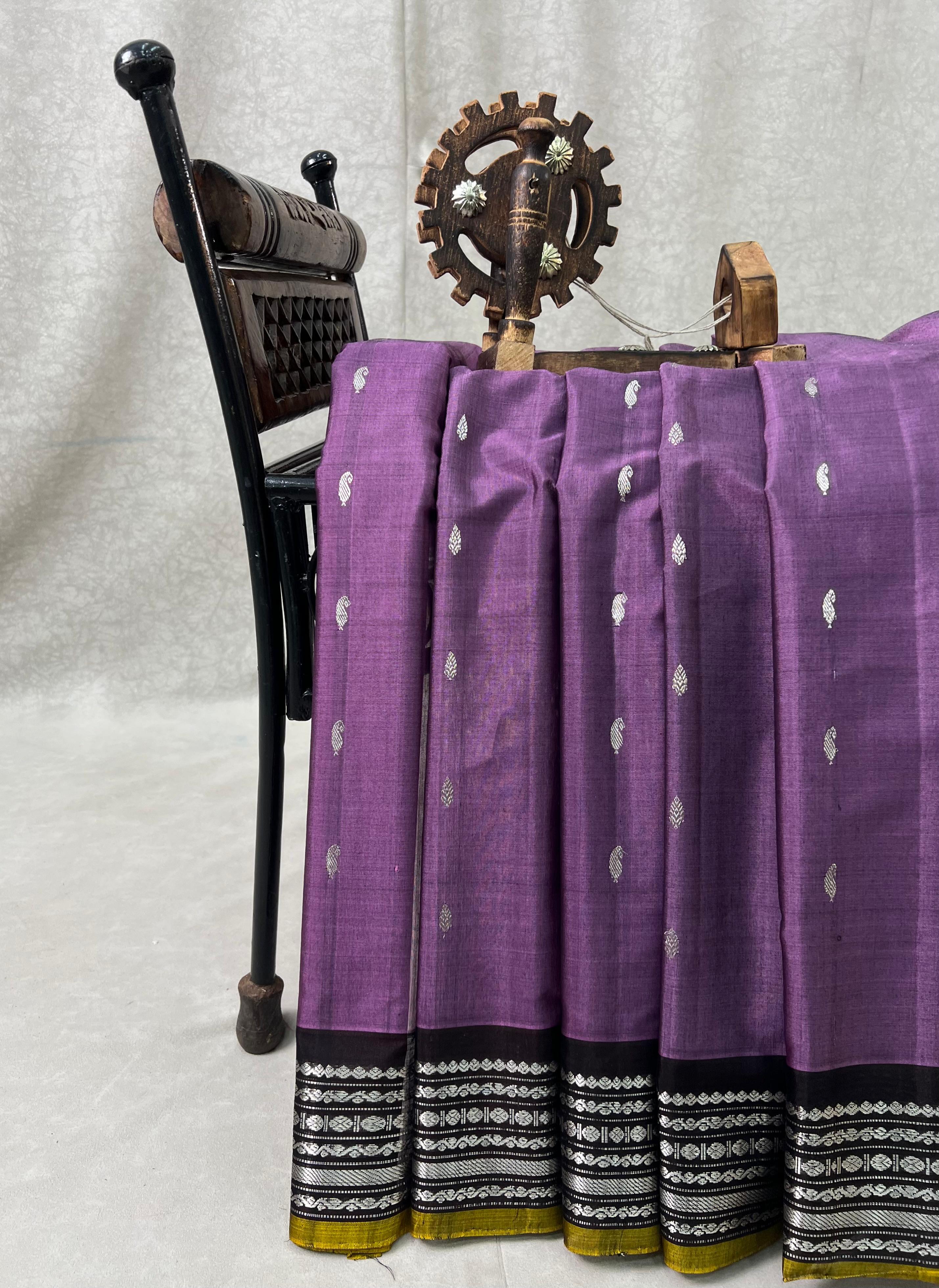 This elegant Gadwal Cotton Silk (Sico) Saree features a refreshing dusty purple body adorned with subtle zari buttas, exuding timeless grace. The coffee brown border is beautifully enriched with silver zari motifs and striking stripes with yellow selvedge, adding a vibrant touch of tradition. Perfect for festive occasions or elegant gatherings, this saree blends the softness of silk with the comfort of cotton — a true handloom masterpiece from Gadwal. Comes with contrast blouse.
