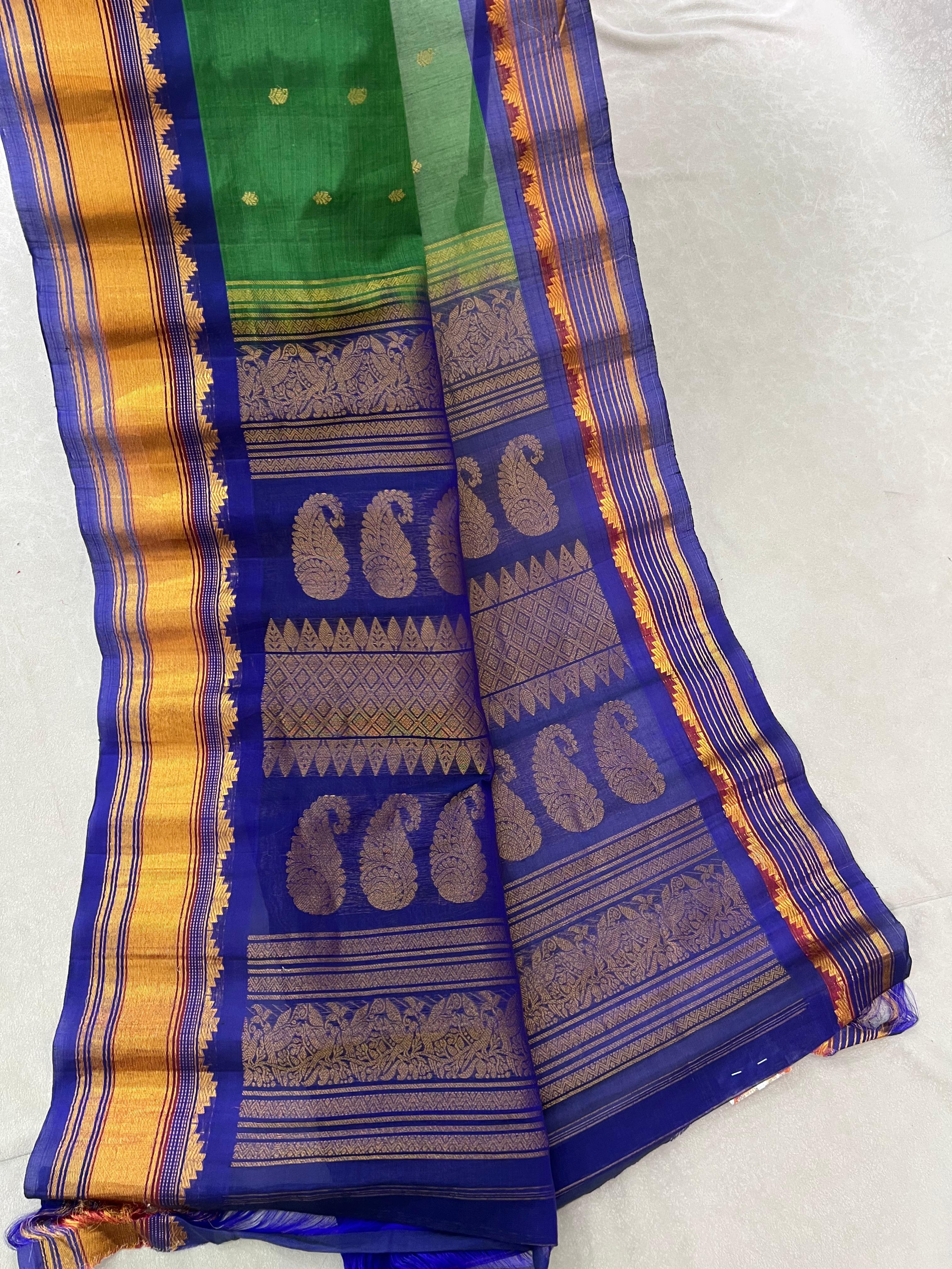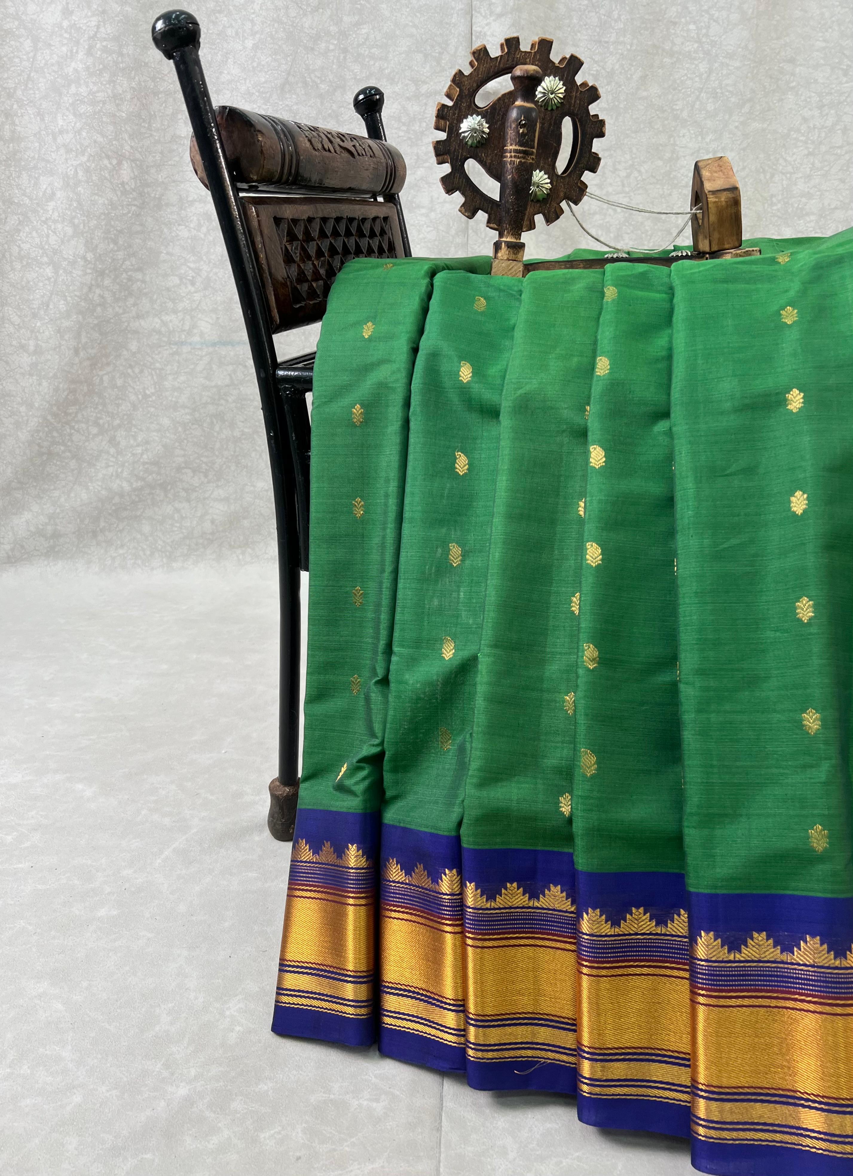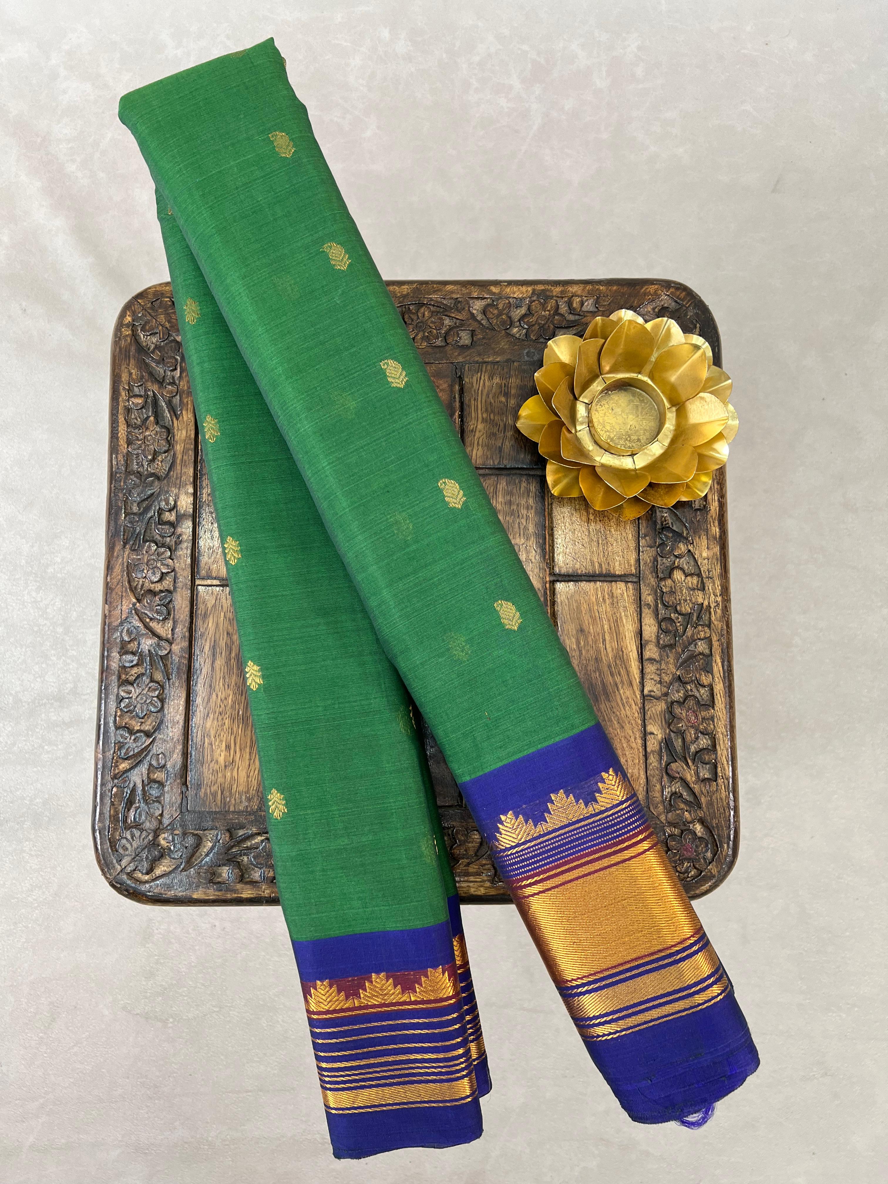 This elegant Gadwal Cotton Silk (Sico) Saree features a refreshing leaf green body adorned with subtle zari buttas, exuding timeless grace. The blue border is beautifully enriched with gold zari motifs and striking stripes, adding a vibrant touch of tradition. Perfect for festive occasions or elegant gatherings, this saree blends the softness of silk with the comfort of cotton — a true handloom masterpiece from Gadwal. Comes with contrast blouse.