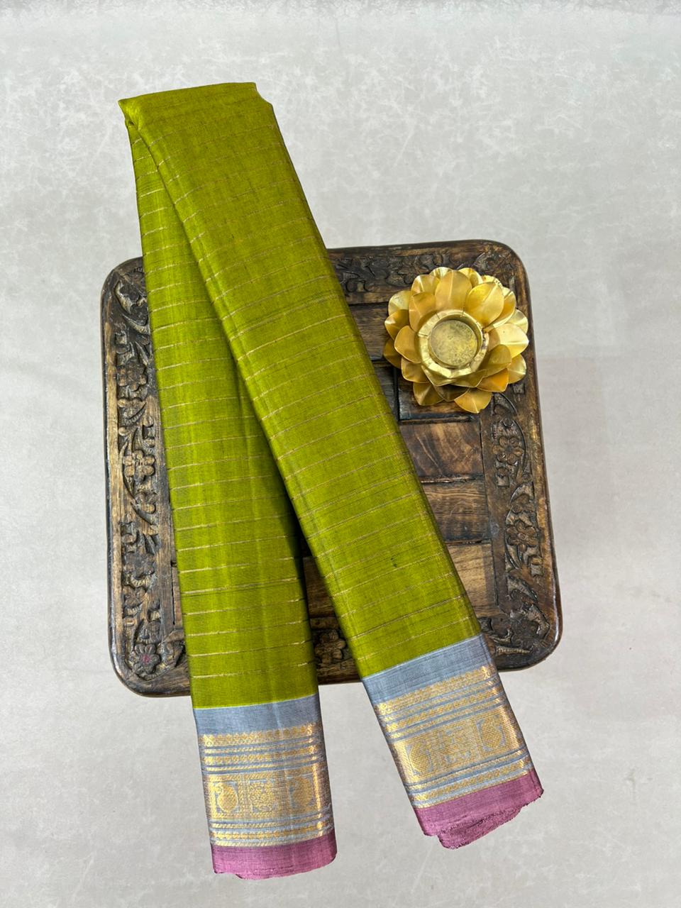 This elegant Gadwal Cotton Silk (Sico) Saree features a refreshing Mehendi body adorned with subtle thin gold horizontal stripes, exuding timeless grace. The Grey border is beautifully enriched and striking golden zari work with Babypink selvedge, adding a vibrant touch of tradition. Perfect for festive occasions or elegant gatherings, this saree blends the softness of silk with the comfort of cotton - a true handloom masterpiece from Gadwal. Comes with without blouse