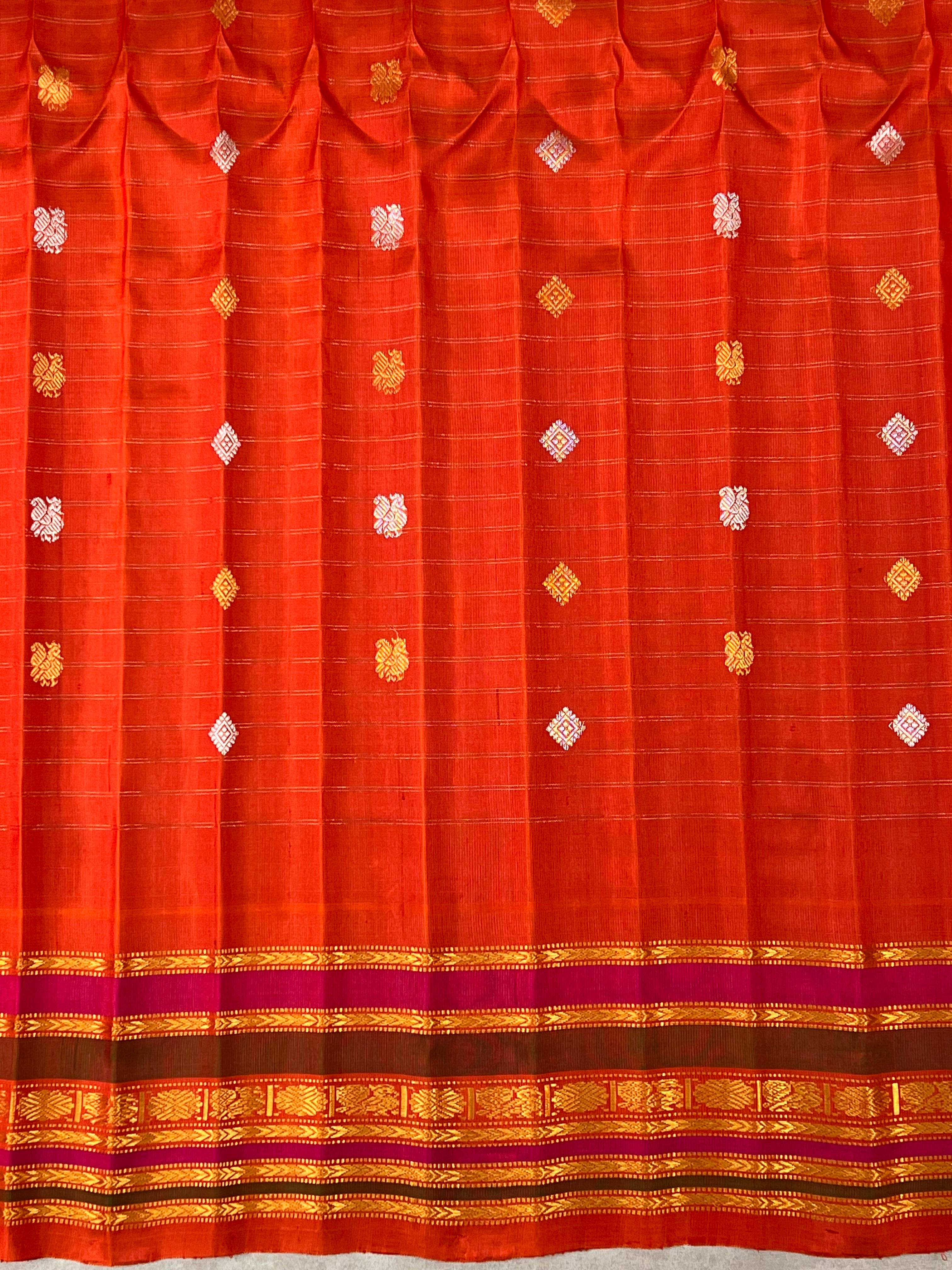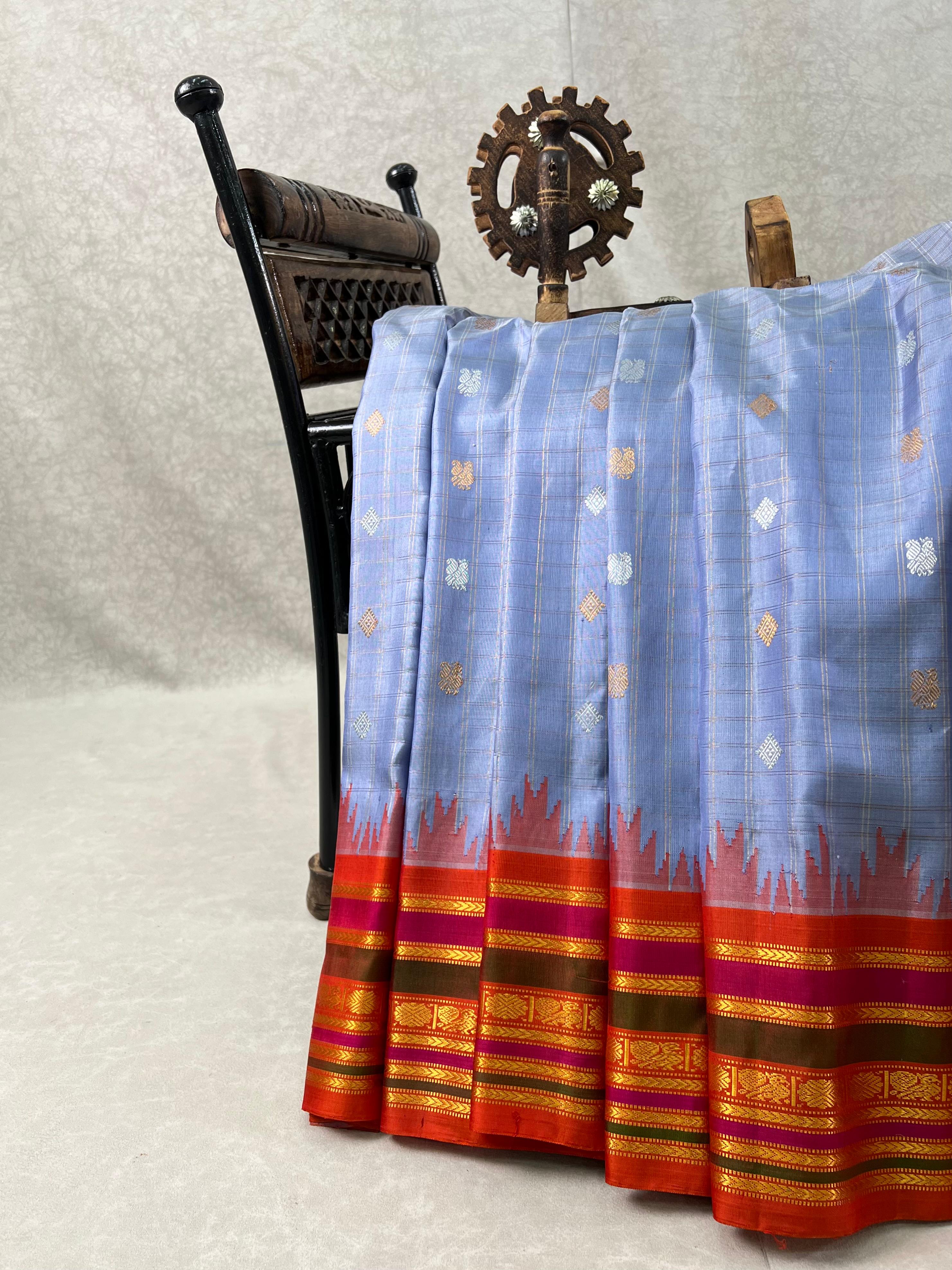 This elegant Gadwal Pure Silk Multicolor Border Saree, features a refreshing Cool Grey body and gold zari checks adorned with subtle Silver and Gold zari buttas, exuding timeless grace. The Red Orange border is beautifully enriched with Gold zari Detailing and striking multicolour stripes, adding a vibrant touch of tradition. Perfect for festive occasions or elegant gatherings, this saree blends the softness of silk with the comfort of cotton - a true handloom masterpiece from Gadwal, this saree comes with contrast blouse, and it is Silk mark certified.