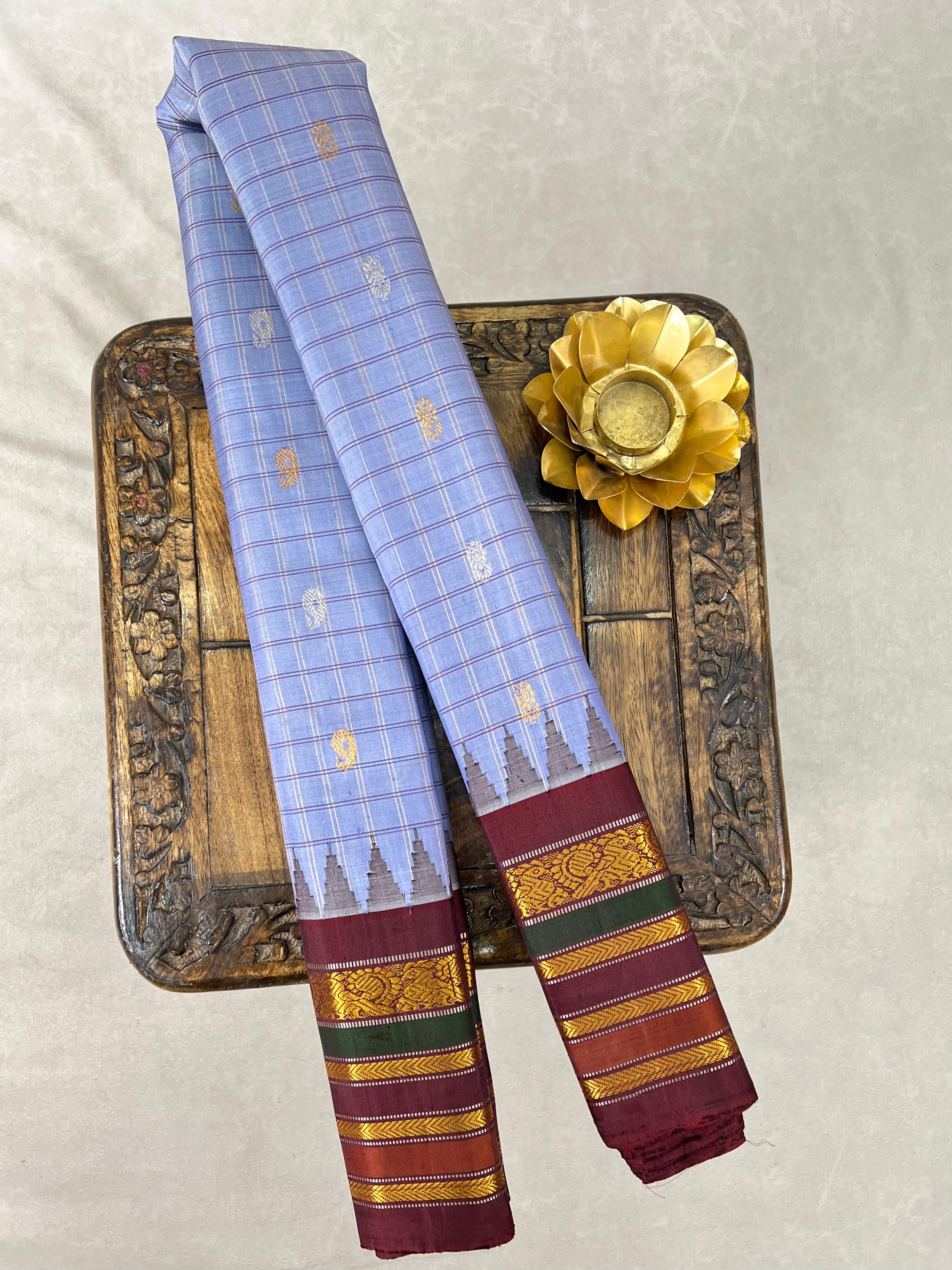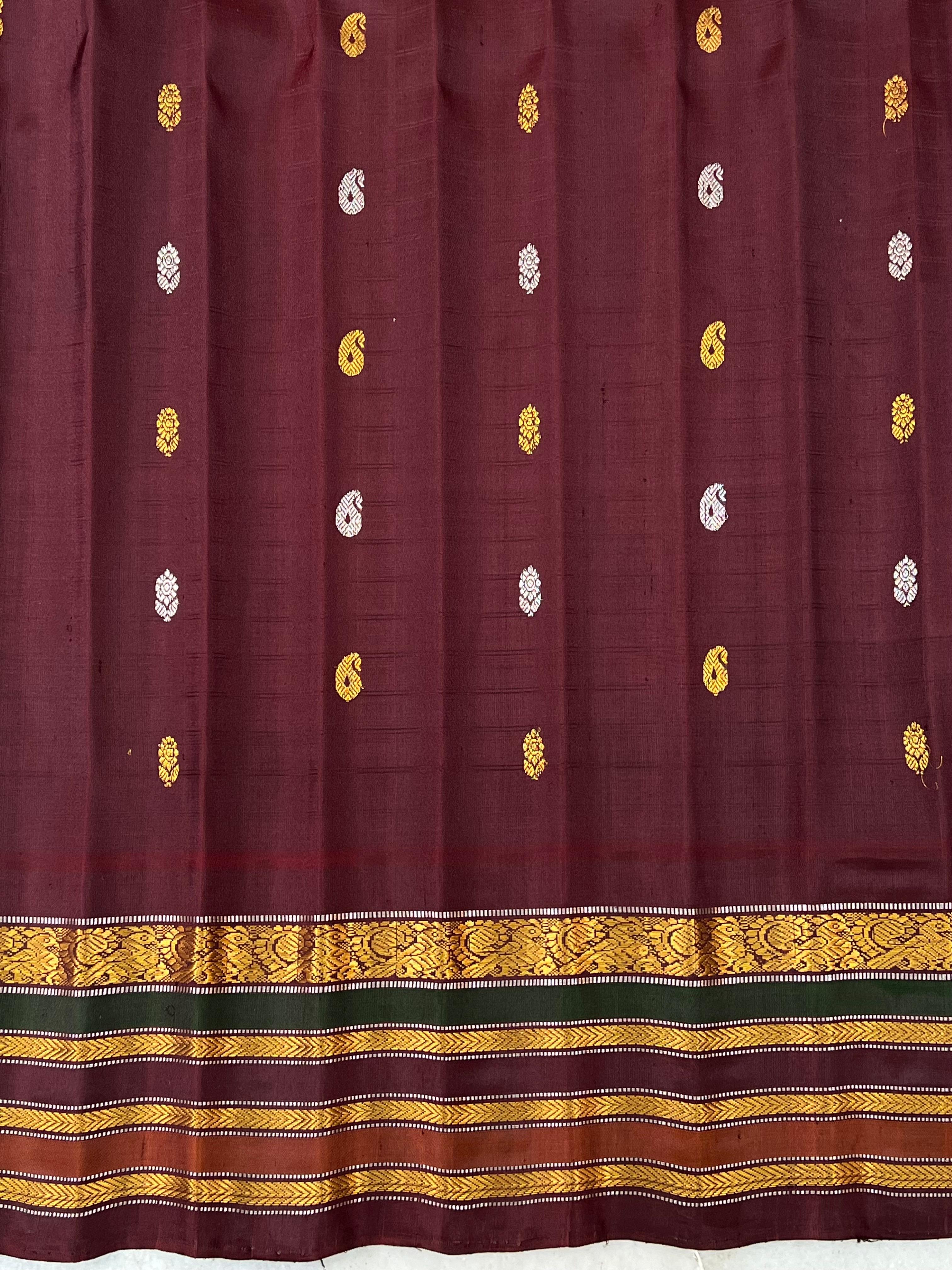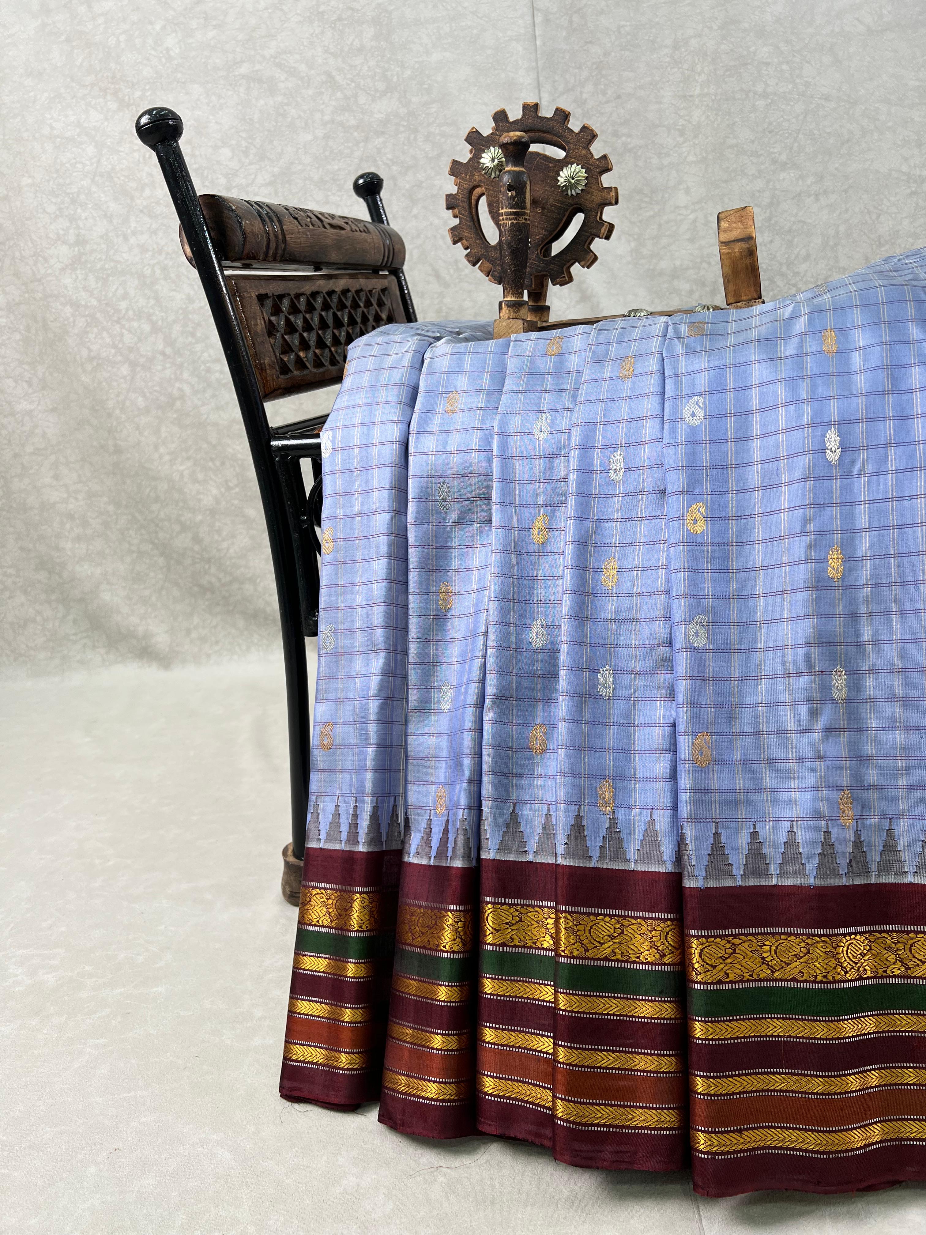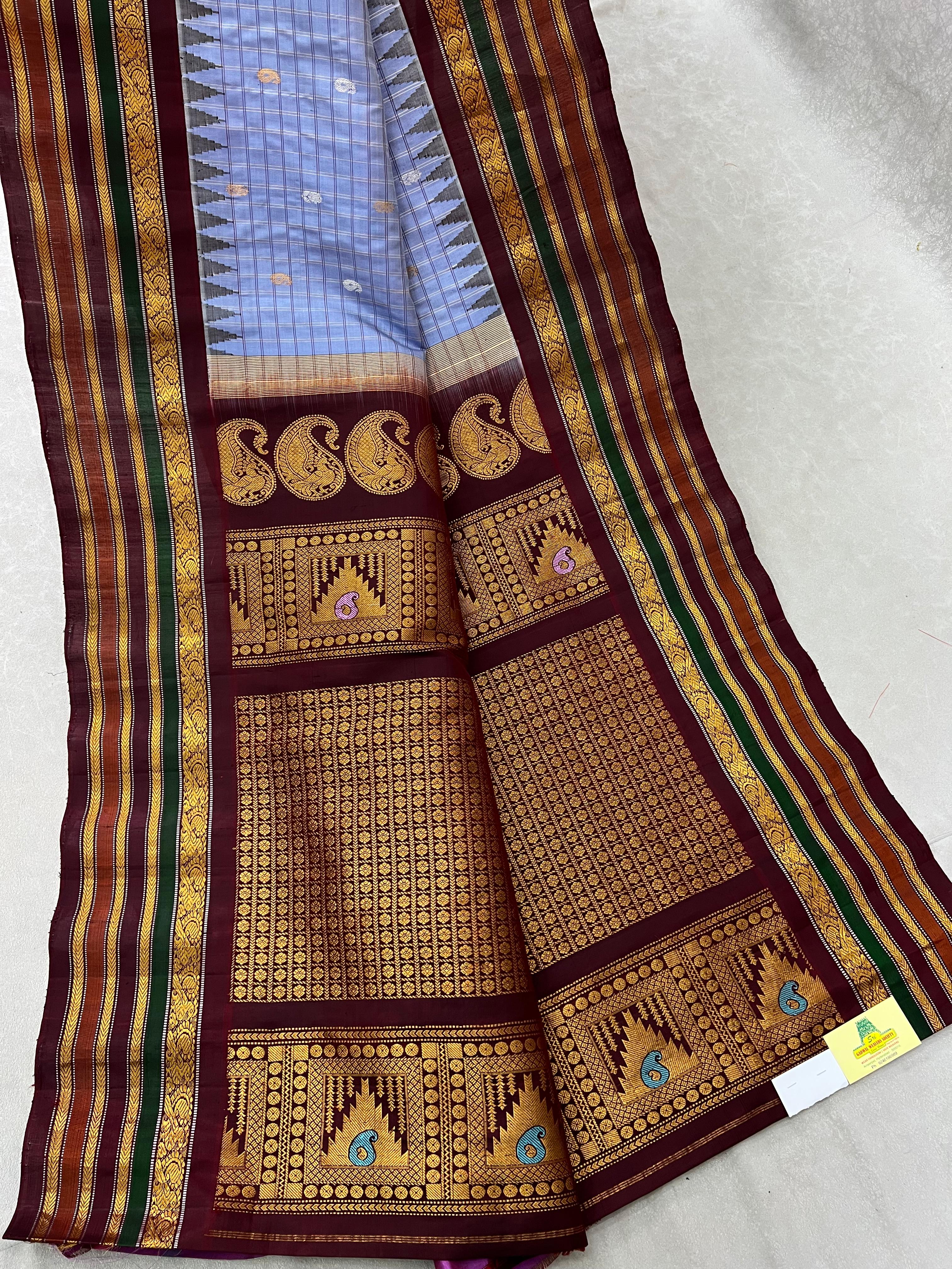 This elegant Gadwal Pure Silk Multicolor Border Saree features a refreshing cool grey body with gold zari and thread checks adorned with subtle silver and gold zari buttas, exuding timeless grace. The dark chocolate border is beautifully enriched with gold and silver zari detailing and striking multicolour stripes, adding a vibrant touch of tradition. This saree’s meenakari buttas on the pallu are a special attraction. Perfect for festive occasions or elegant gatherings, this saree blends the softness of silk with the comfort of cotton-a true handloom masterpiece from Gadwal. It comes with a contrast blouse and is Silk Mark certified.