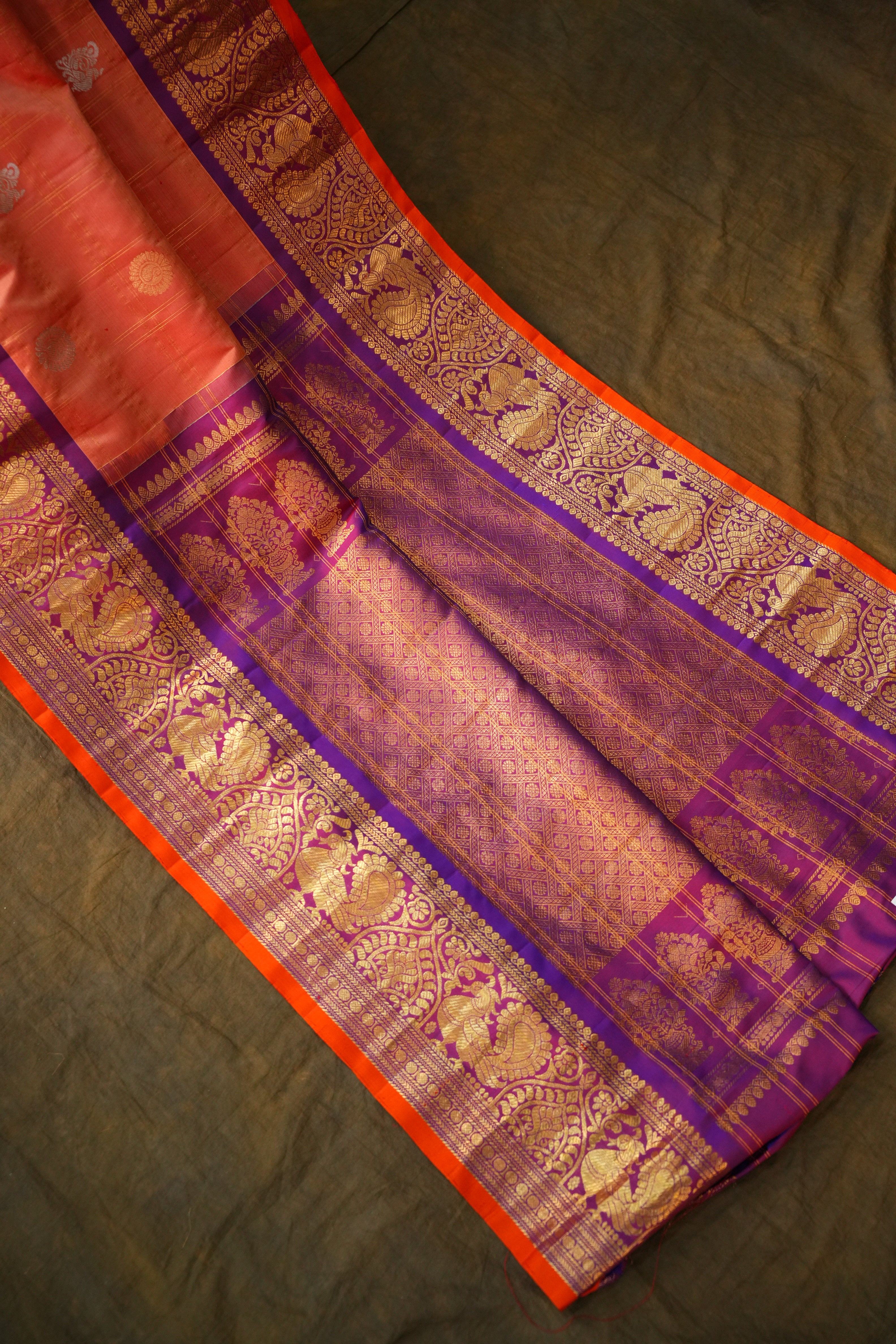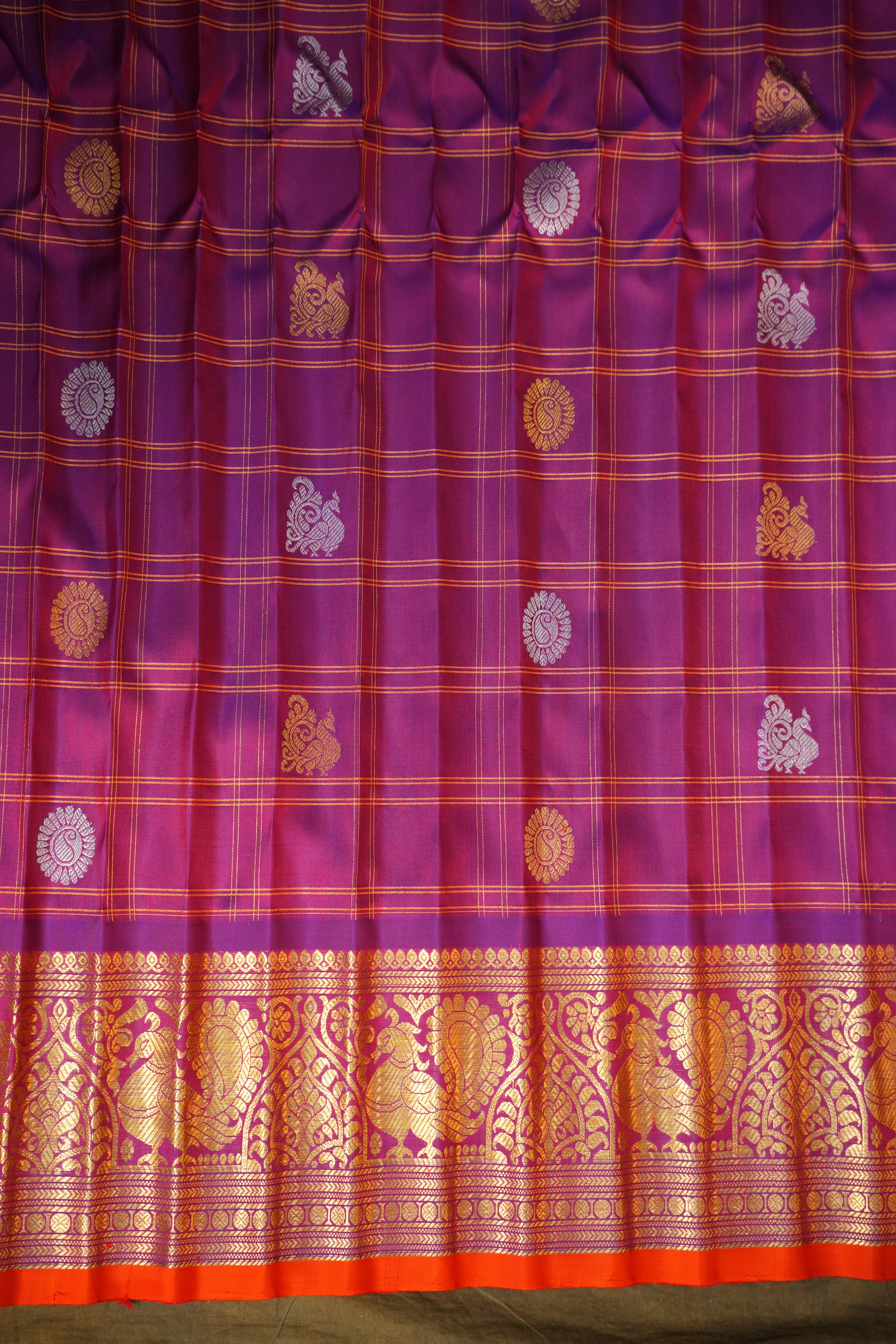 This Exclusive Gadwal Pure Big Checks Silk Handloom Saree showcases a Peach body woven with fine gold zari checks, highlighted with elegant gold and silver buttas that add a graceful sheen. The saree is beautifully contrasted by a Purple border and comes with orange selvedge, intricately crafted with traditional Floral motifs in shimmering gold zari, reflecting the timeless heritage of Gadwal handloom artistry. This saree comes with contrast blouse and it is Silk mark certified