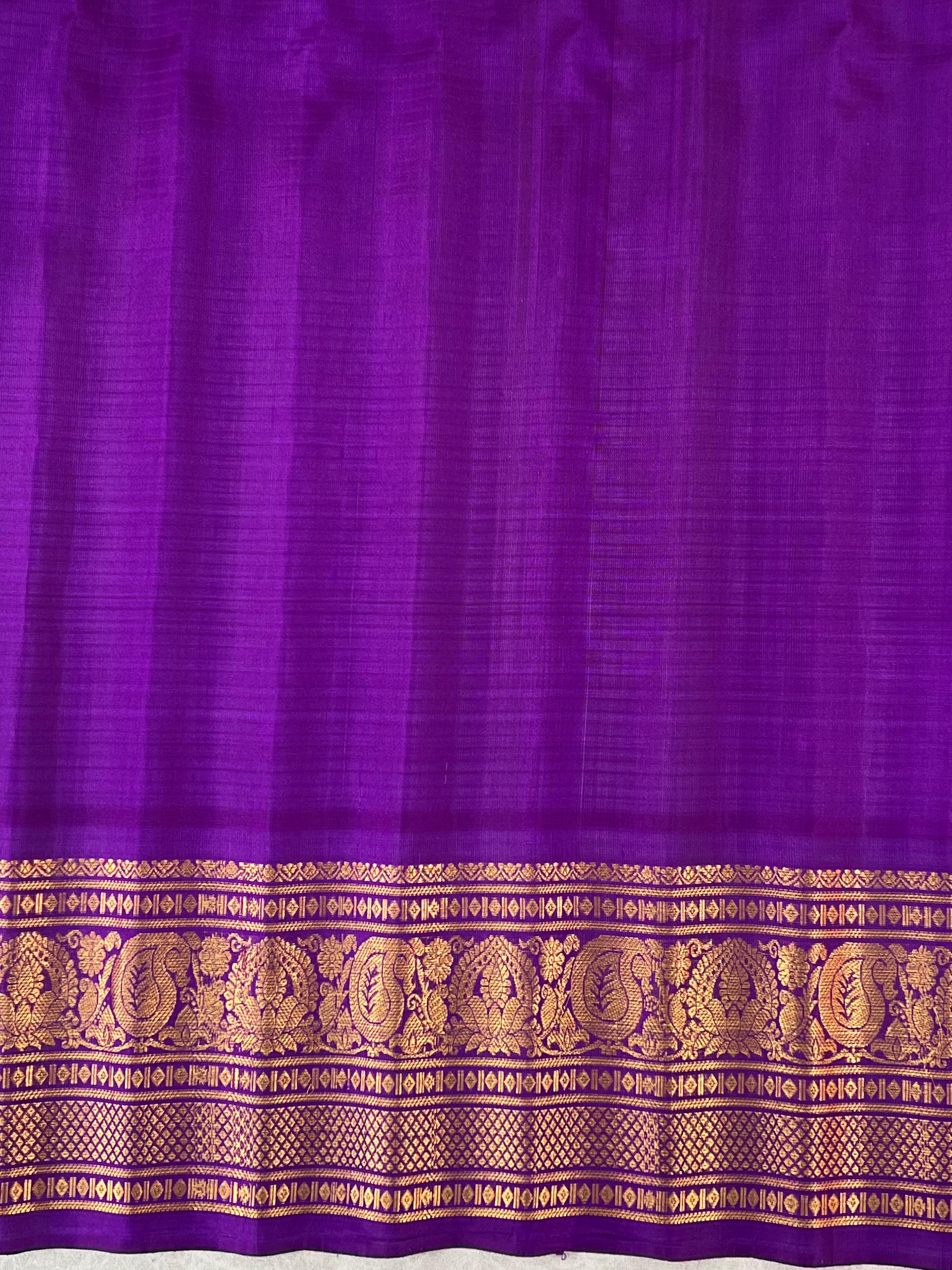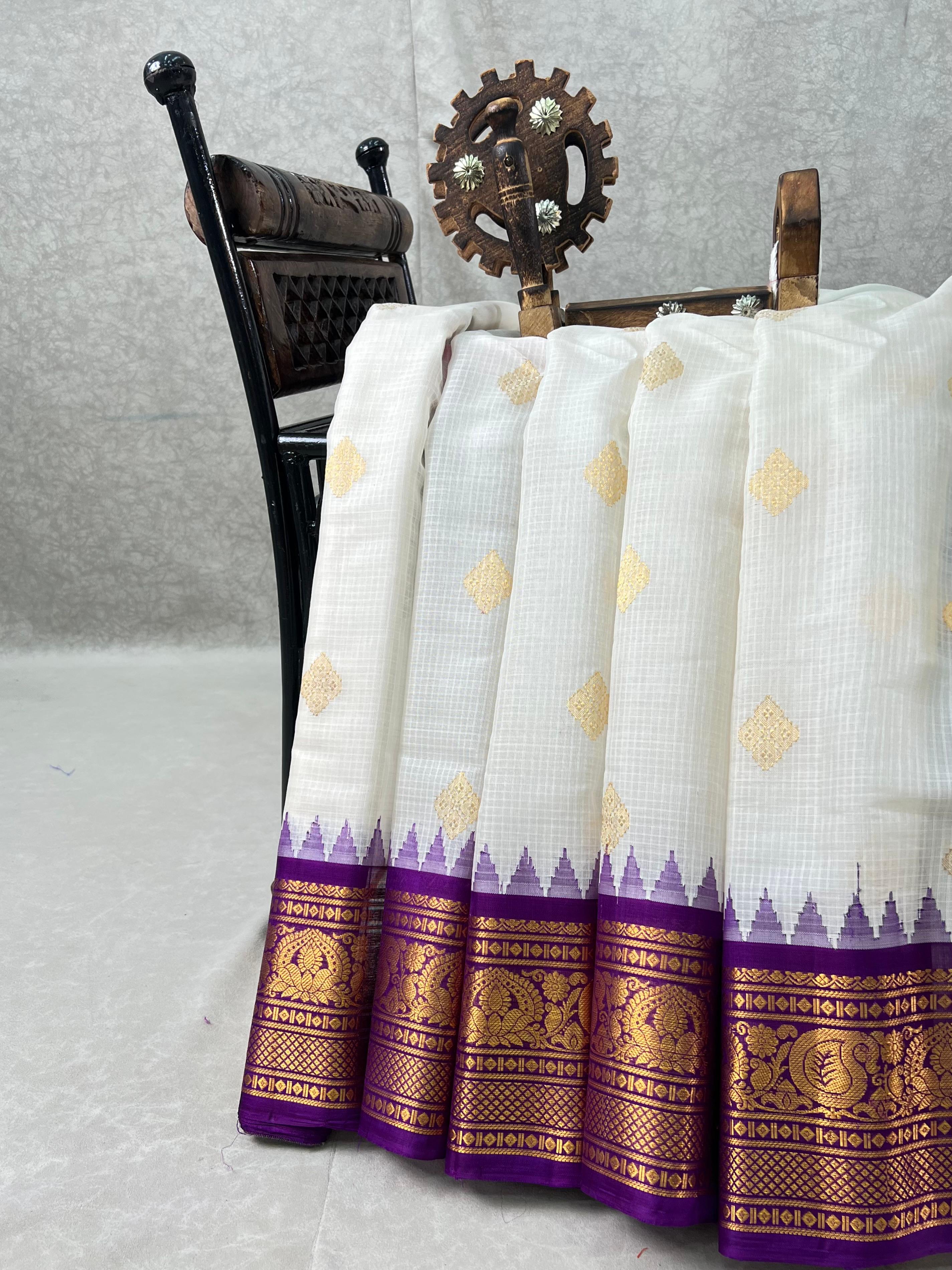 This elegant Gadwal Cotton Silk (Sico) Handloom Saree features a refreshing White body adorned with subtle Gold zari buttas, exuding timeless grace. The Purple border is beautifully enriched with Gold zari detailing, adding a vibrant touch of tradition. Perfect for festive occasions or elegant gatherings, this saree blends the softness of silk with the comfort of Silk cotton a true handloom masterpiece from Gadwal. Comes with Self blouse.