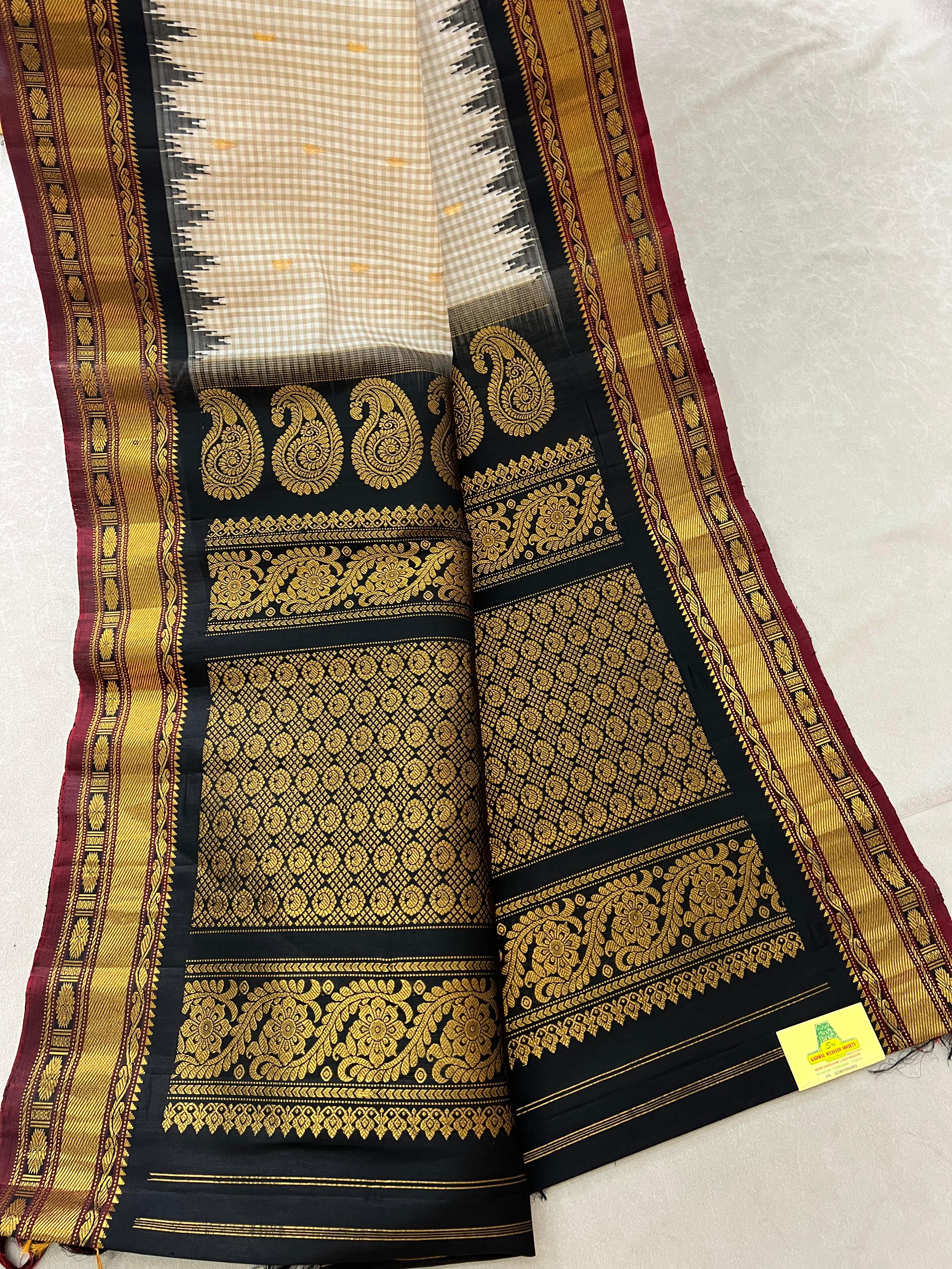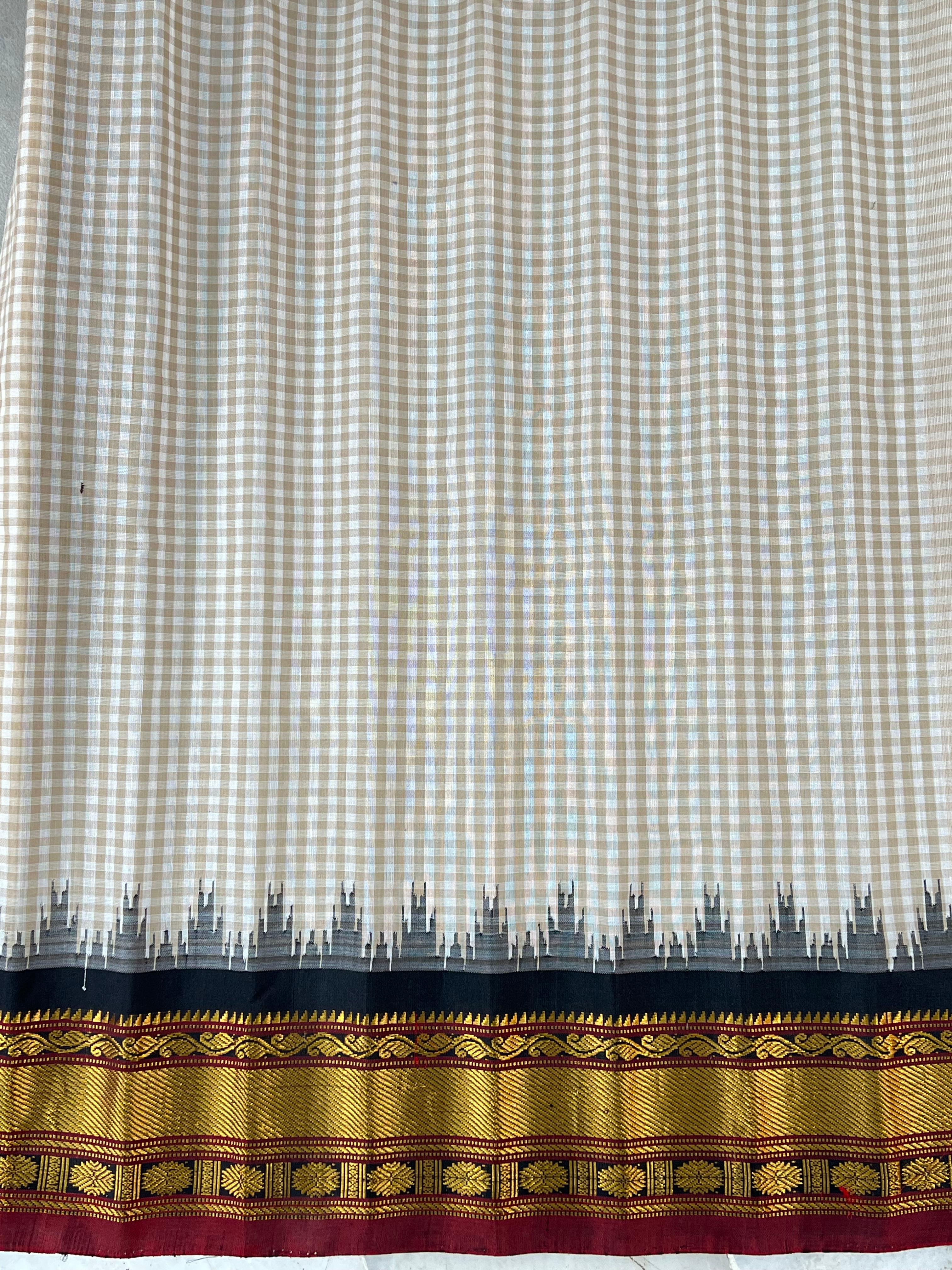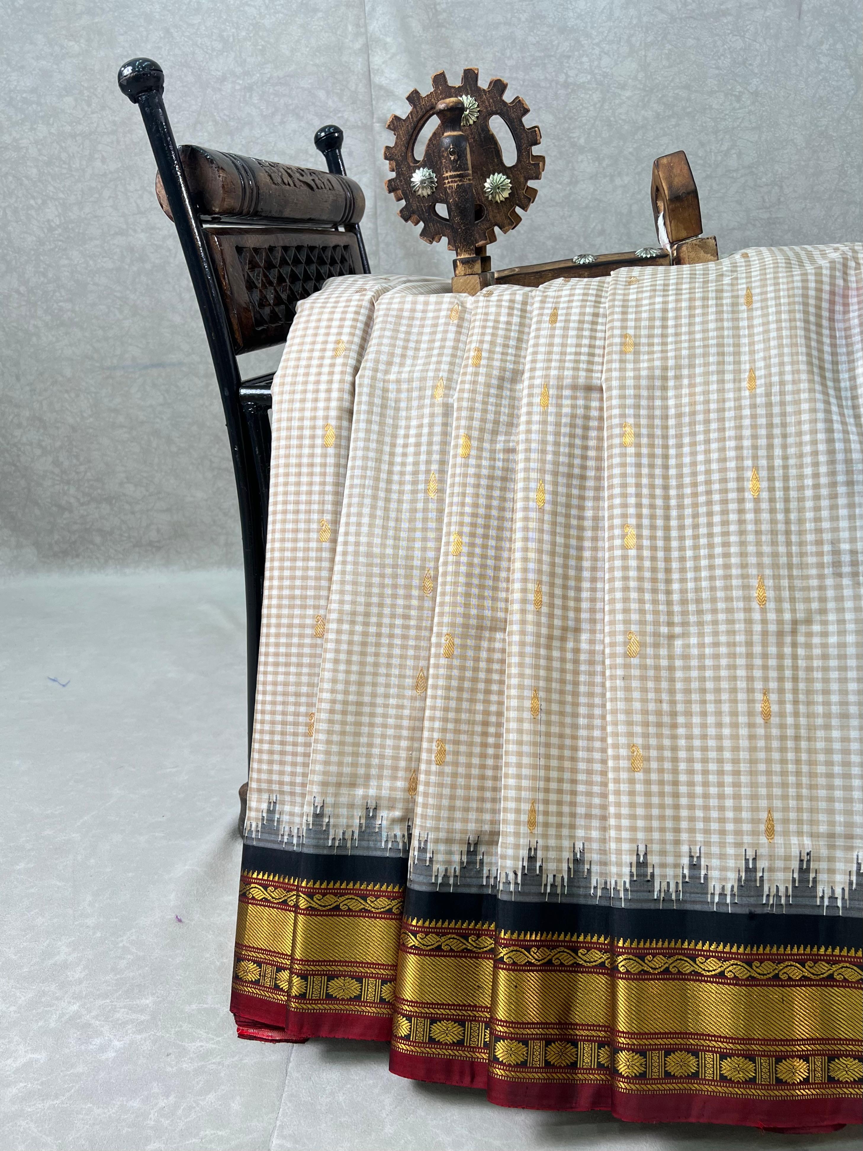 This elegant Gadwal Cotton Silk (Sico) Handloom Saree features a refreshing Beige and white checks body adorned with subtle Gold zari buttas, exuding timeless grace. The Black border is beautifully enriched with Gold zari and maroon stripes detailing and comes with maroon selvedge, adding a vibrant touch of tradition. Perfect for festive occasions or elegant gatherings, this saree blends the softness of silk with the comfort of Silk cotton a true handloom masterpiece from Gadwal. Comes with Self blouse.