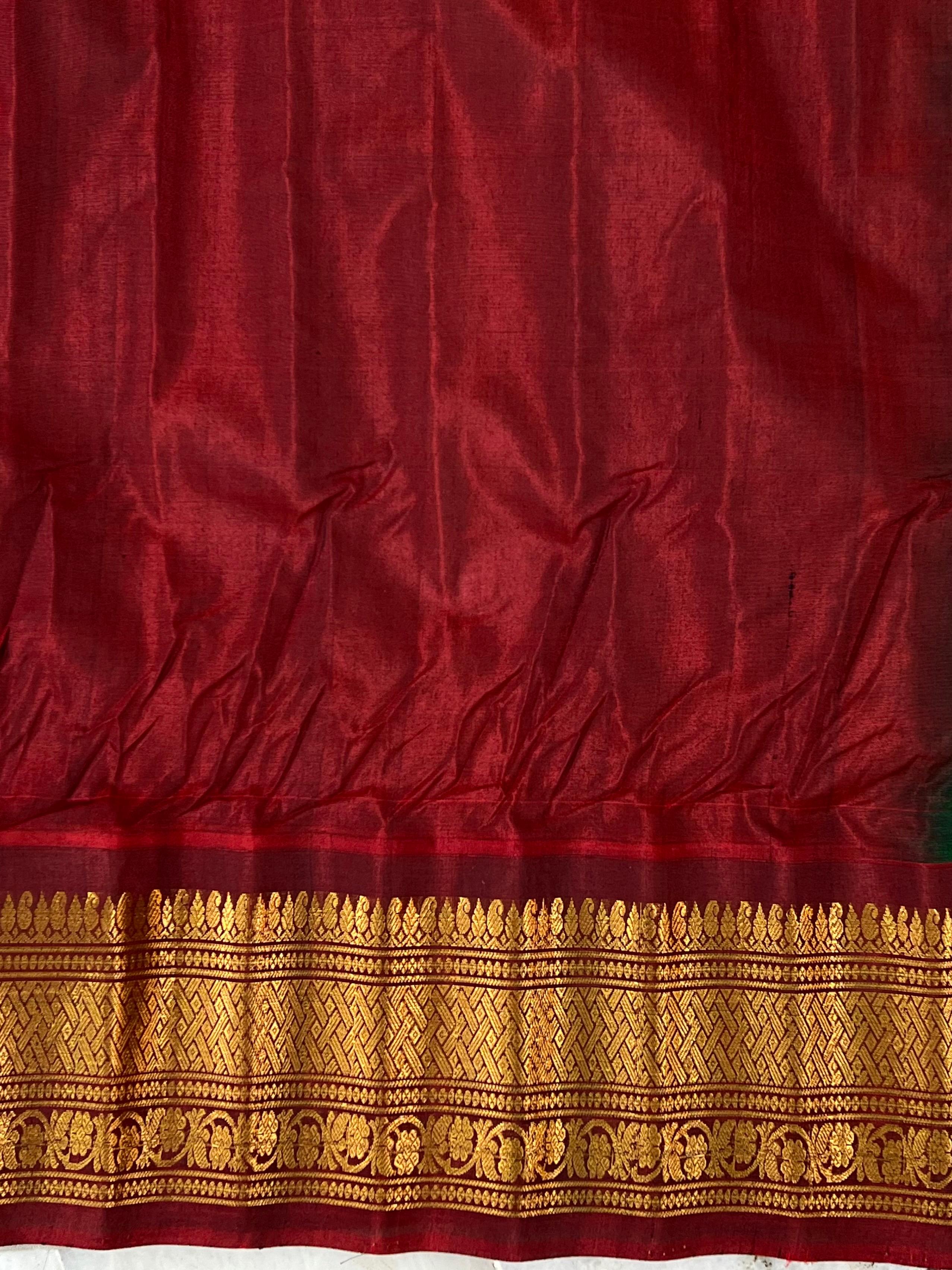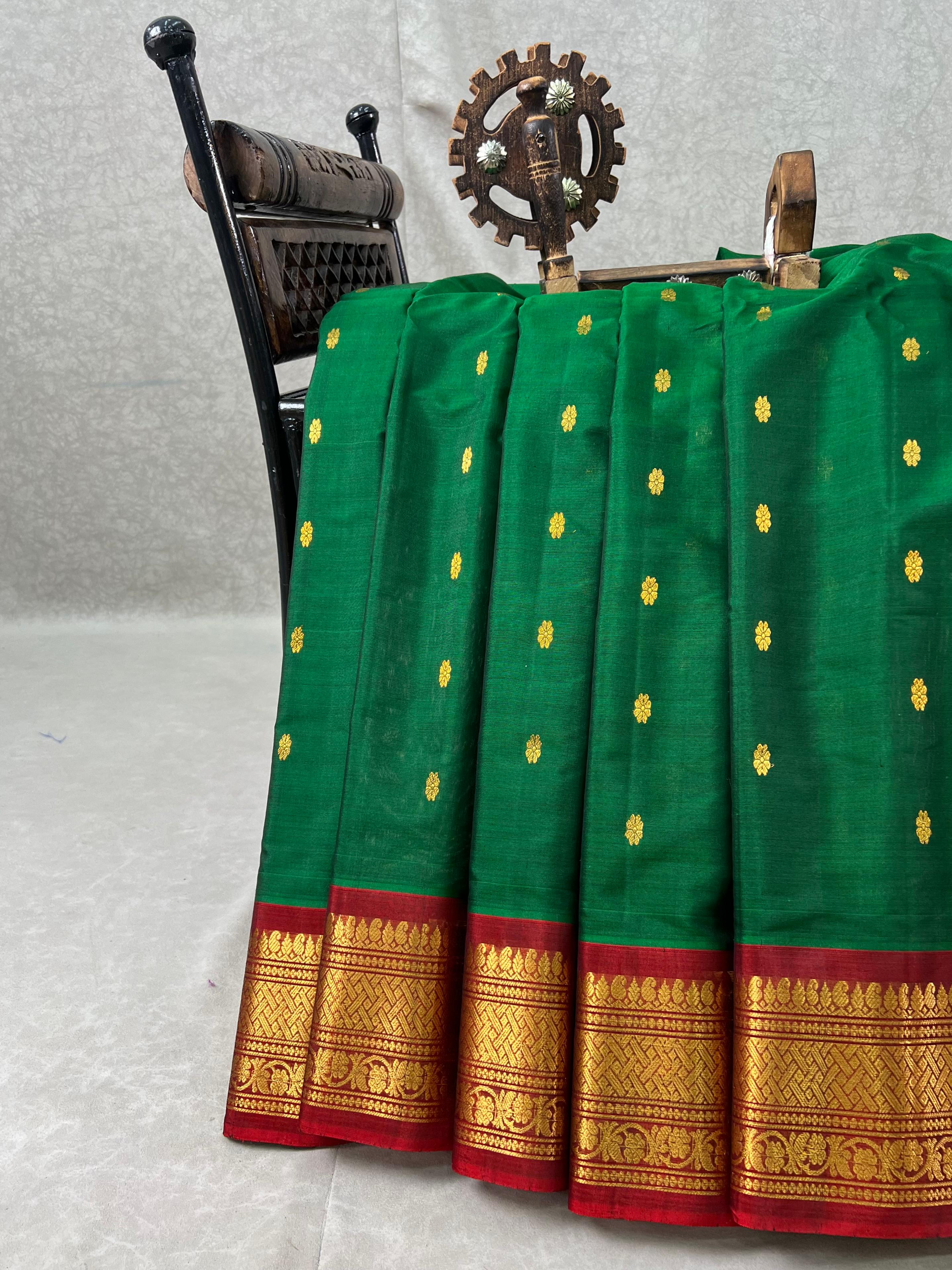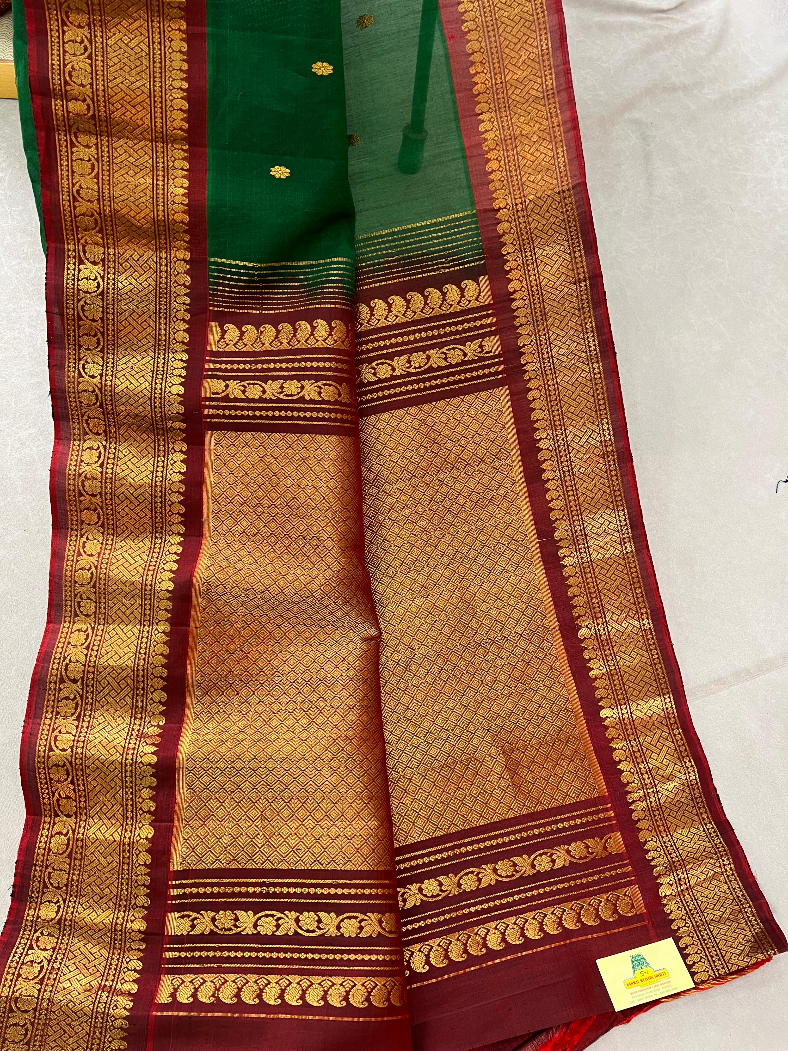This elegant Gadwal Cotton Silk (Sico) Handloom Saree features a refreshing Dark green body adorned with subtle Gold zari buttas, exuding timeless grace. The Maroon border is beautifully enriched with Gold zari detailing, adding a vibrant touch of tradition. Perfect for festive occasions or elegant gatherings, this saree blends the softness of silk with the comfort of Silk cotton a true handloom masterpiece from Gadwal. Comes with Contrast blouse.