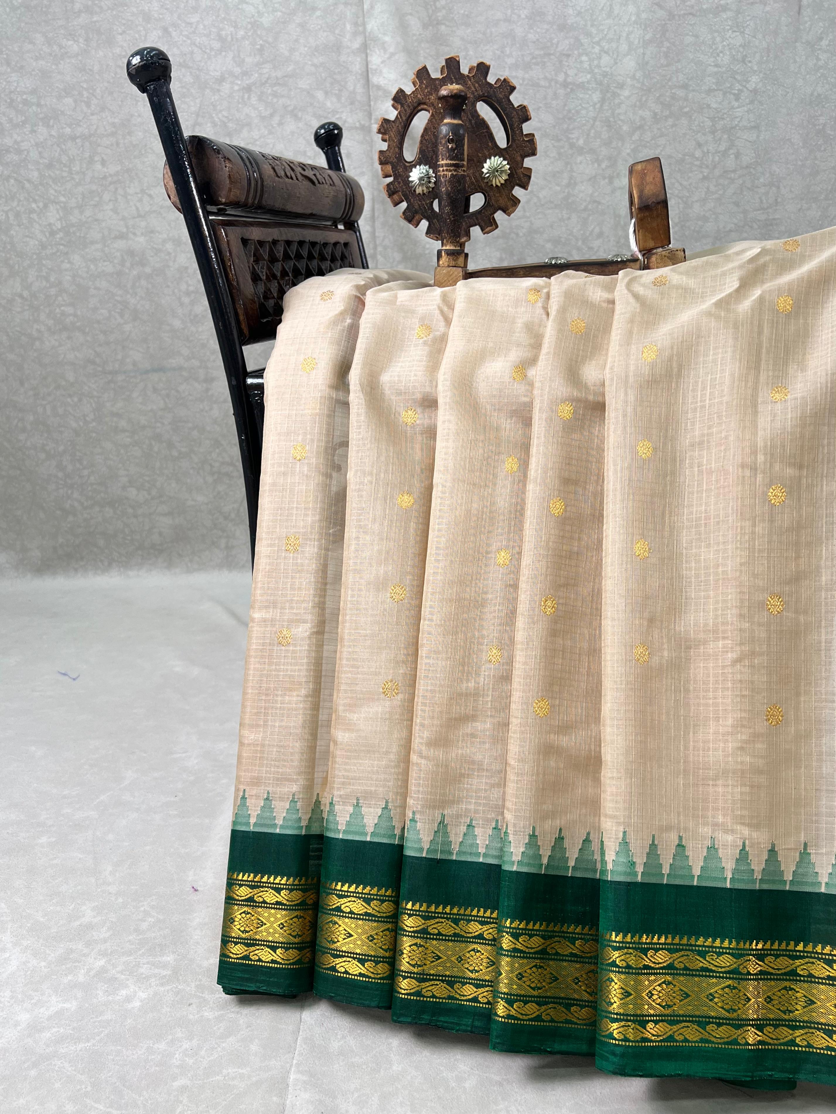 This elegant Gadwal Cotton Silk (Sico) Handloom Saree features a refreshing beige body adorned with subtle Gold zari buttas, exuding timeless grace. The green border is beautifully enriched with Gold zari detailing, adding a vibrant touch of tradition. Perfect for festive occasions or elegant gatherings, this saree blends the softness of silk with the comfort of Silk cotton a true handloom masterpiece from Gadwal. Comes with Self blouse.