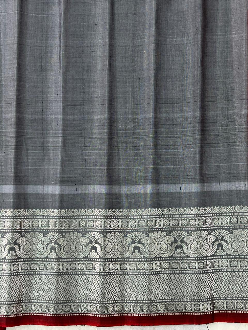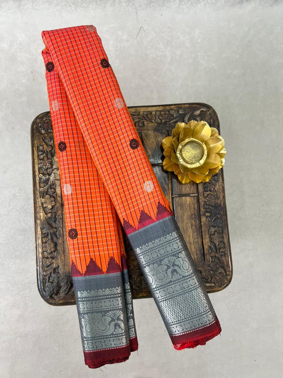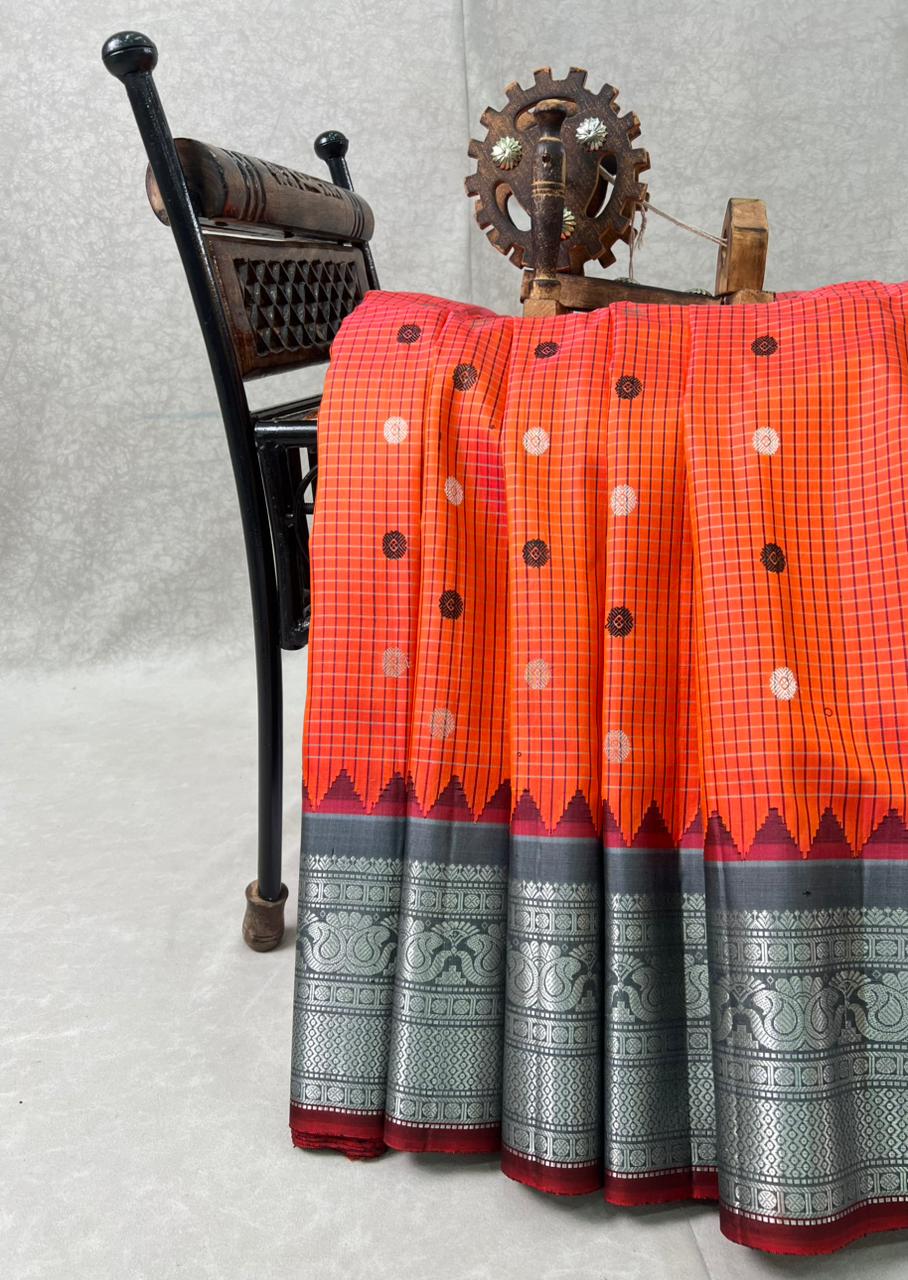 This exquisite dual shade pastel Orange-Red Gadwal silk saree is a masterpiece of traditional craftsmanship. Featuring delicate zari buttas across the body, it is elegantly paired with a rich contrast grey border and pallu with Red selvedge, adorned with intricate Silver Zari comes with a contrast blouse, making it a perfect choice for festive occasions and grand celebrations!. Silk Mark Certified.