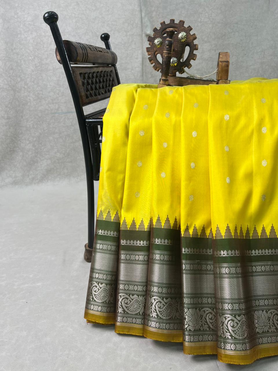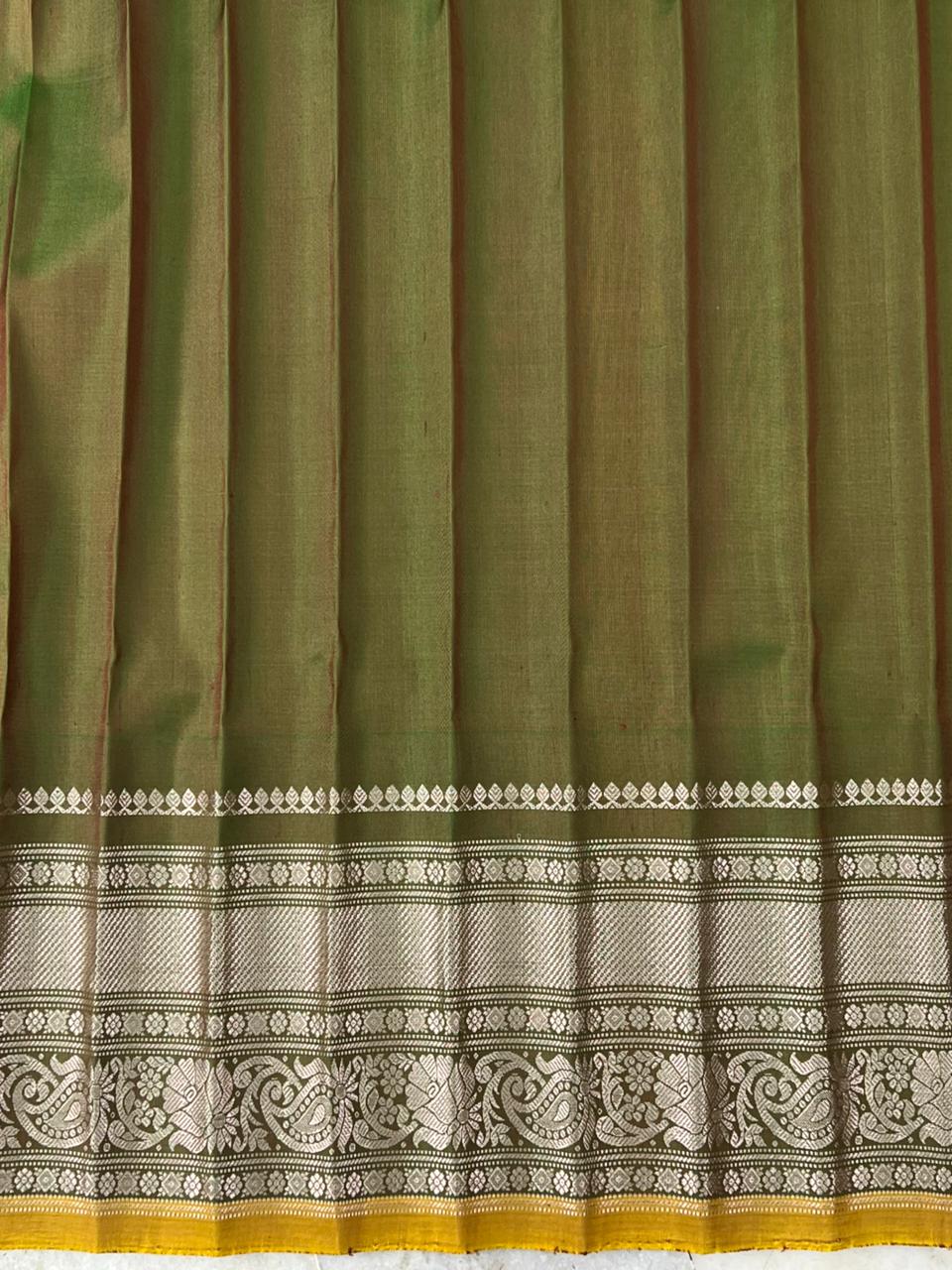 Elevate your wardrobe with this exquisite Pastal Olive Green with Lemon Yellow Gadwal Silk Saree, crafted to perfection for women who adore subtle elegance. The soft pastel body is beautifully adorned with Silver zari buttas, adding a graceful shimmer without overpowering the look. Yellow Selvedge, adorned with intricate comes with a contrast blouse, making it a perfect choice for festive occasions and grand celebrations!. Silk Mark Certified.
