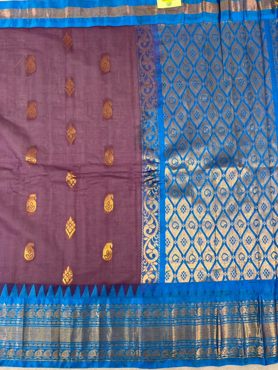 This elegant Gadwal Pure Cotton Handloom Saree features a subtle Light purple body adorned with Gold zari motifs, giving it a classy and timeless appeal. The blue borders with gold zari detailing add a vibrant touch, beautifully balancing tradition and sophistication. Lightweight and comfortable, it is perfect for everyday wear as well as special occasions. Blouse not included.