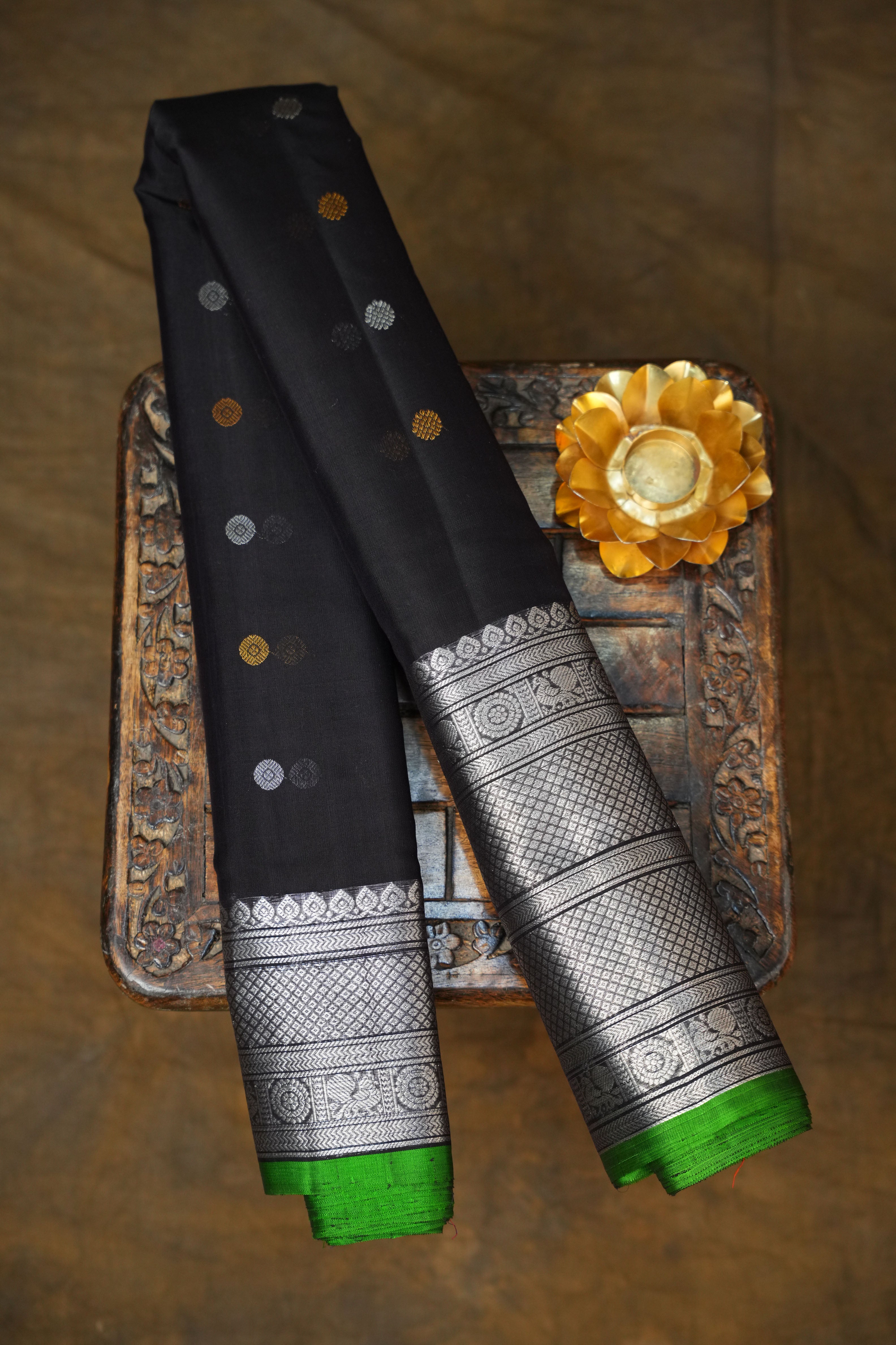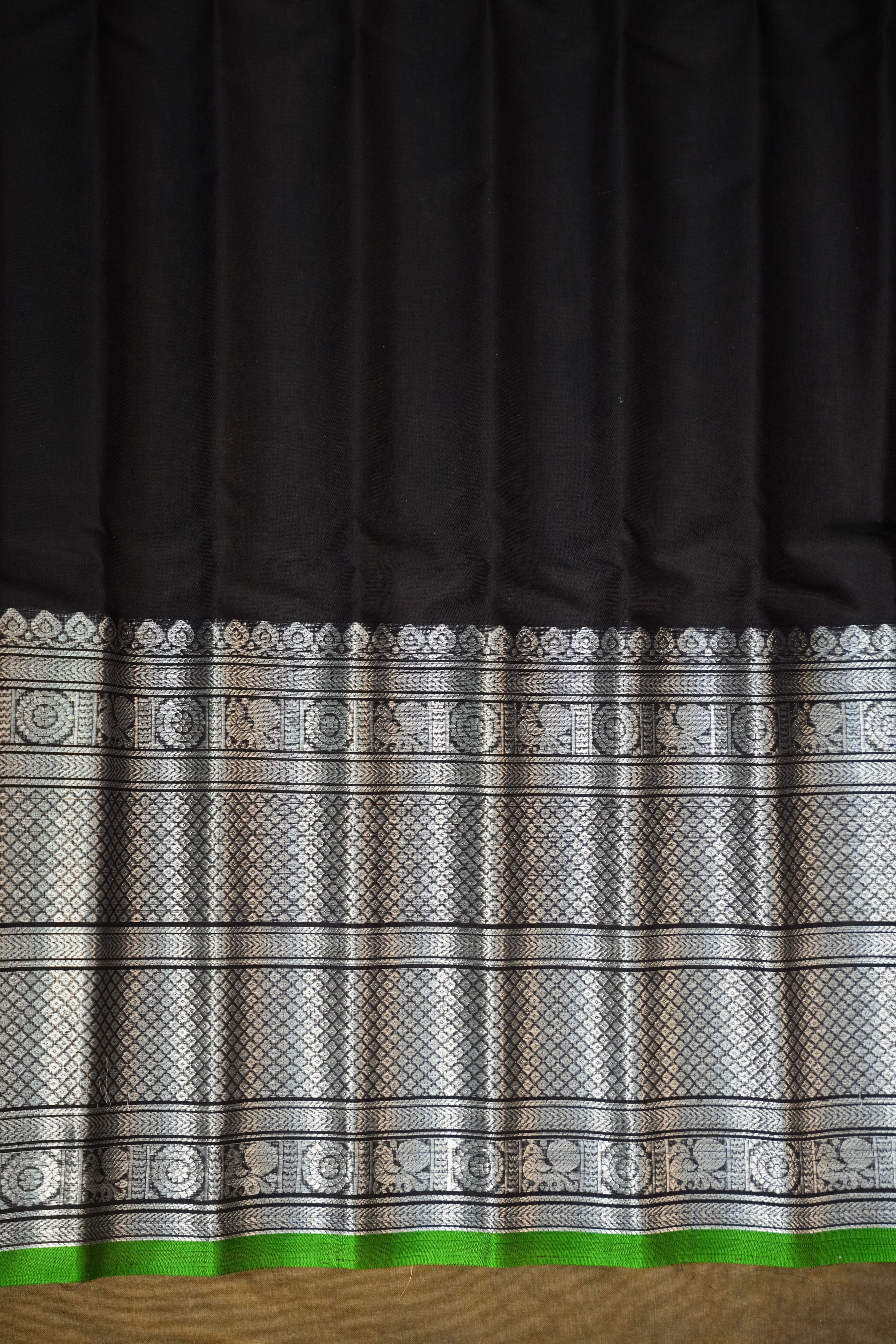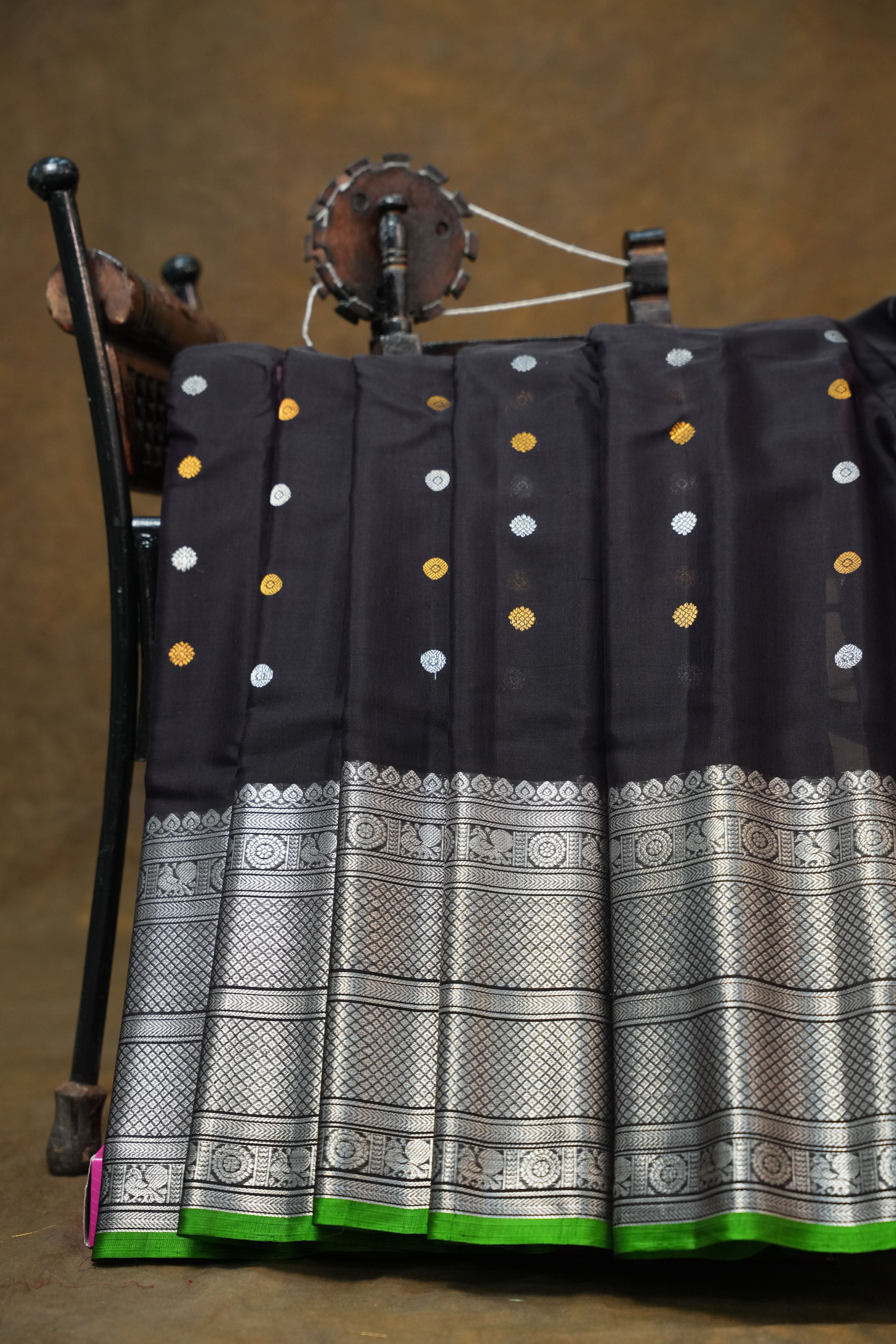 This elegant Gadwal Pure Cotton Silk Handloom Saree features a vibrant Dark Chocolate Brown body adorned with delicate gold and silver buttas, creating a timeless charm. The rich border and pallu are intricately woven with silver zari work with Green selvedge, and this saree comes with Self blouse giving it a graceful and traditional look. Lightweight and breathable, it is perfect for festive occasions and summer functions.