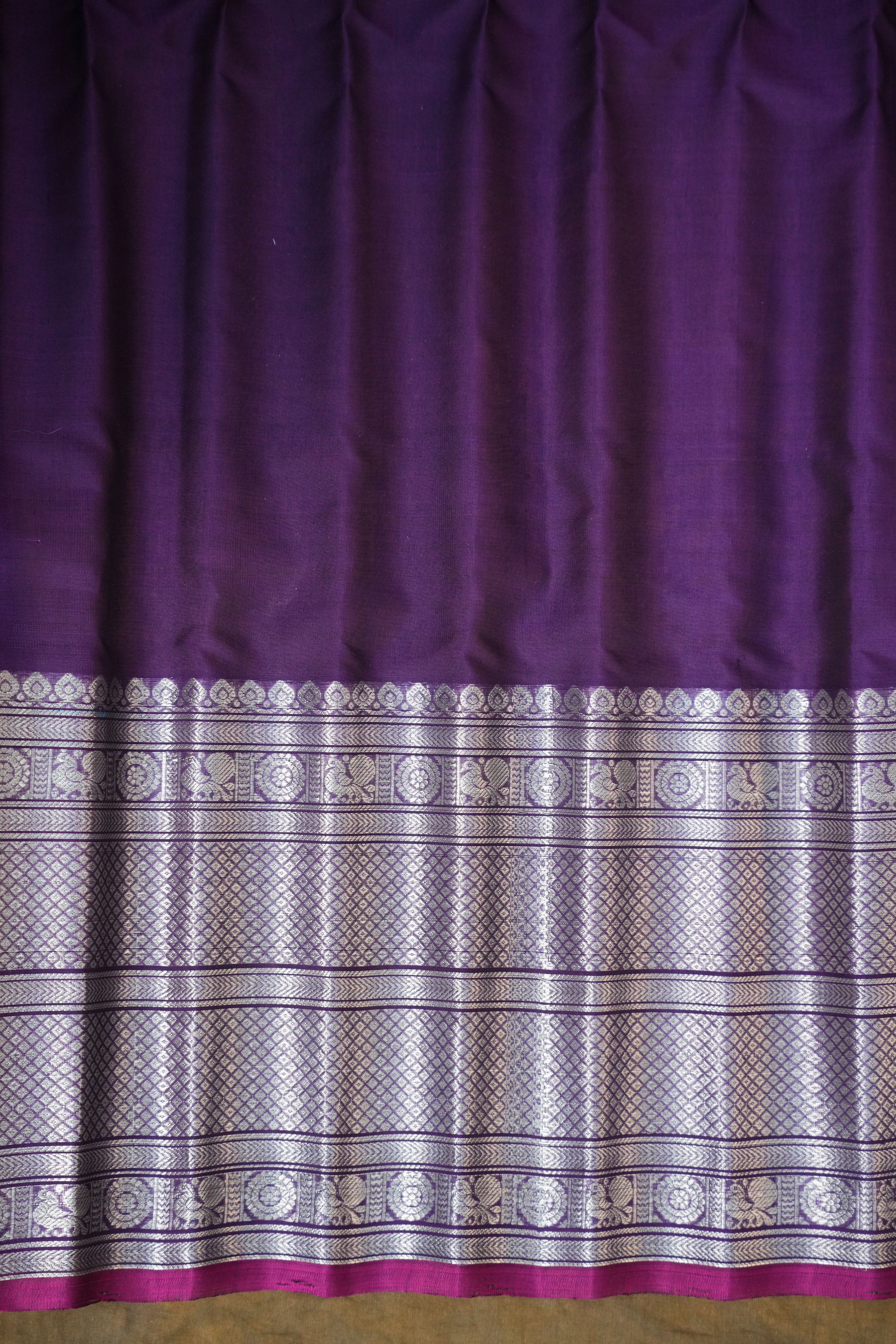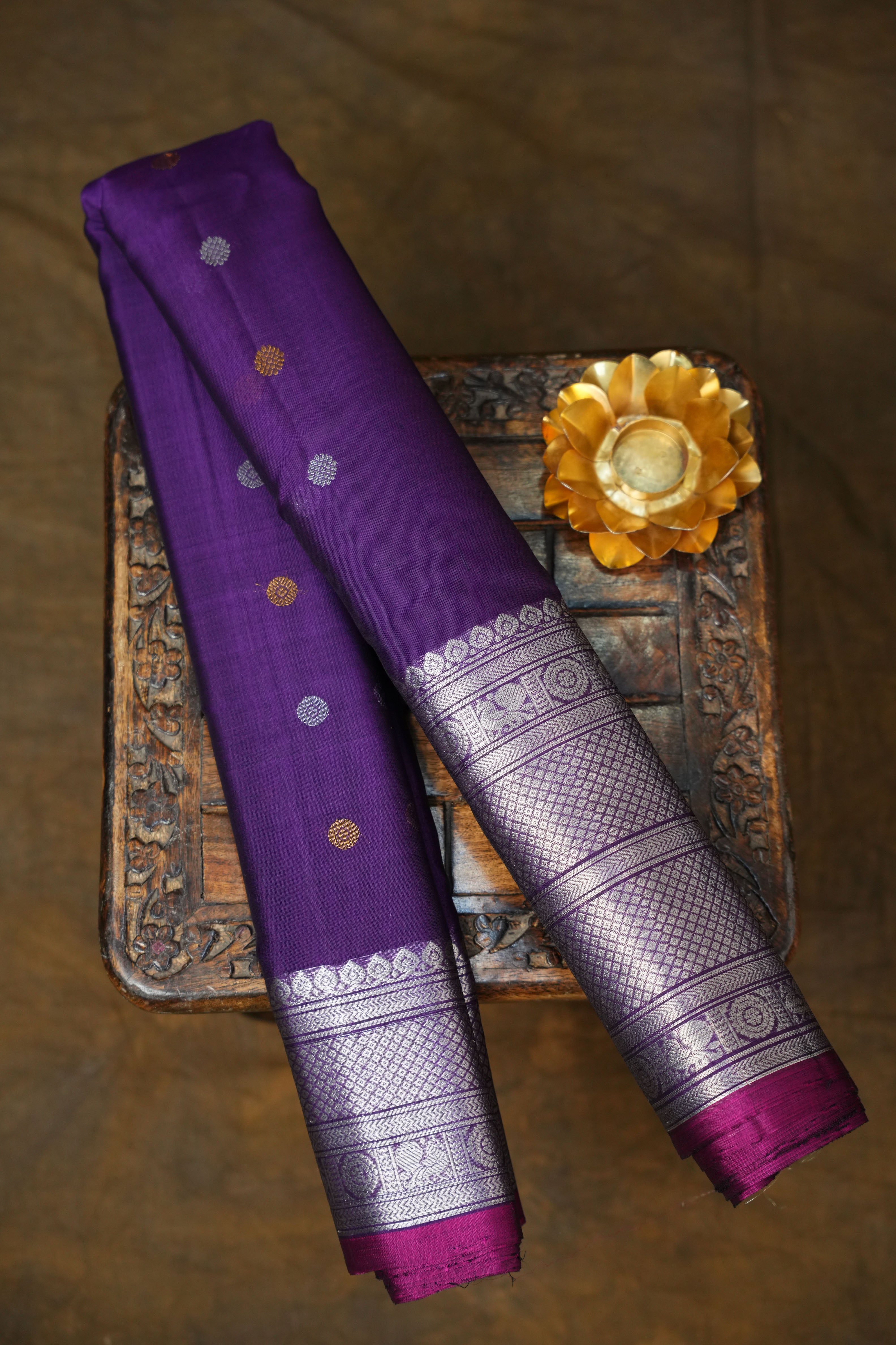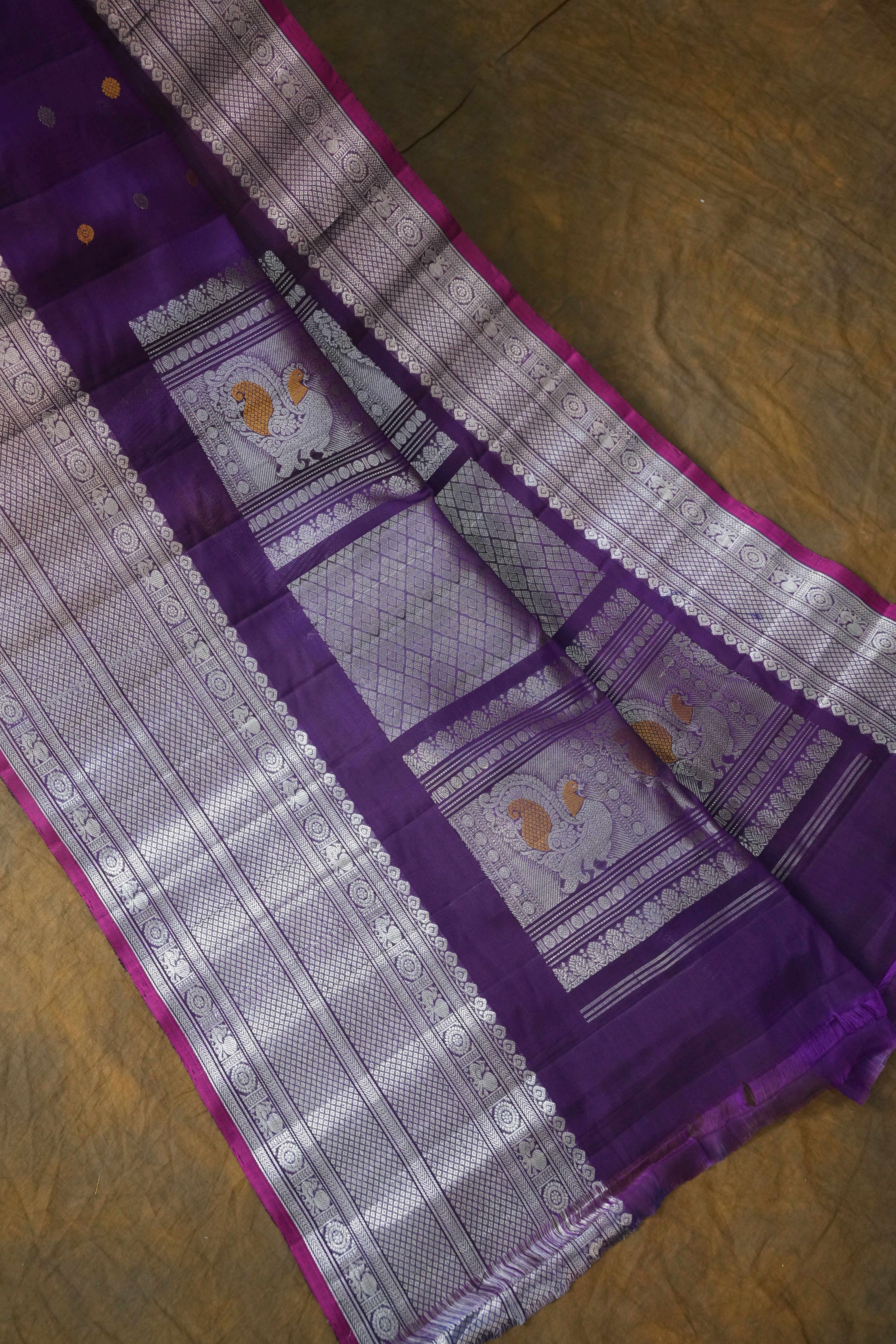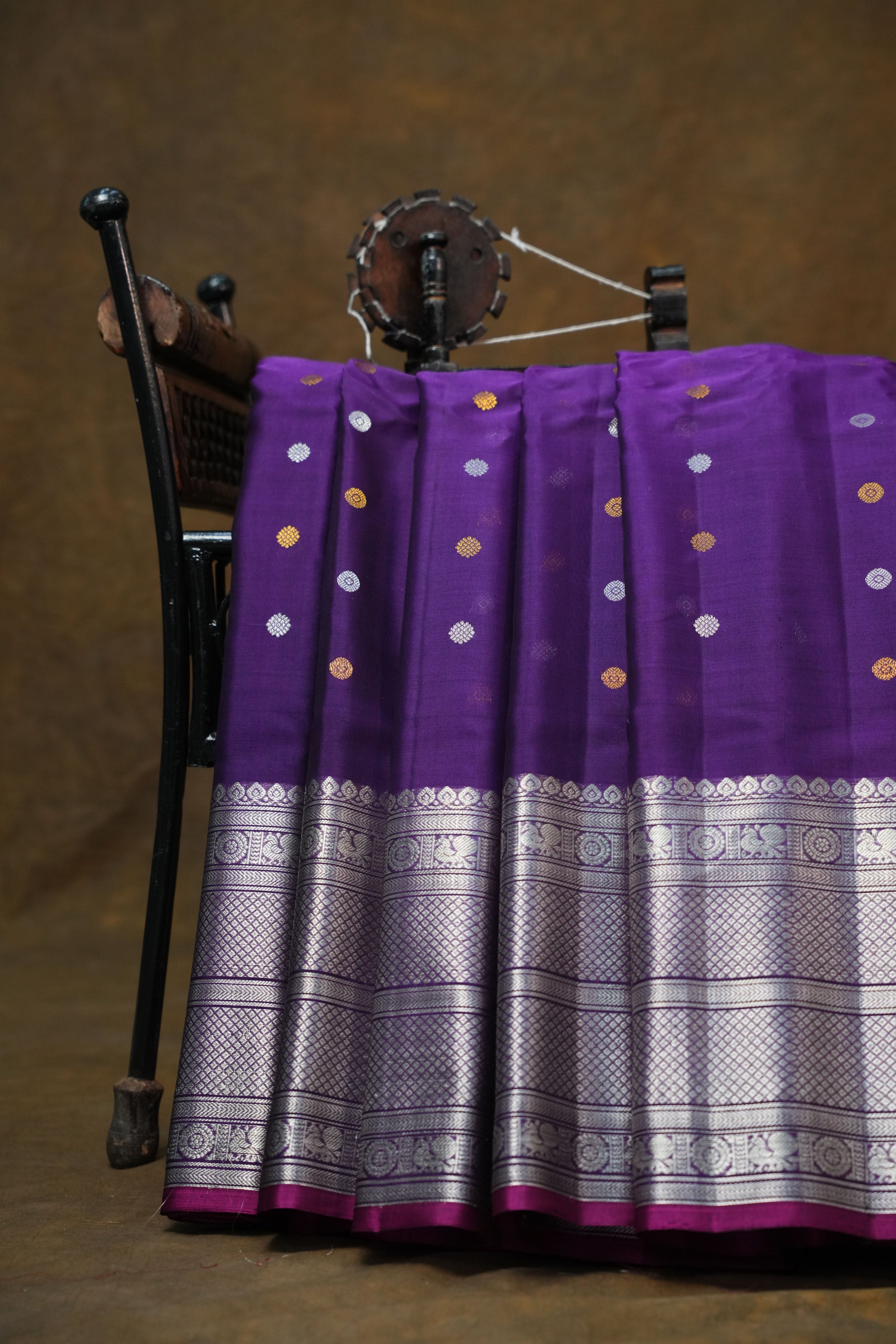 This elegant Gadwal Pure Cotton Silk Handloom Saree features a vibrant Wine body adorned with delicate gold and silver buttas, creating a timeless charm. The rich border and pallu are intricately woven with silver zari work with Magenta selvedge, and this saree comes with Self blouse giving it a graceful and traditional look. Lightweight and breathable, it is perfect for festive occasions and summer functions.