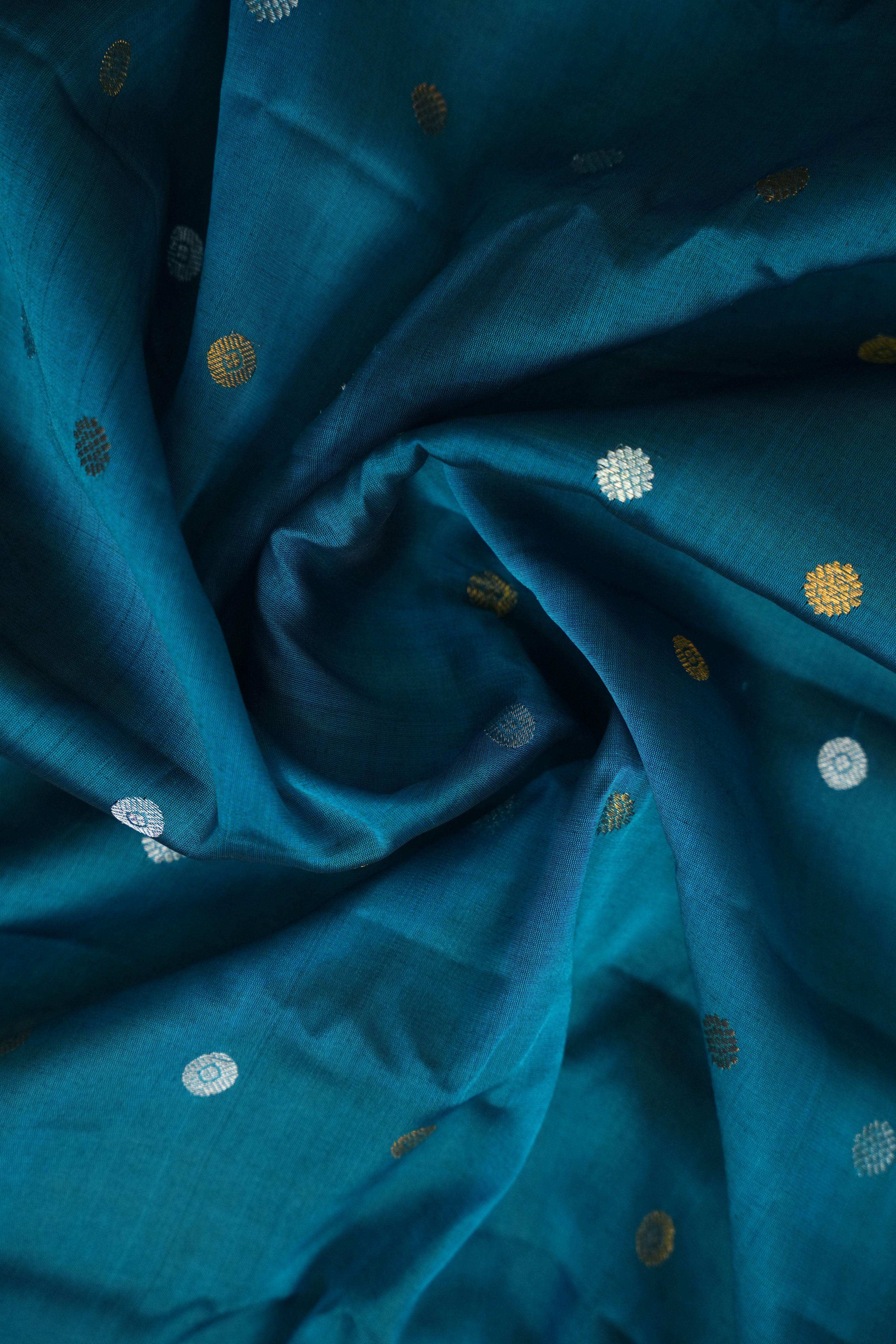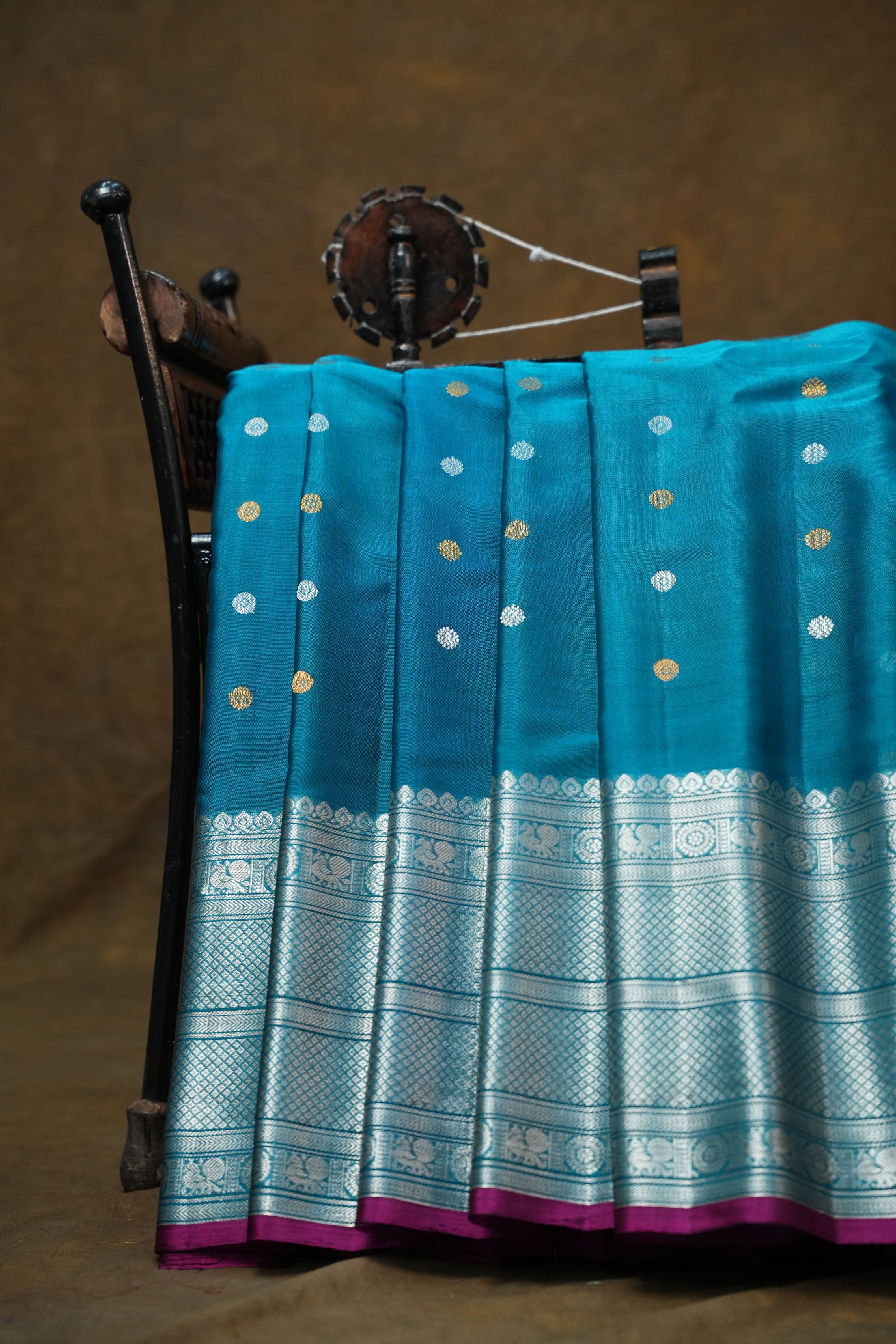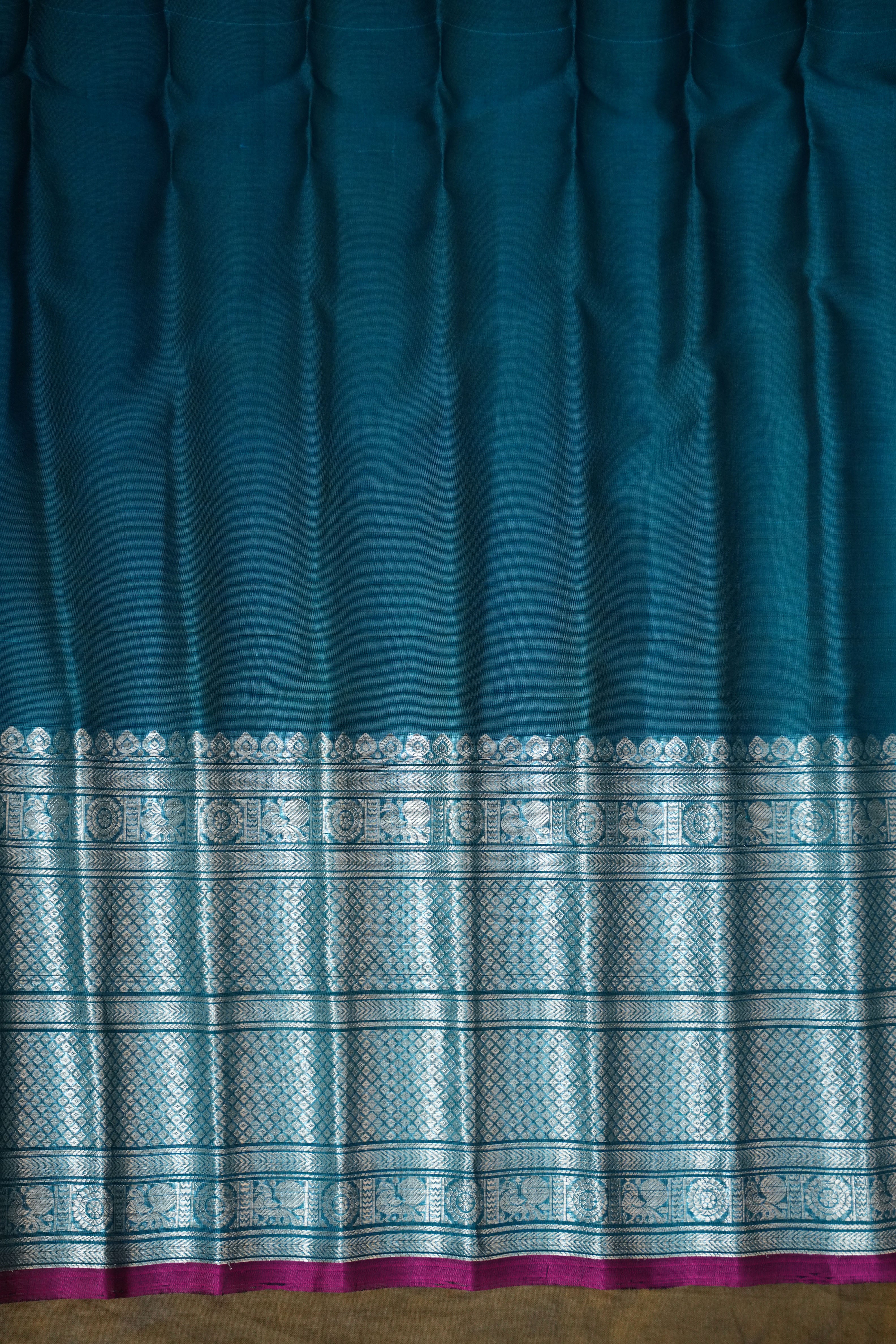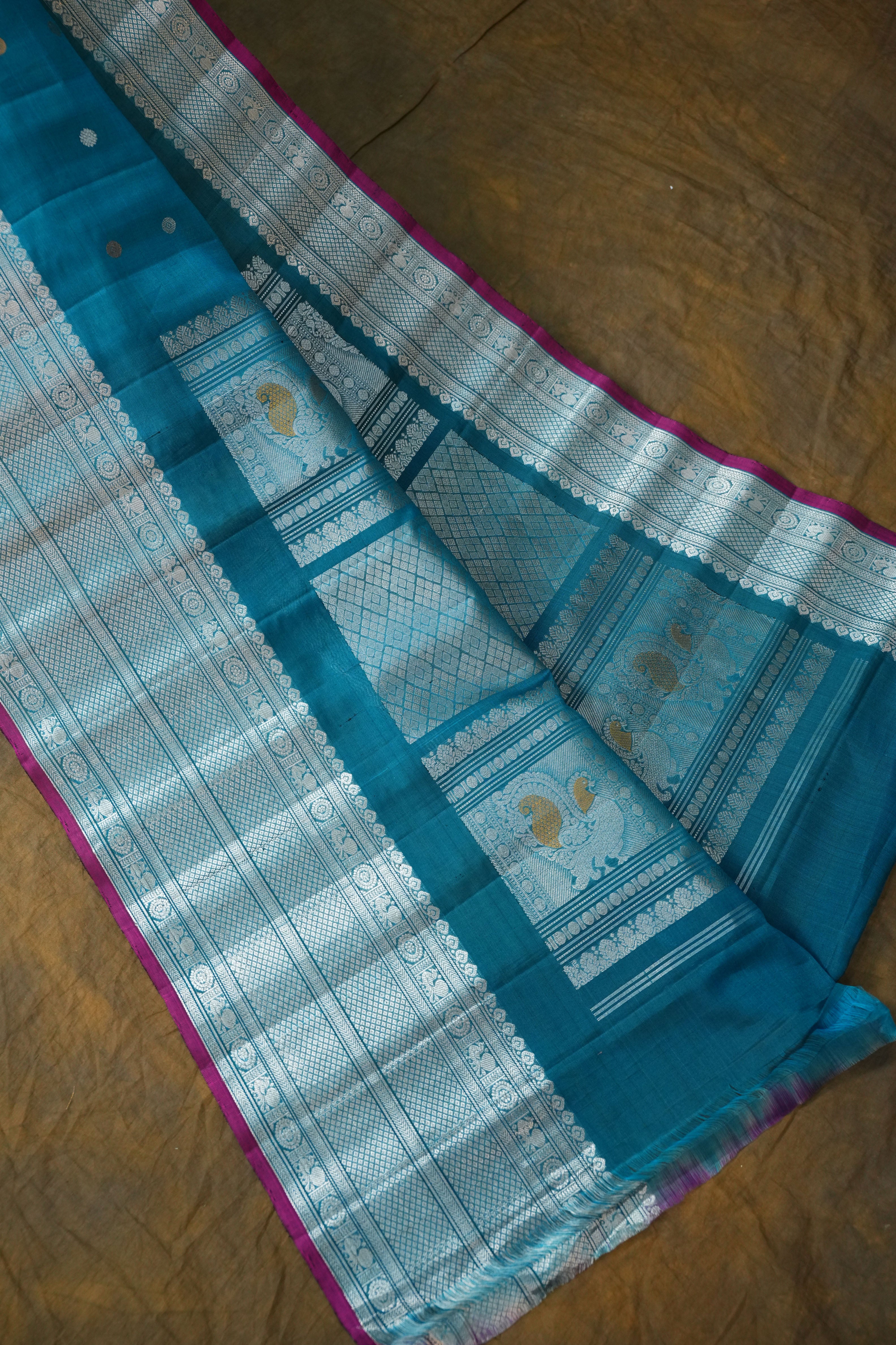 This elegant Gadwal Pure Cotton Silk Handloom Saree features a vibrant Teal Blue body adorned with delicate gold and silver buttas, creating a timeless charm. The rich border and pallu are intricately woven with silver zari work with Magenta selvedge, and this saree comes with Self blouse giving it a graceful and traditional look. Lightweight and breathable, it is perfect for festive occasions and summer functions.