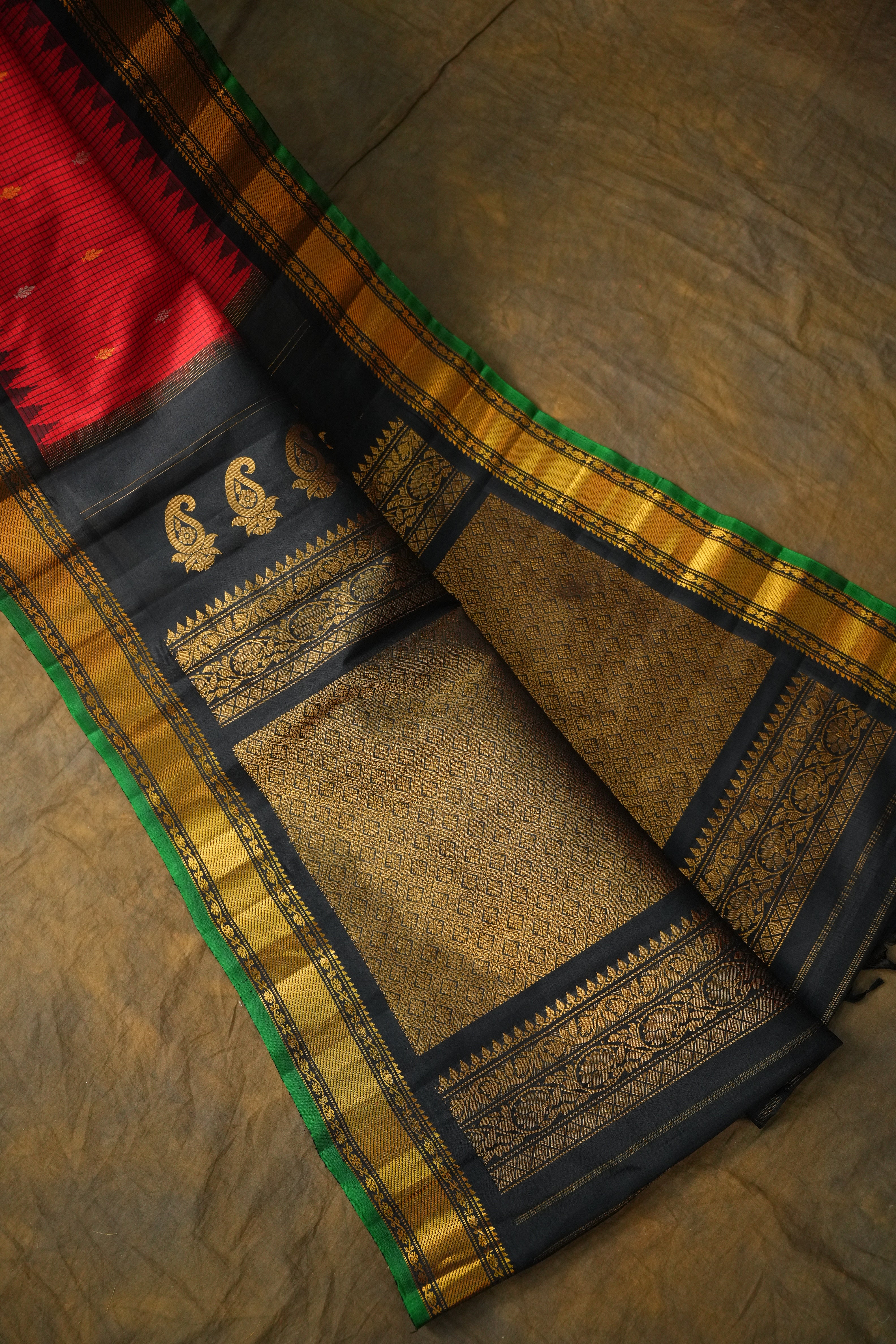 This exquisite Gadwal Pure Silk Handloom Saree showcases timeless elegance with Red body, adorned with delicate checks with gold and silver zari buttas spread evenly across the fabric. The highlight of this masterpiece is its stunning Black border and comes with green selvedge, each embellished with intricate temple motifs and gold zari detailing. Woven by skilled artisans, this saree embodies the grace of traditional handloom weaving, perfect for weddings, festivals, and grand occasions. This saree comes with a contrast blouse, and is Silk Mark certified for authenticity.
