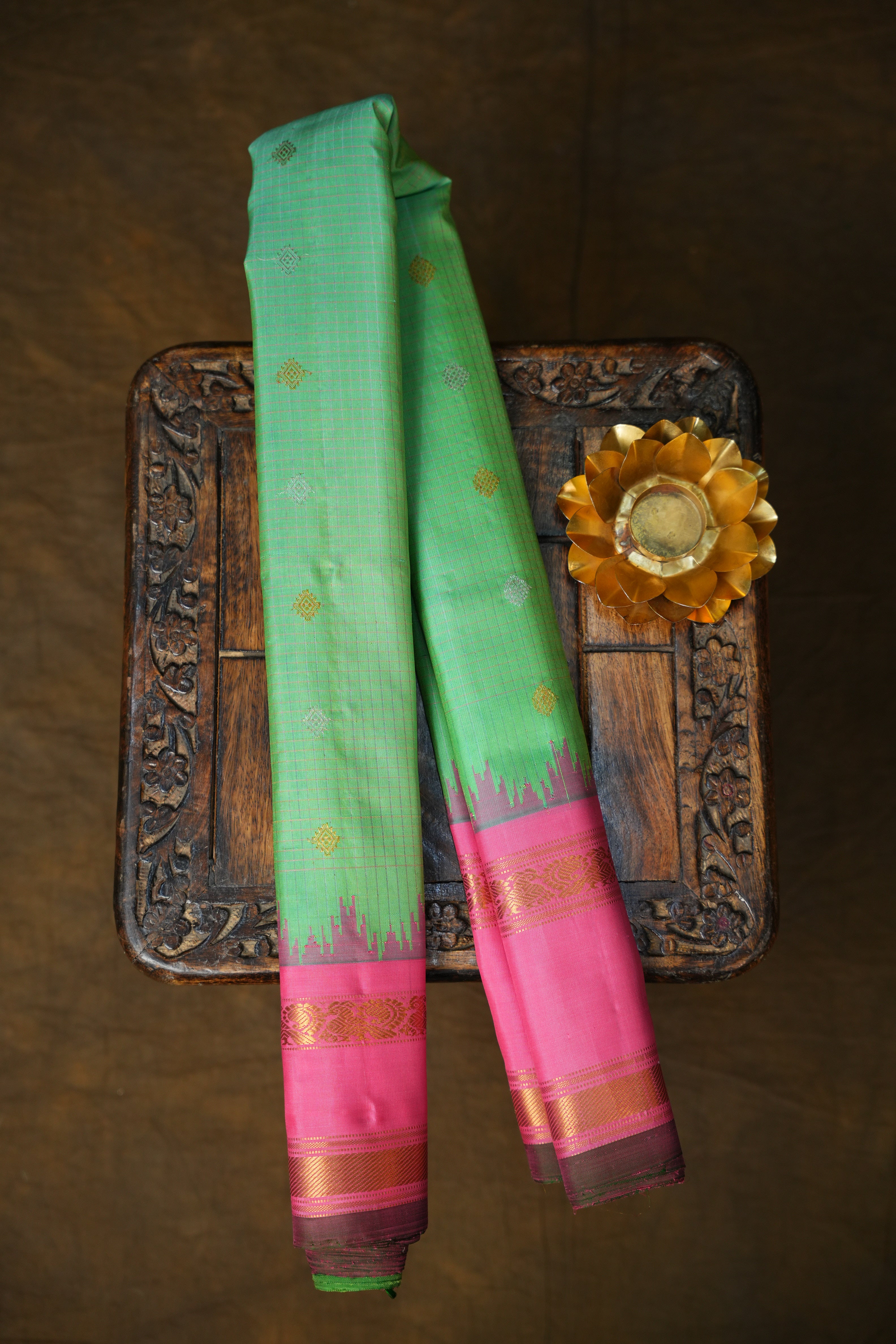 This Exclusive Gadwal Pure Silk Checks Handloom Saree showcases a Parrot green body woven with fine gold zari checks, highlighted with elegant gold and silver buttas that add a graceful sheen. The saree is beautifully contrasted by a Baby pink gap border and comes with green selvedge, intricately crafted with traditional Floral motifs in shimmering gold zari, reflecting the timeless heritage of Gadwal handloom artistry. This saree comes with contrast blouse and it is Silk mark certified.