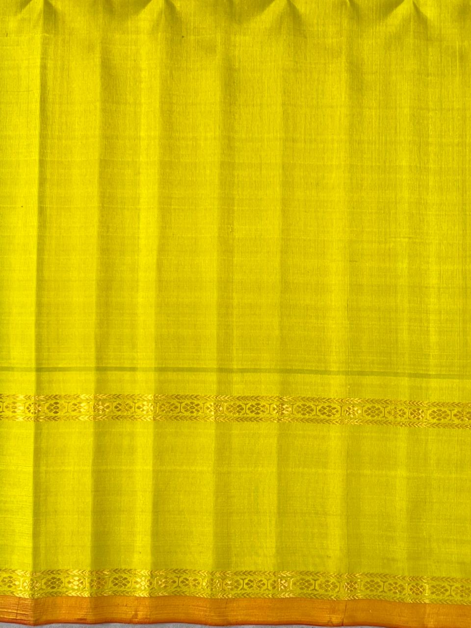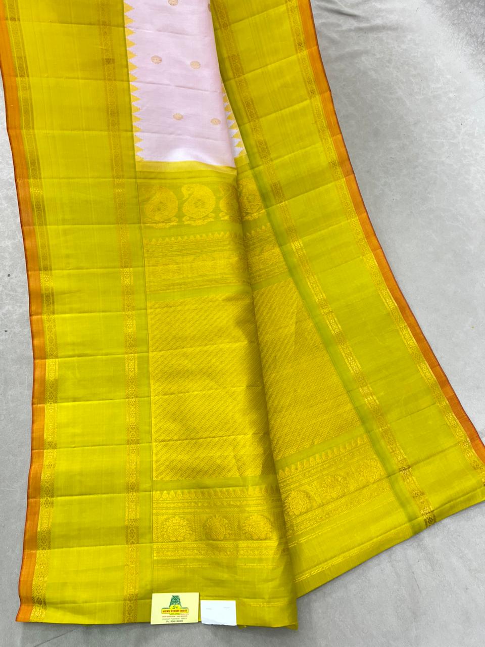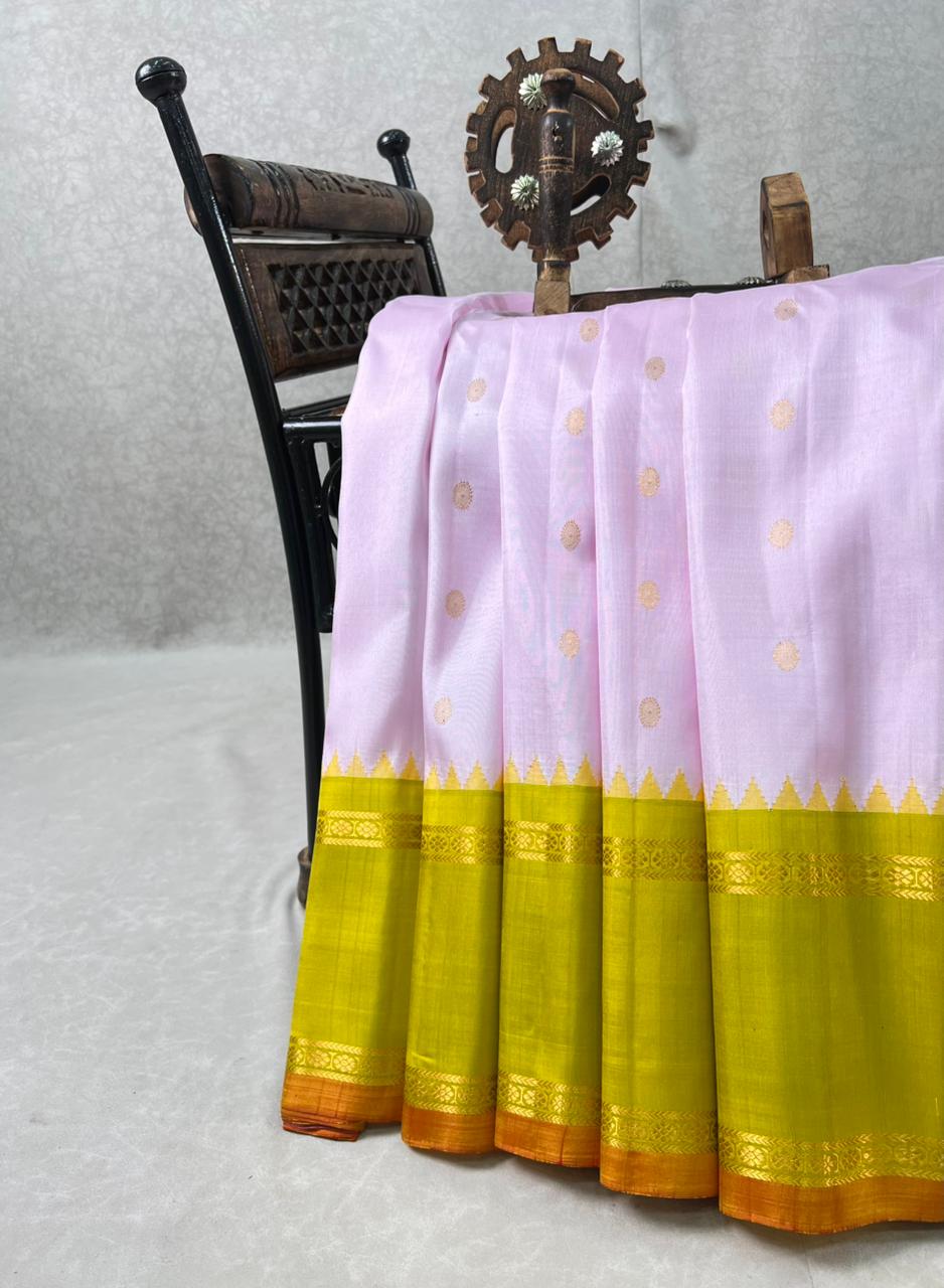 This elegant Gadwal pure silk gap border handloom saree comes in a graceful Baby pink body with delicate gold buttas. The Dual shade Yellow green gap border is adorned with intricate gold zari weaving following with Orange selvedge, adding a touch of richness and tradition. A perfect blend of subtle charm and regal elegance, this handloom masterpiece is ideal for festive and special occasions. Comes with contrast blouse, and Silk Mark certified perfect for traditional celebrations.