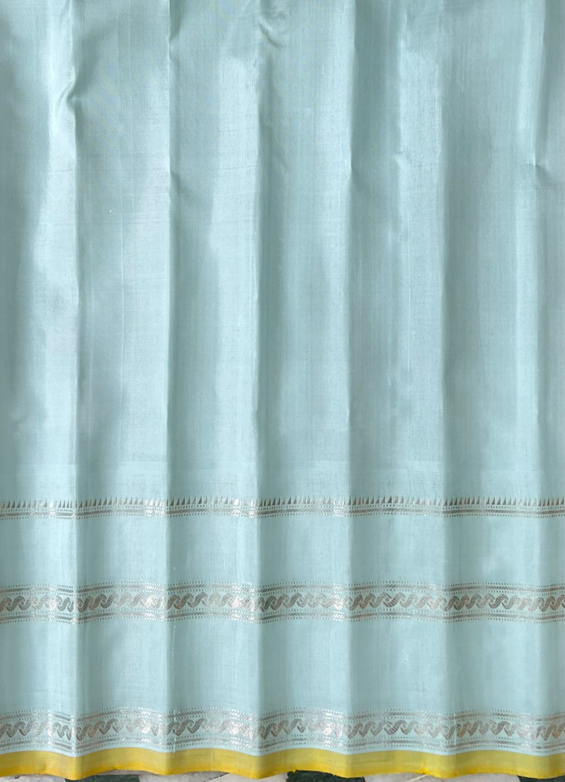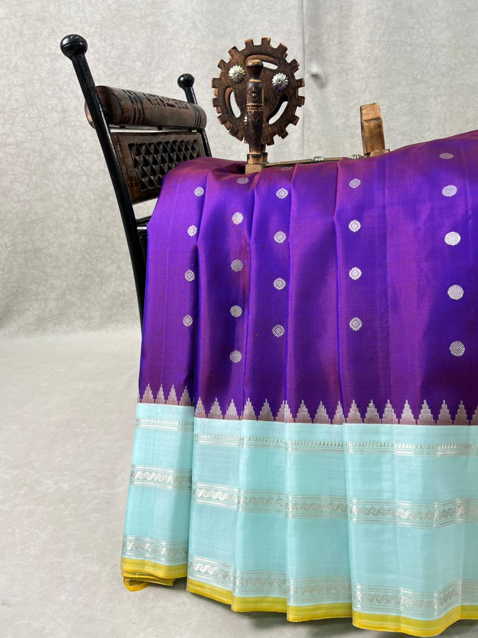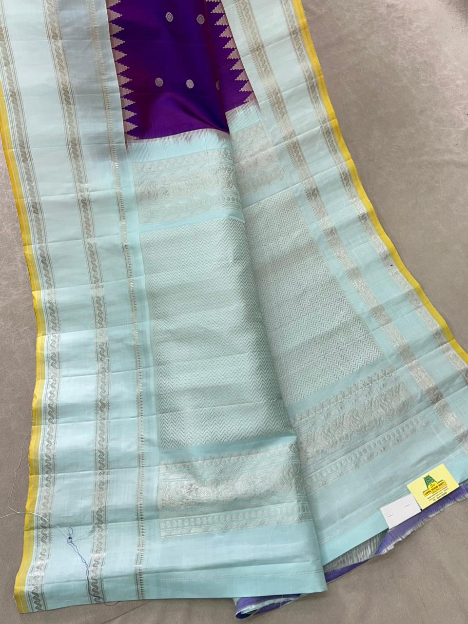 This elegant Gadwal pure silk gap border handloom saree comes in a graceful Purple body with delicate Silver buttas. the very light blue gap border is adorned with intricate Silver zari weaving following with Yellow selvedge, adding a touch of richness and tradition. A perfect blend of subtle charm and regal elegance, this handloom masterpiece is ideal for festive and special occasions. Comes with contrast blouse, and Silk Mark certified perfect for traditional celebrations.