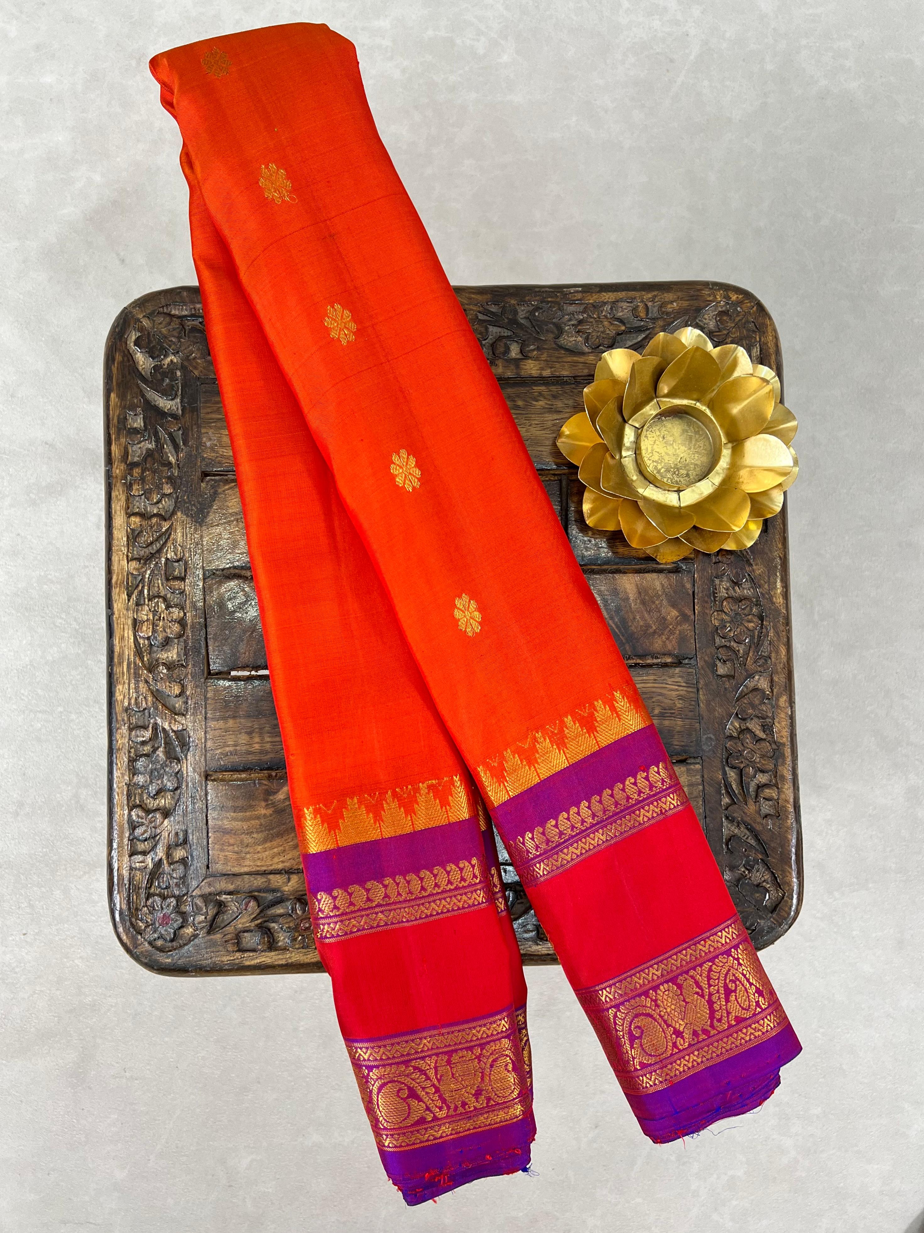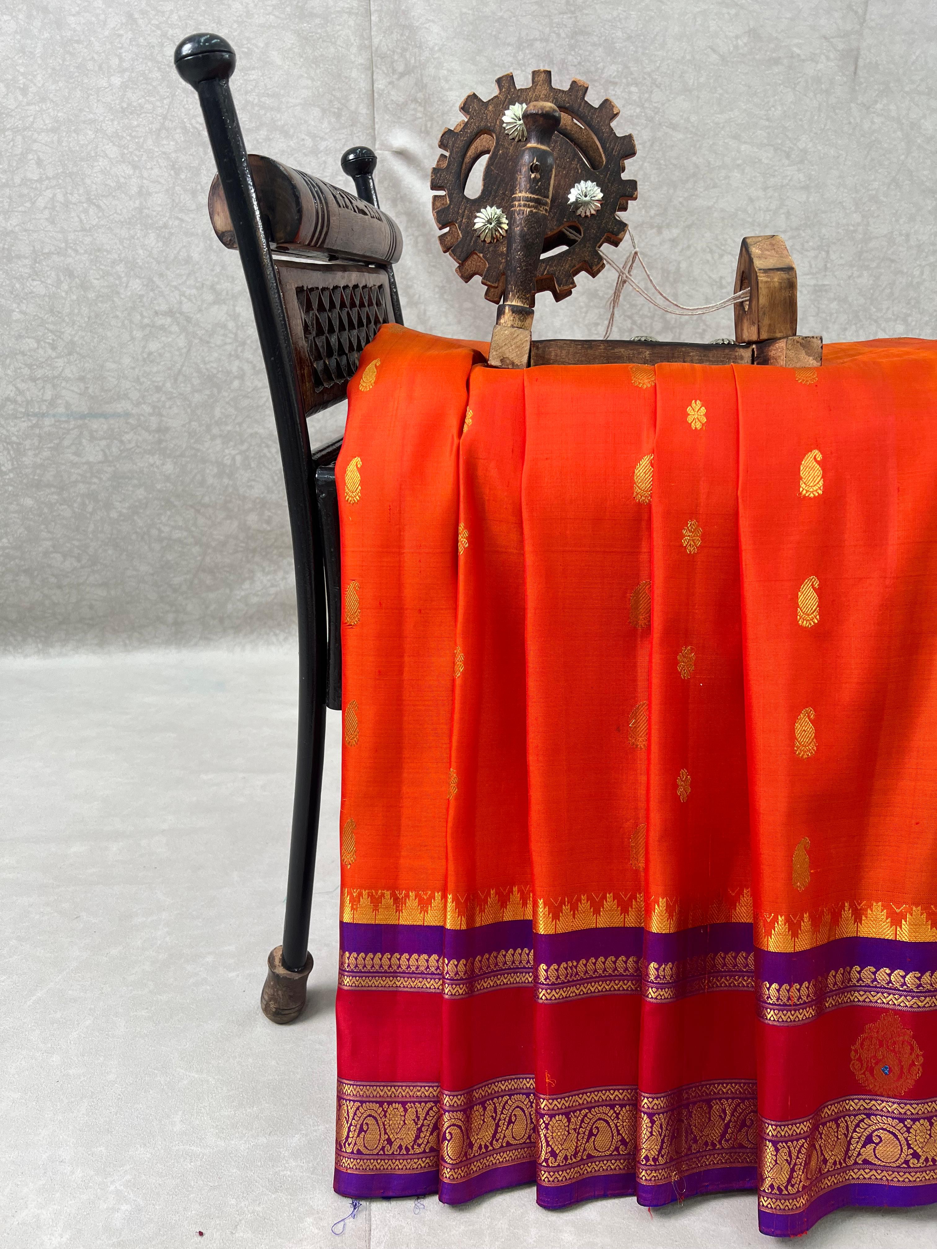 This graceful Gadwal Pure Silk Saree features a rich orange body with golden and silver buttas. The vibrant purple and red gap border with intricate golden zari weaving and meena butta, adds striking contrast and beauty. A perfect blend of tradition and elegance, this saree is ideal for festive and special occasions. Comes with contrast blouse and Silk Mark certified — perfect for traditional celebrations.
