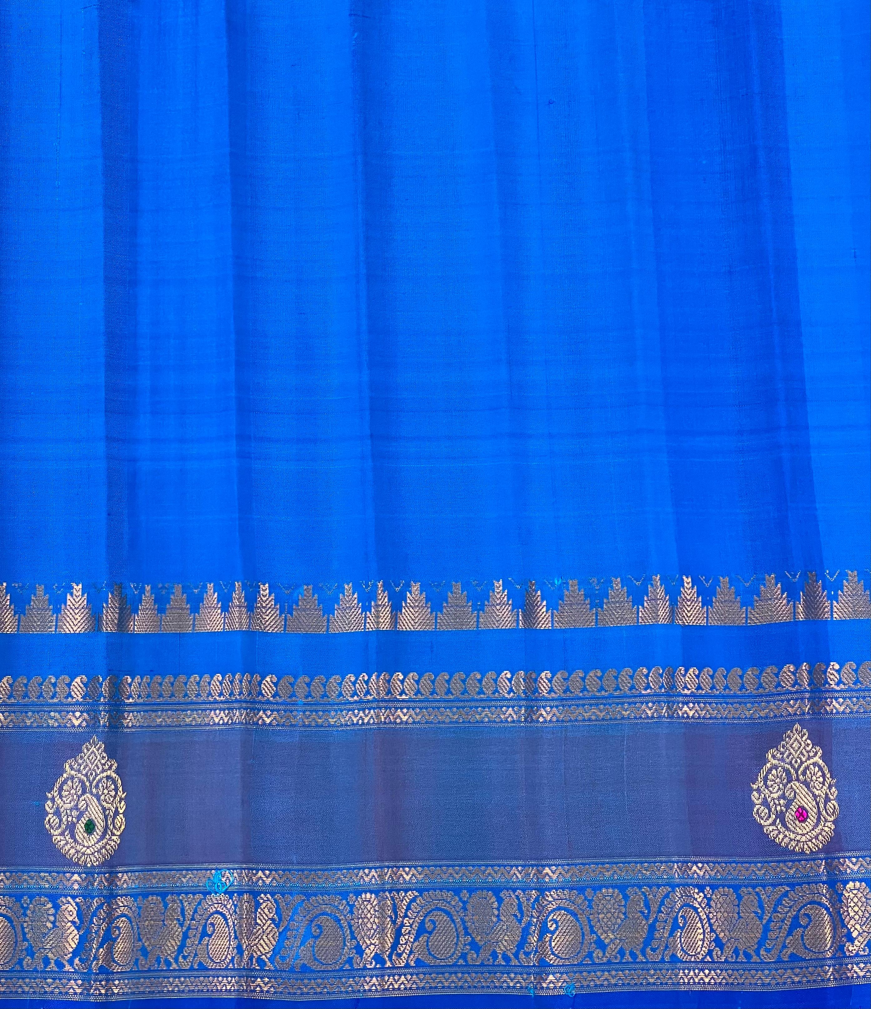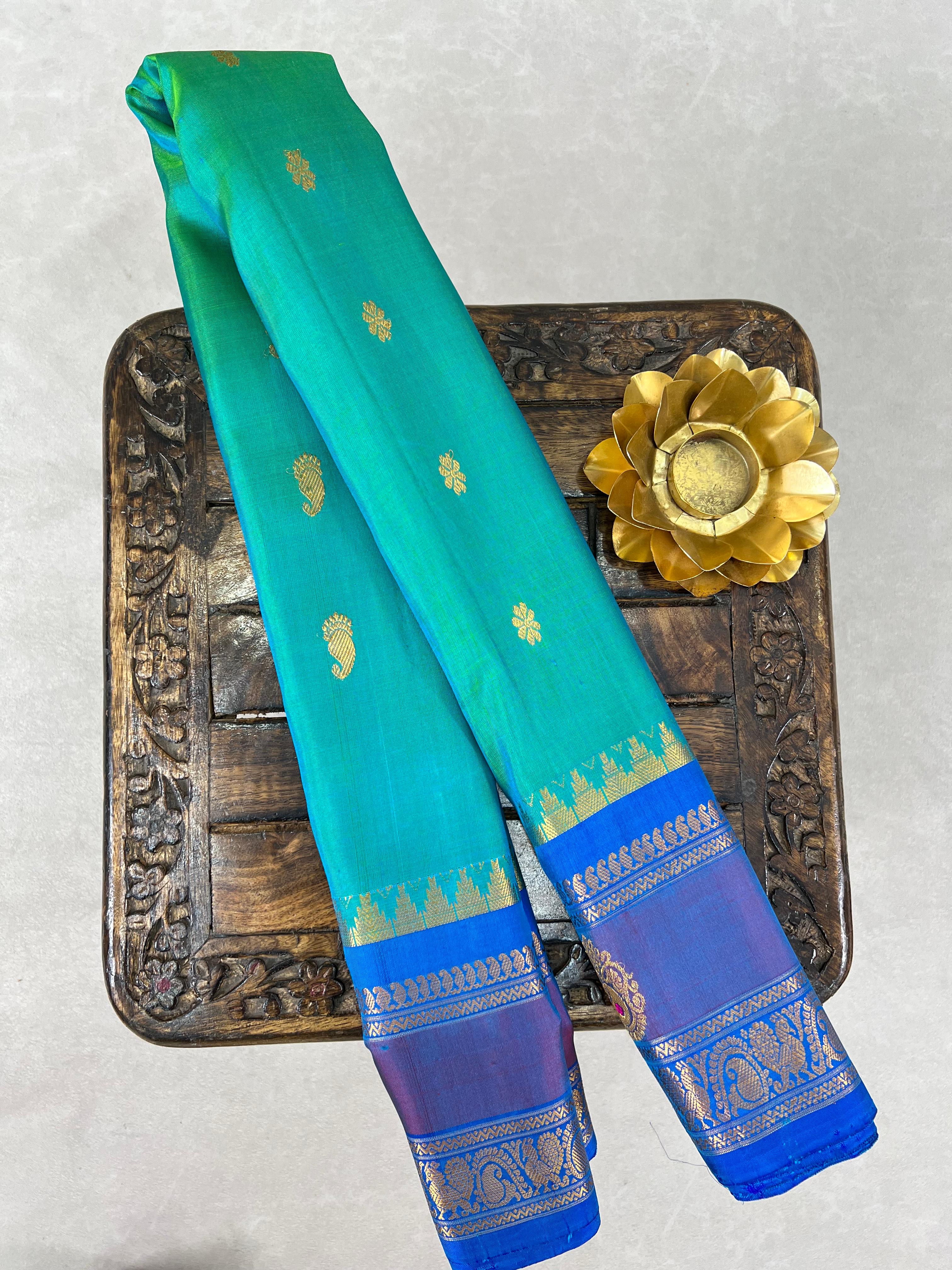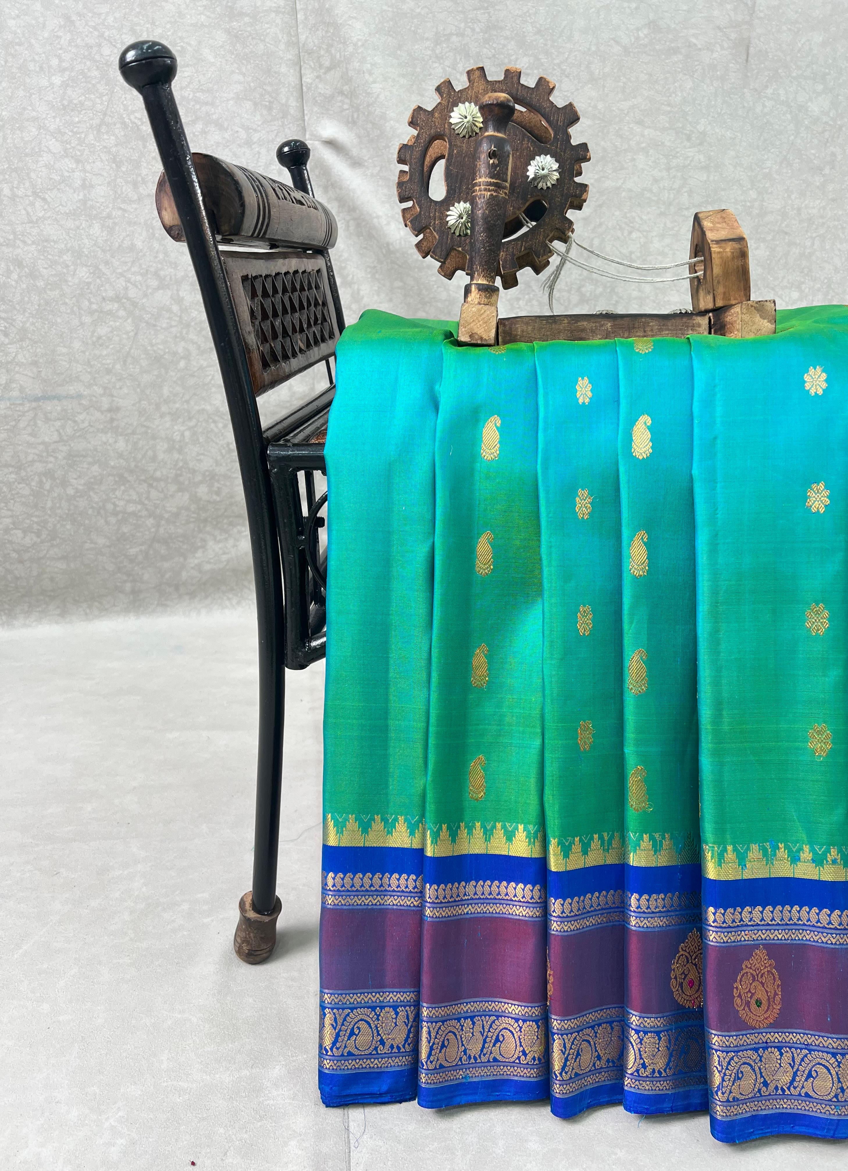 This graceful Gadwal Pure Silk Saree features a rich sea green body with golden and silver buttas. The vibrant sky blue gap border with intricate golden zari weaving and meena butta, adds striking contrast and beauty. A perfect blend of tradition and elegance, this saree is ideal for festive and special occasions. Comes with contrast blouse and Silk Mark certified — perfect for traditional celebrations.