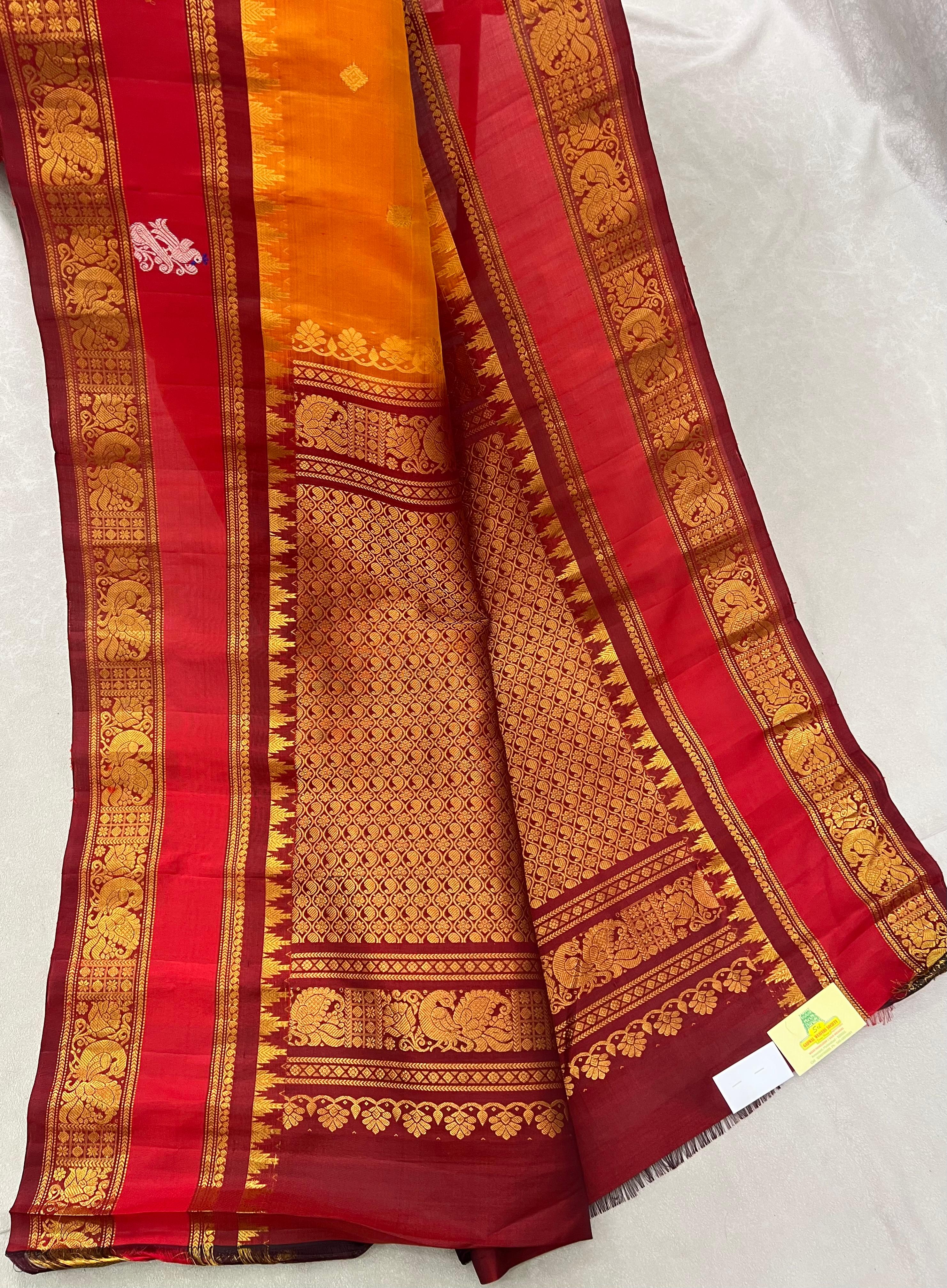 This graceful Gadwal Pure Silk Saree features a rich yellow body with golden and silver buttas. The vibrant maroon and red gap border with intricate golden zari weaving and meena butta, adds striking contrast and beauty. A perfect blend of tradition and elegance, this saree is ideal for festive and special occasions. Comes with contrast blouse and Silk Mark certified — perfect for traditional celebrations.