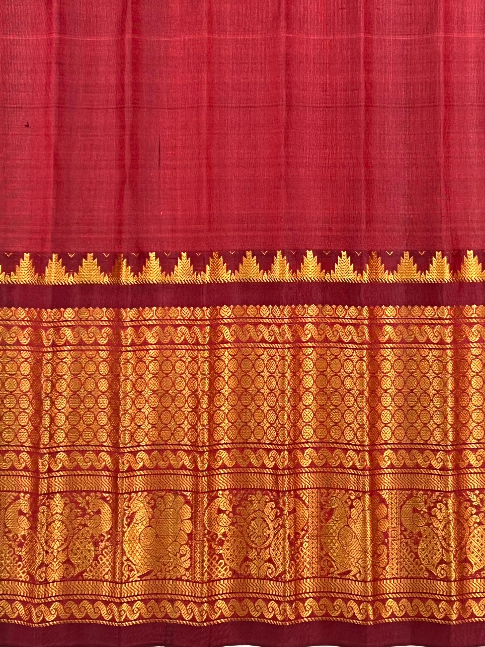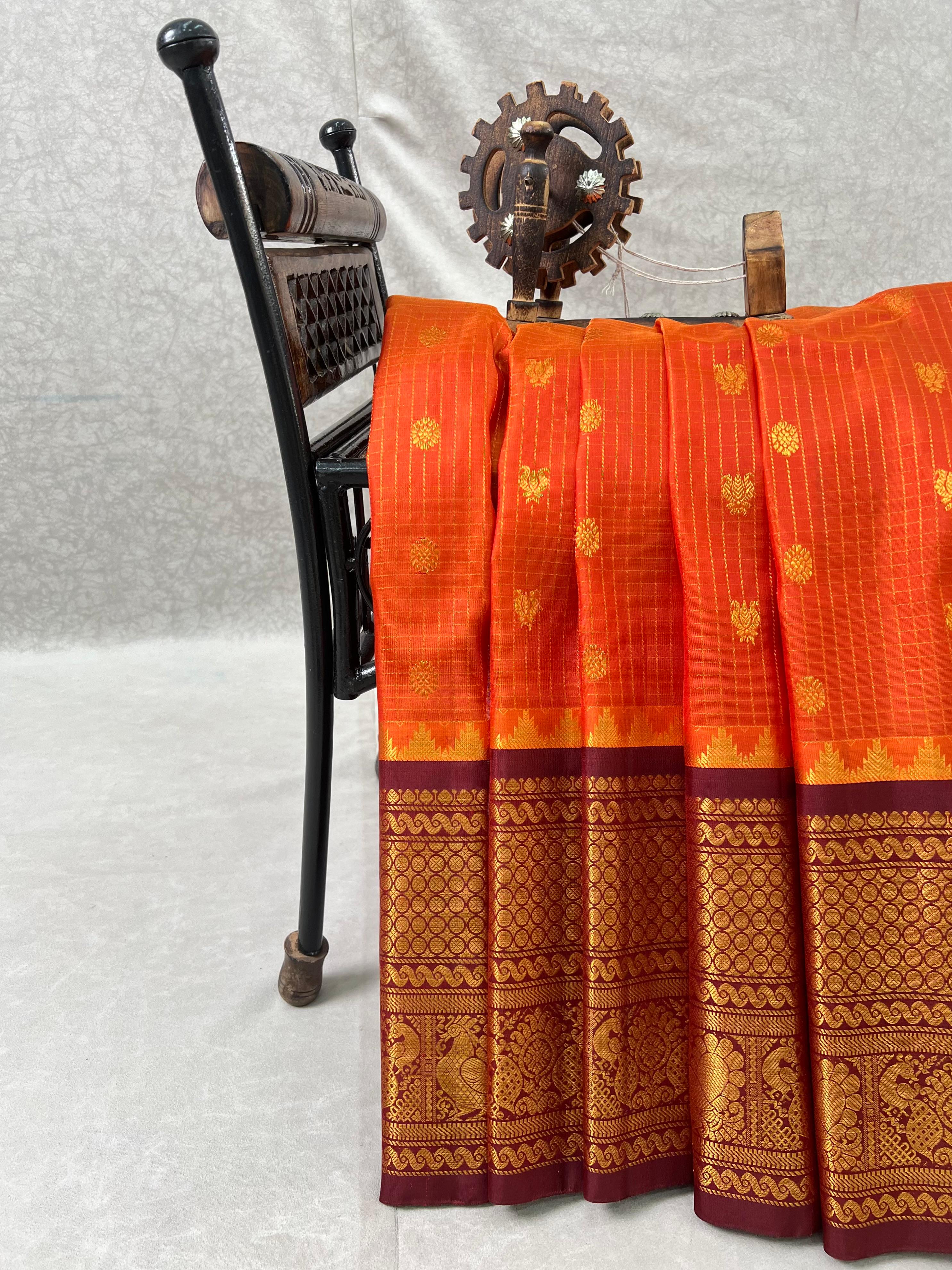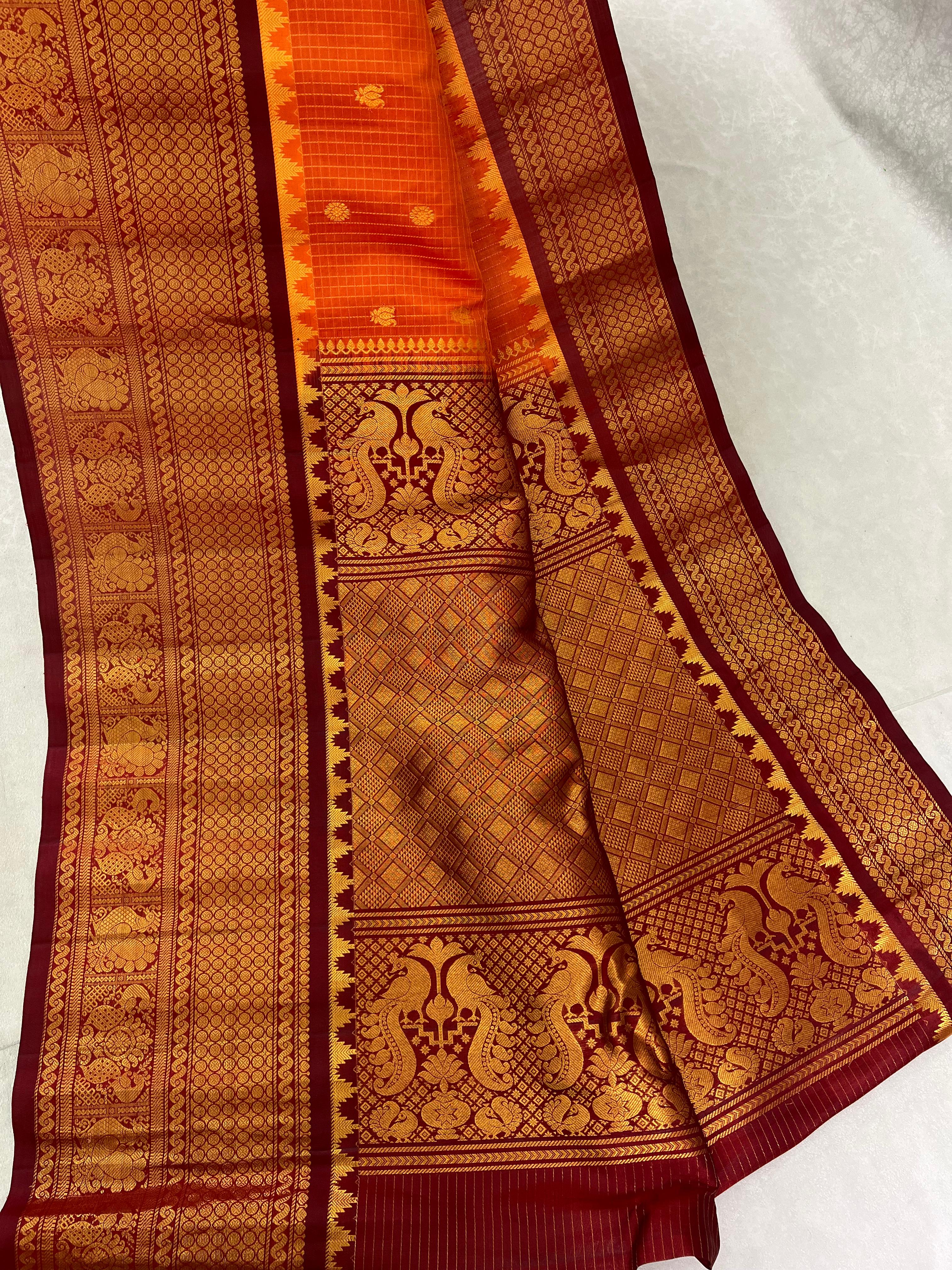 This radiant Gadwal Pure Silk Handloom Saree features a vibrant orange body adorned with subtle golden checks and zari buttas. The rich maroon zari woven border and pallu, highlighted with intricate peacock motifs, add a royal elegance. A perfect pick for festive and traditional occasions.Comes with a contrast blouse, making it a perfect choice for festive occasions and grand celebrations!. Silk Mark Certified.