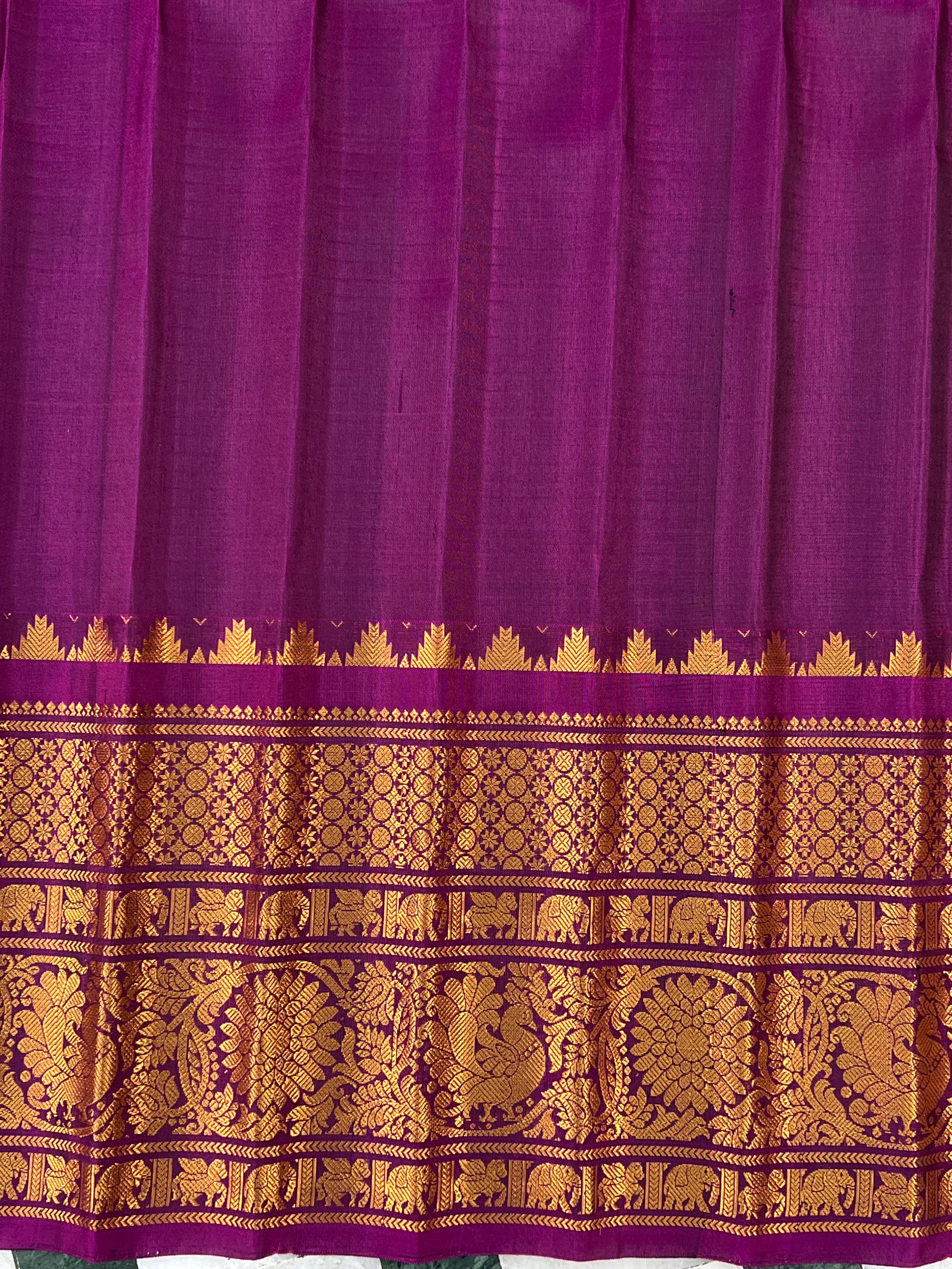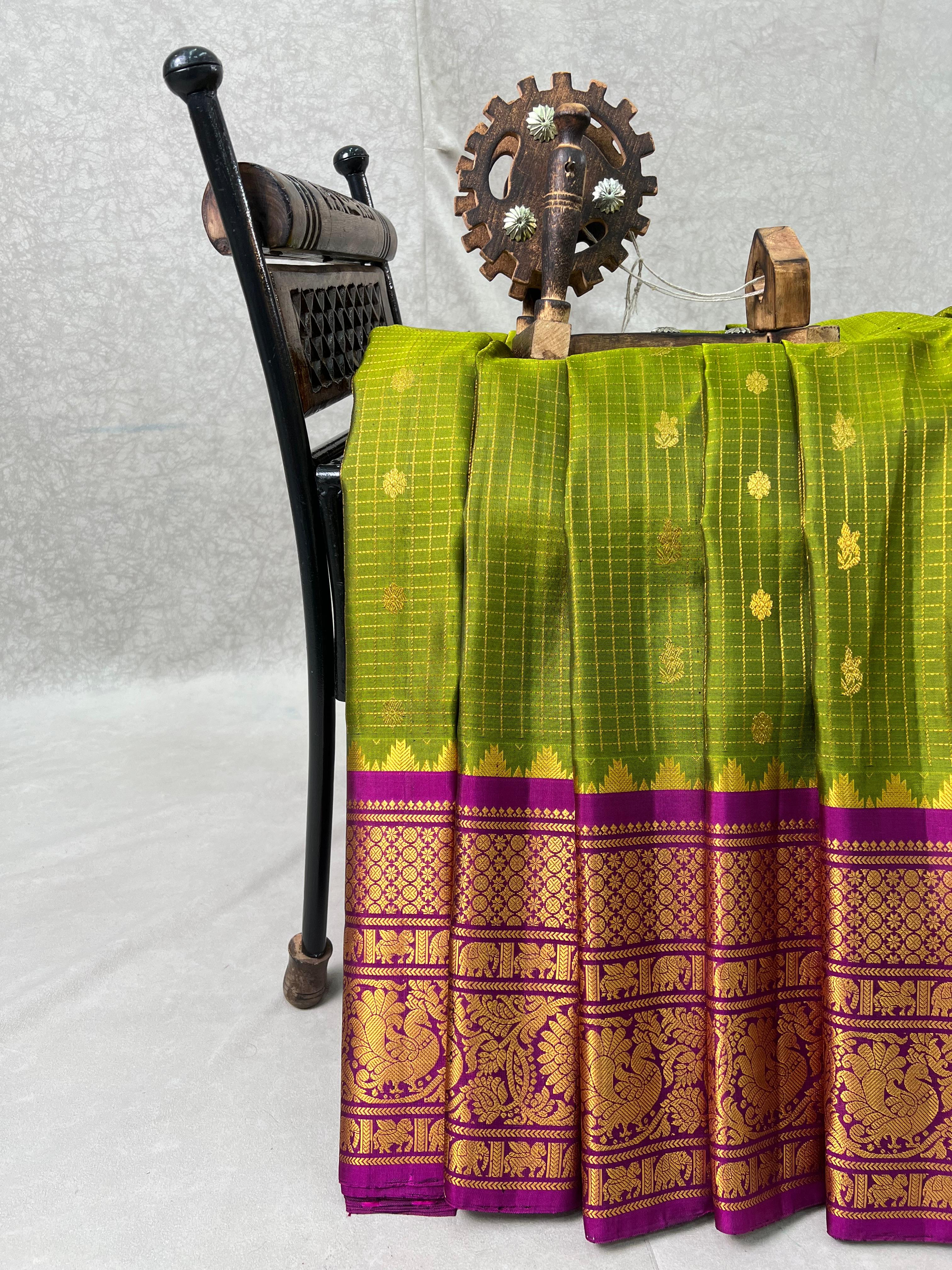 This radiant Gadwal Pure Silk Handloom Saree features a vibrant green body adorned with subtle golden checks and zari buttas. The rich purple zari woven border and pallu, highlighted with intricate peacock motifs, add a royal elegance. A perfect pick for festive and traditional occasions.Comes with a contrast blouse, making it a perfect choice for festive occasions and grand celebrations!. Silk Mark Certified.