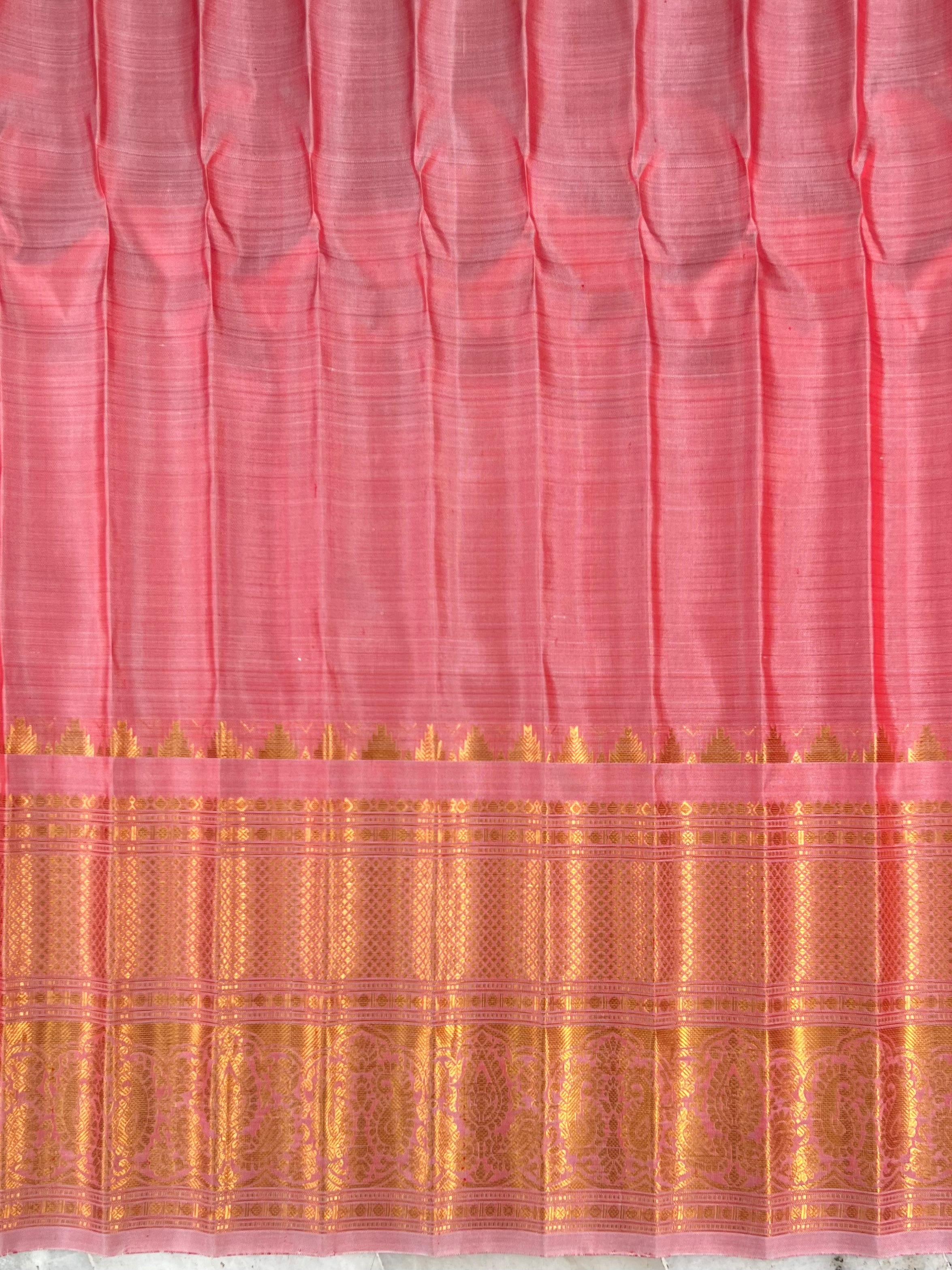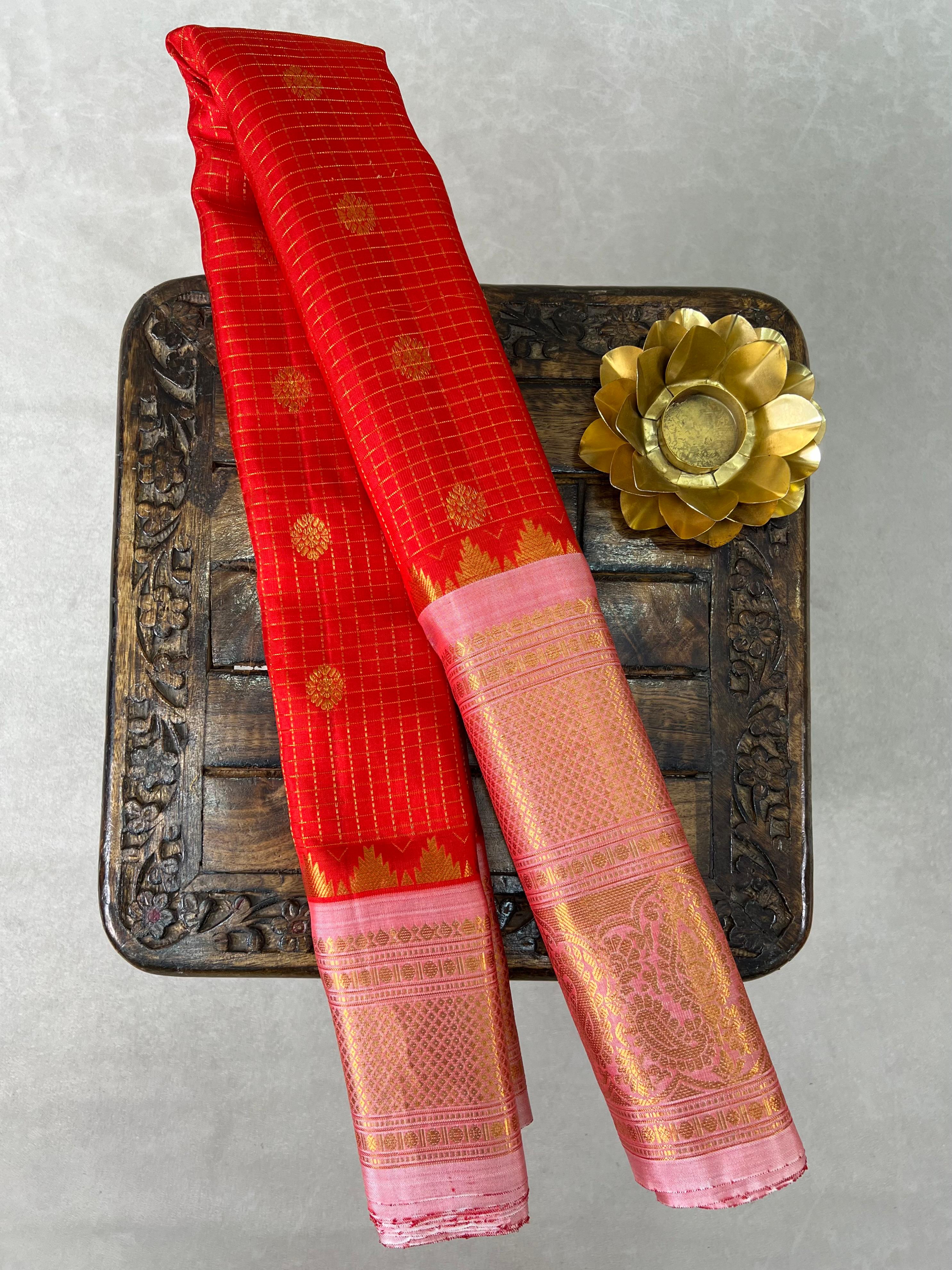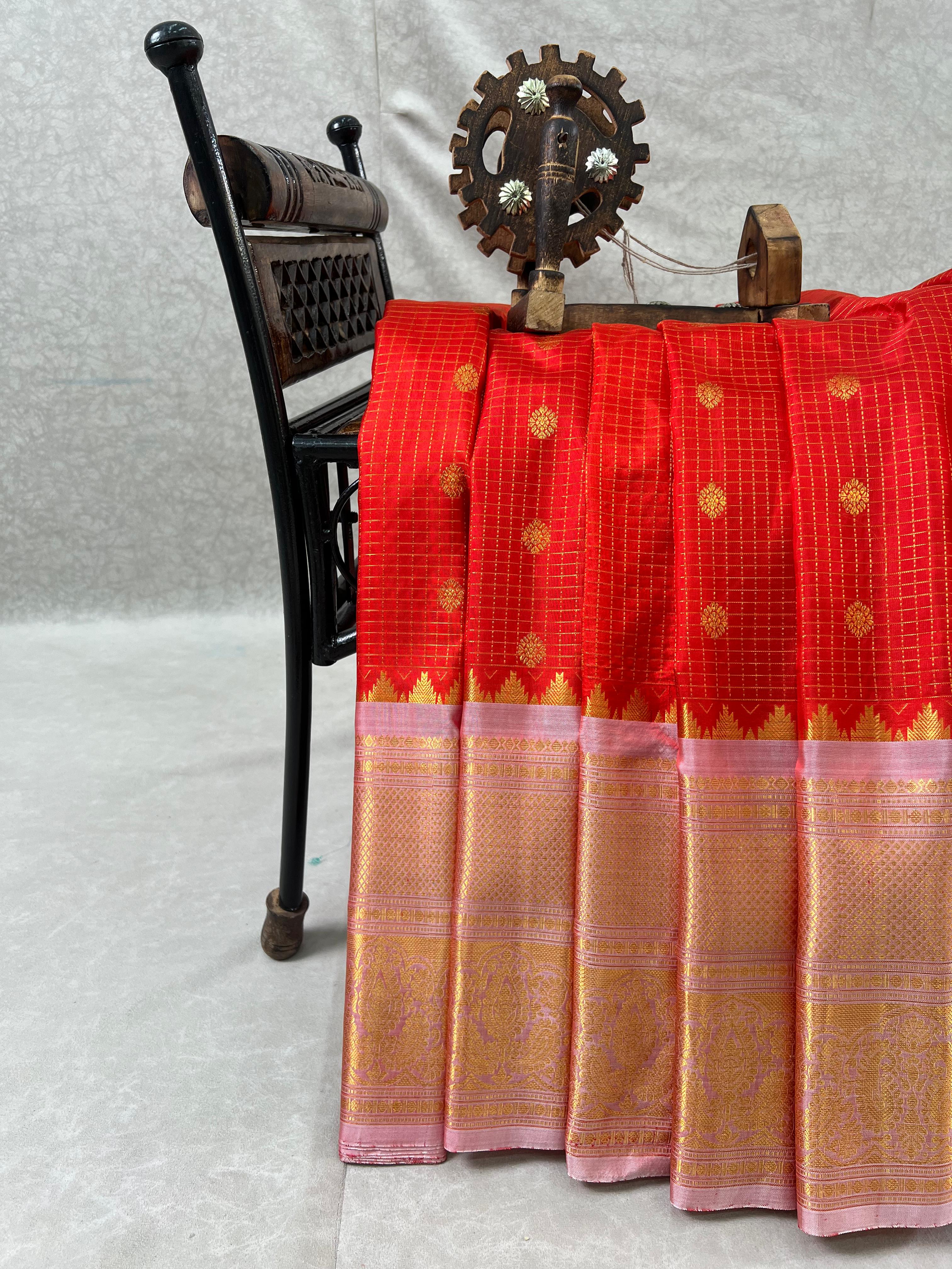This radiant Gadwal Pure Silk Handloom Saree features a vibrant orange body adorned with subtle golden checks and zari buttas. The rich onion pink colour zari woven border and pallu, highlighted with intricate peacock motifs, add a royal elegance. A perfect pick for festive and traditional occasions.Comes with a contrast blouse, making it a perfect choice for festive occasions and grand celebrations!. Silk Mark Certified.