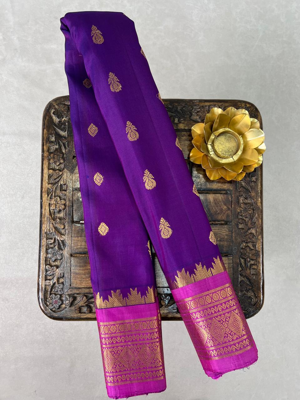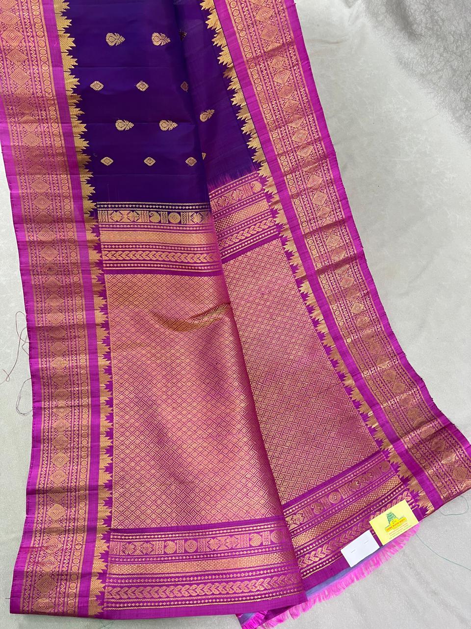 This elegant Gadwal Pure Silk Handloom Saree features a rich purple body adorned with delicate golden zari buttas. The contrast pink border and pallu with intricate golden motifs add a touch of regal charm, making it perfect for festive and traditional celebrations. Comes with a contrast blouse, making it a perfect choice for festive occasions and grand celebrations!. Silk Mark Certified.