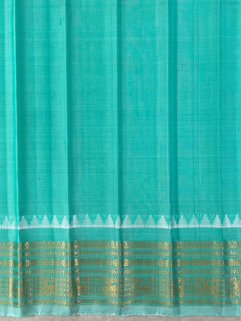 This elegant Gadwal Pure Silk Handloom Saree features a rich light blue body adorned with delicate golden zari buttas. The contrast sea green border and pallu with intricate golden motifs add a touch of regal charm, making it perfect for festive and traditional celebrations. Comes with a contrast blouse, making it a perfect choice for festive occasions and grand celebrations!. Silk Mark Certified.