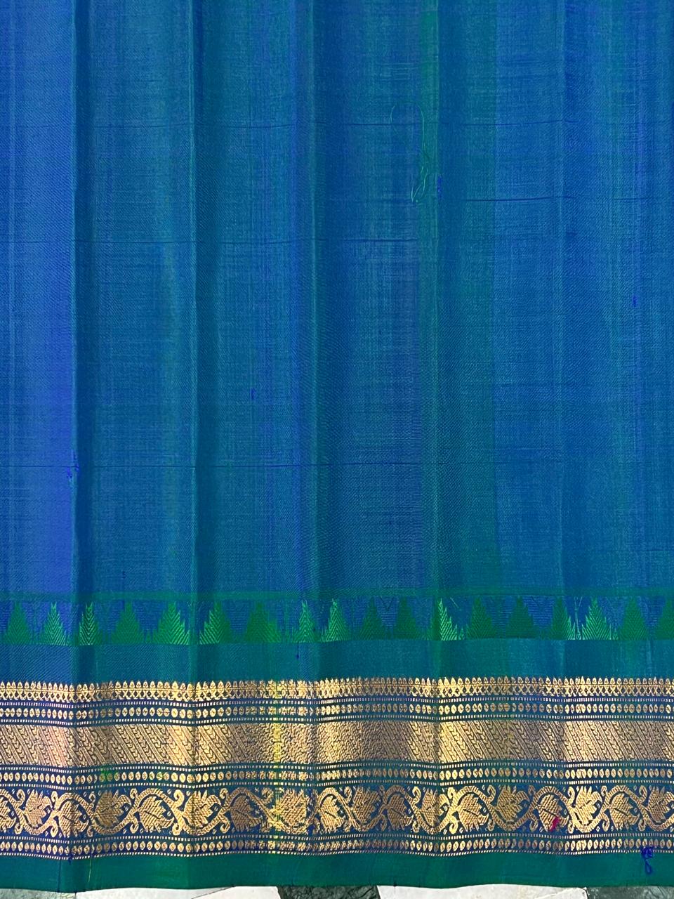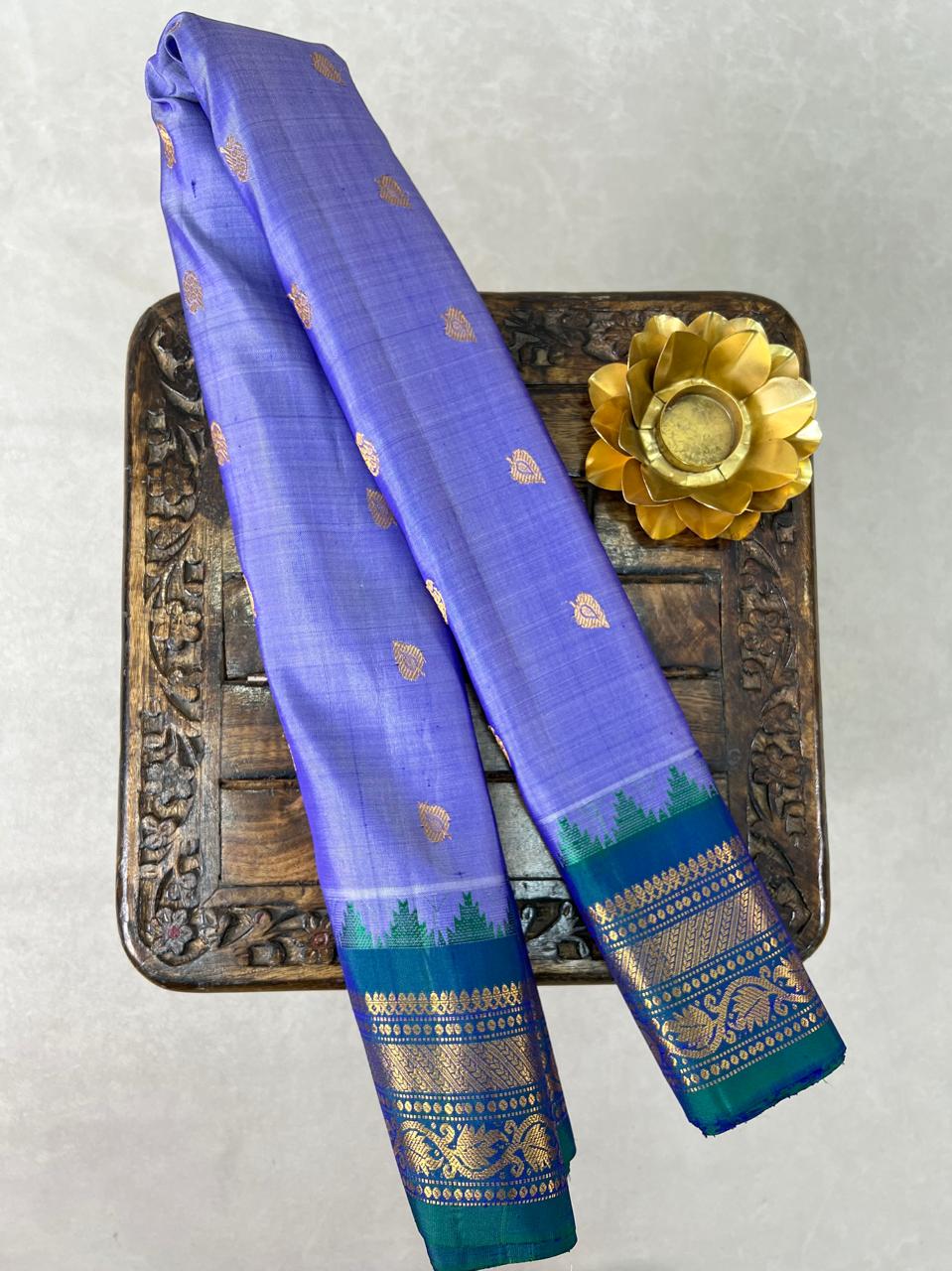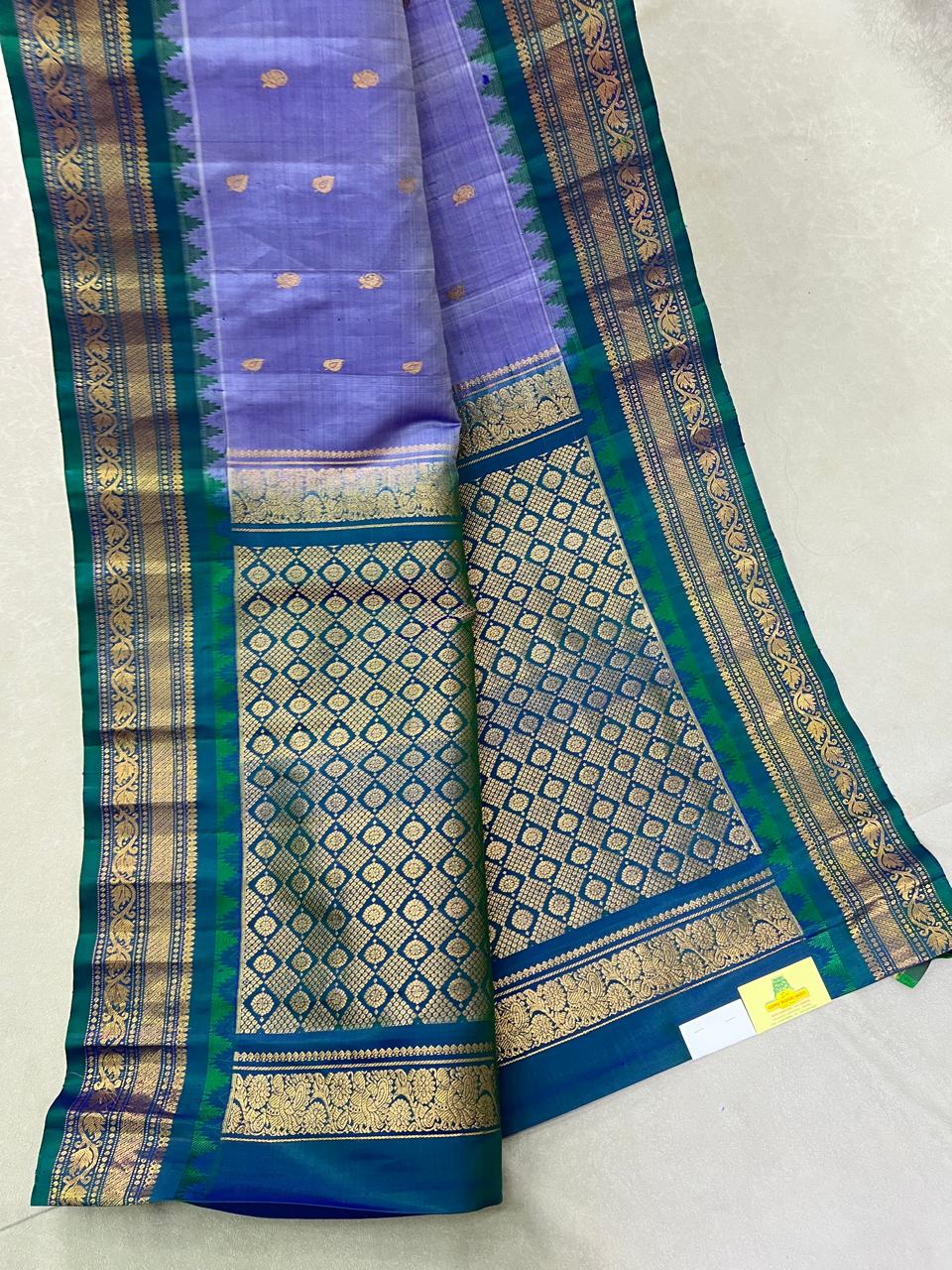 This elegant Gadwal Pure Silk Handloom Saree features a rich lavender body adorned with delicate golden zari buttas. The contrast peacock blue border and pallu with intricate golden motifs add a touch of regal charm, making it perfect for festive and traditional celebrations. Comes with a contrast blouse, making it a perfect choice for festive occasions and grand celebrations!. Silk Mark Certified.