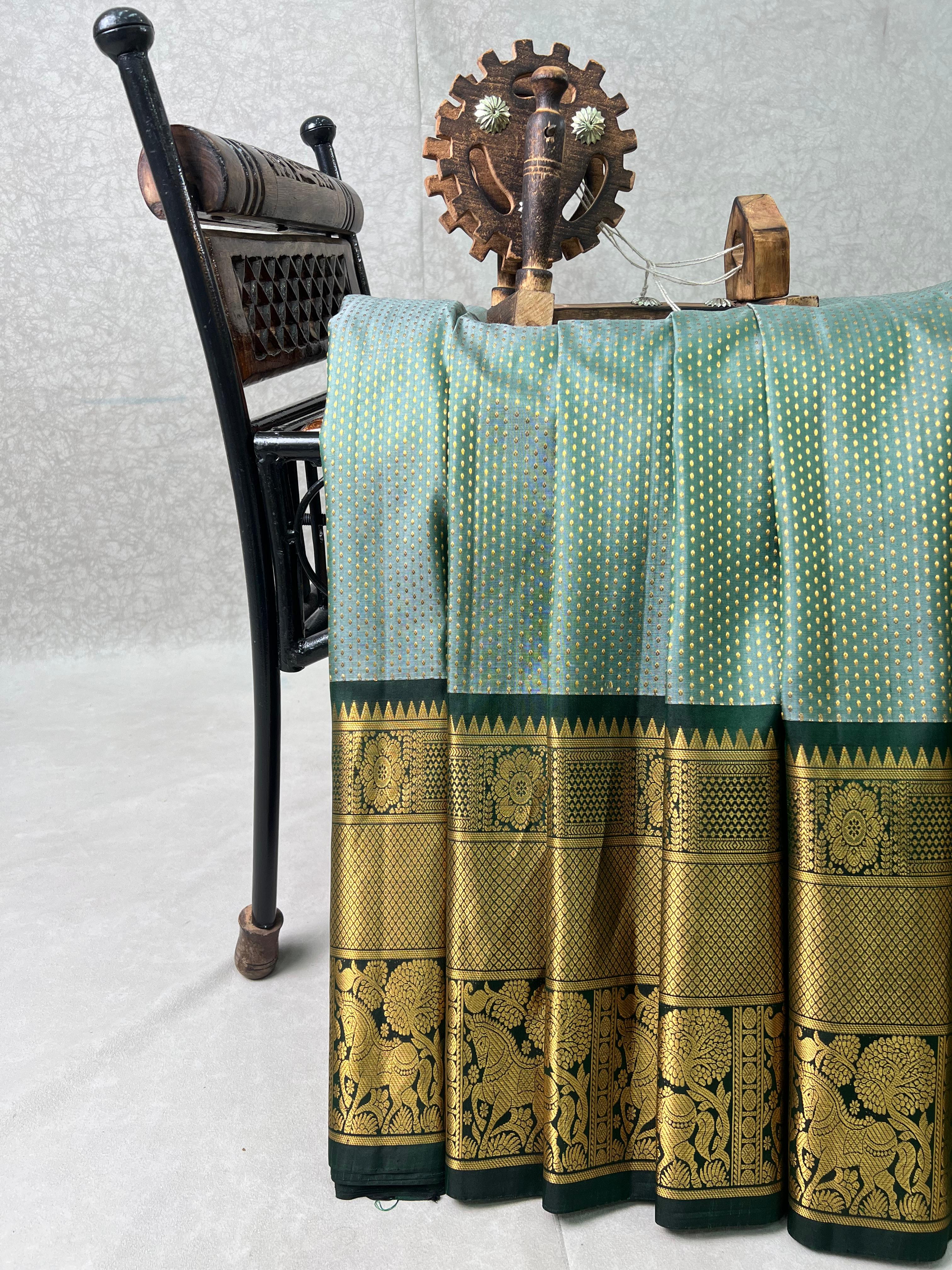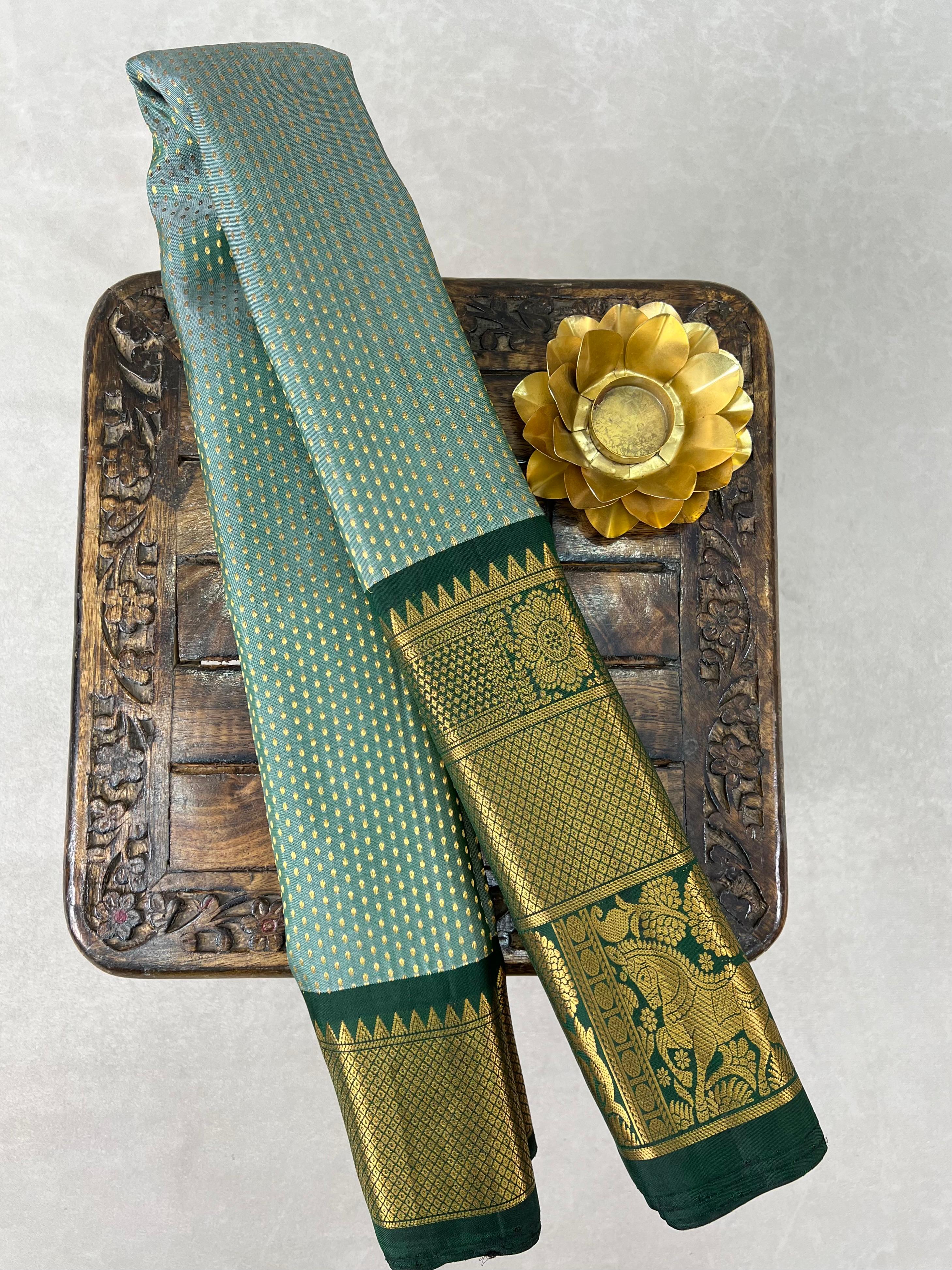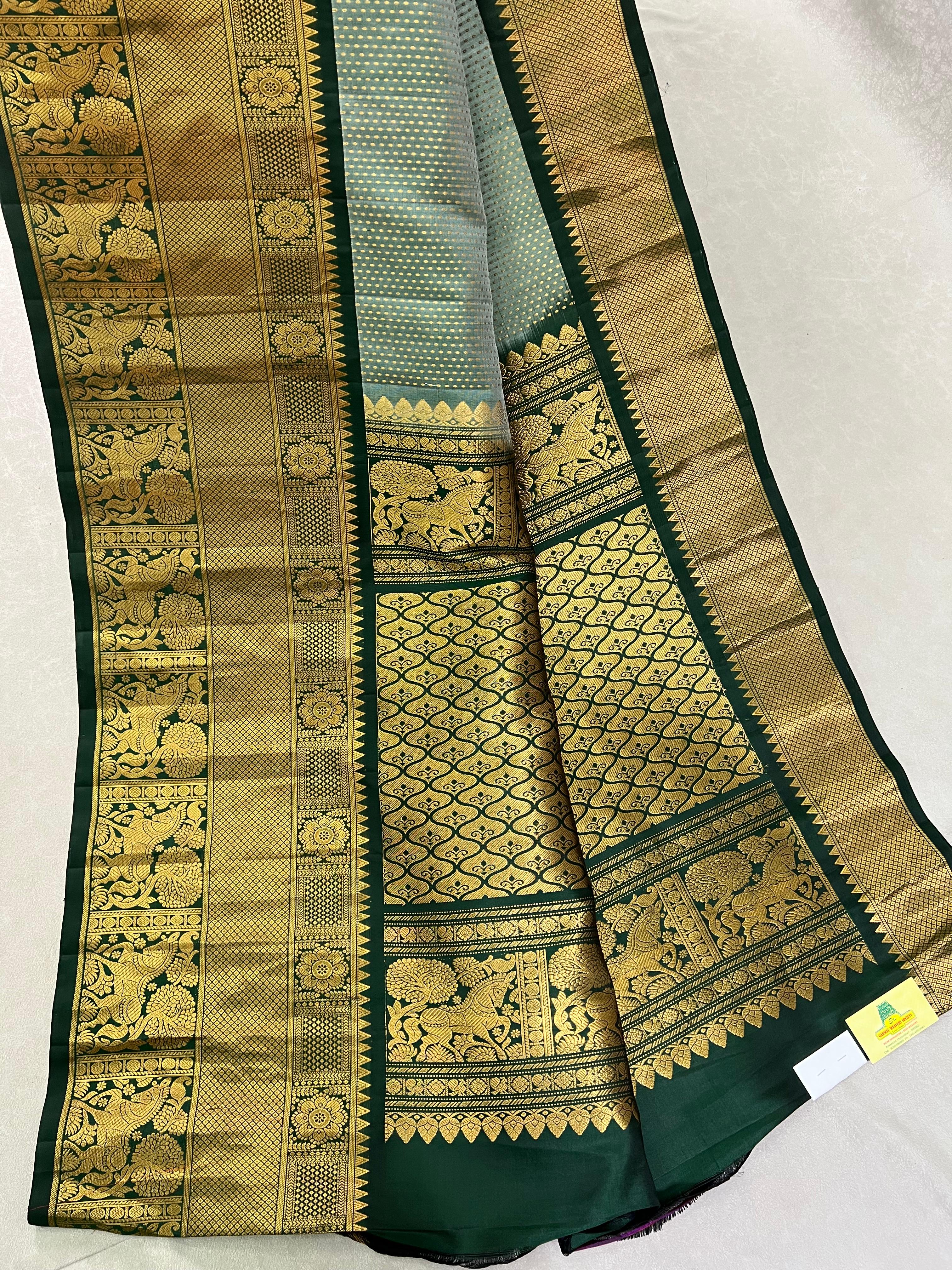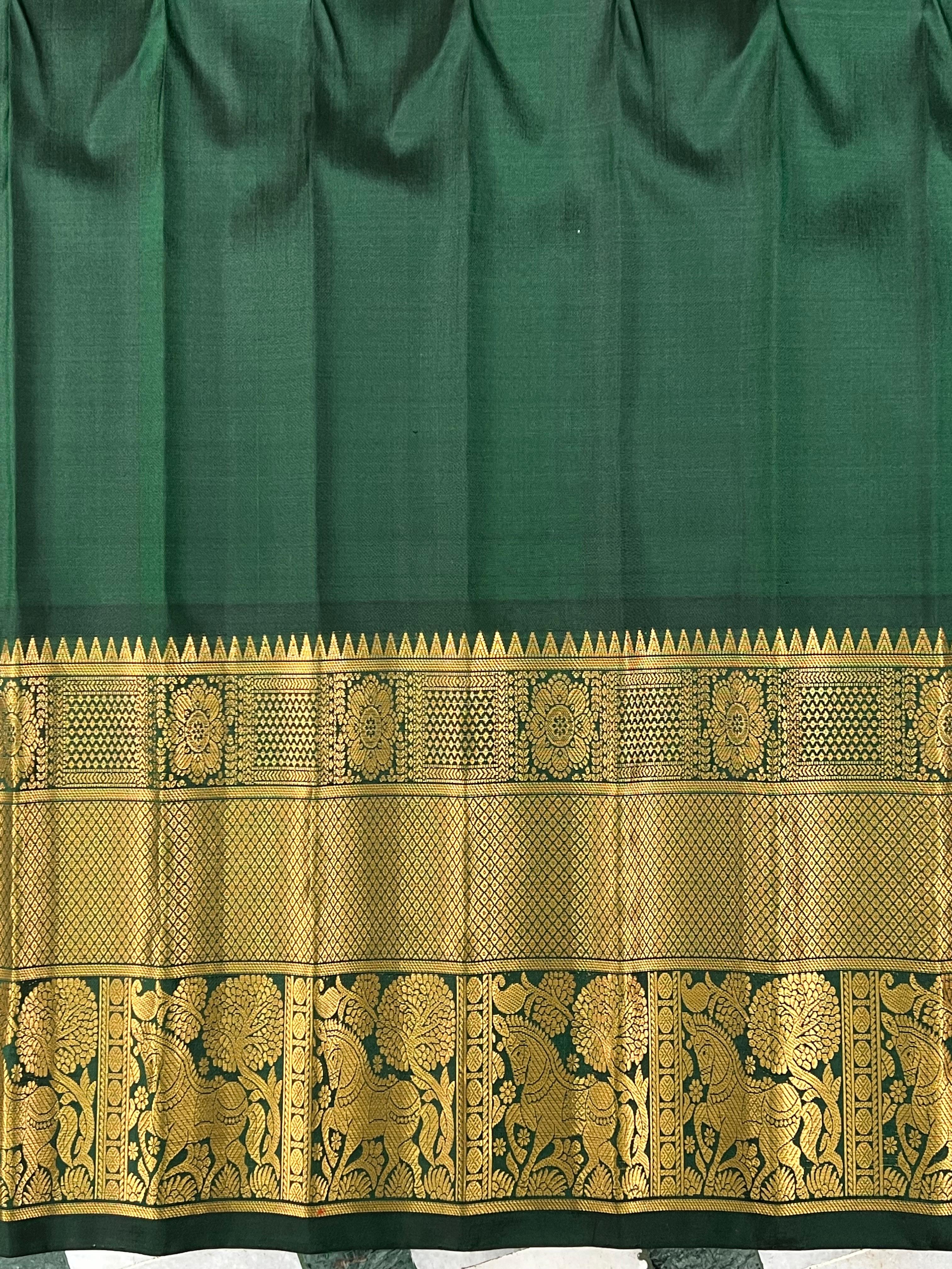 Exuding grace and traditional artistry, this Gadwal Pure Silk Handloom Saree features a soothing pastel green body adorned with delicate golden zari buttas. The rich dark green border and pallu are intricately woven with elegant temple motifs and floral zari designs, adding a royal touch. Perfect for festive occasions and cultural celebrations. Comes with a contrast blouse, making it a perfect choice for festive occasions and grand celebrations!. Silk Mark Certified.