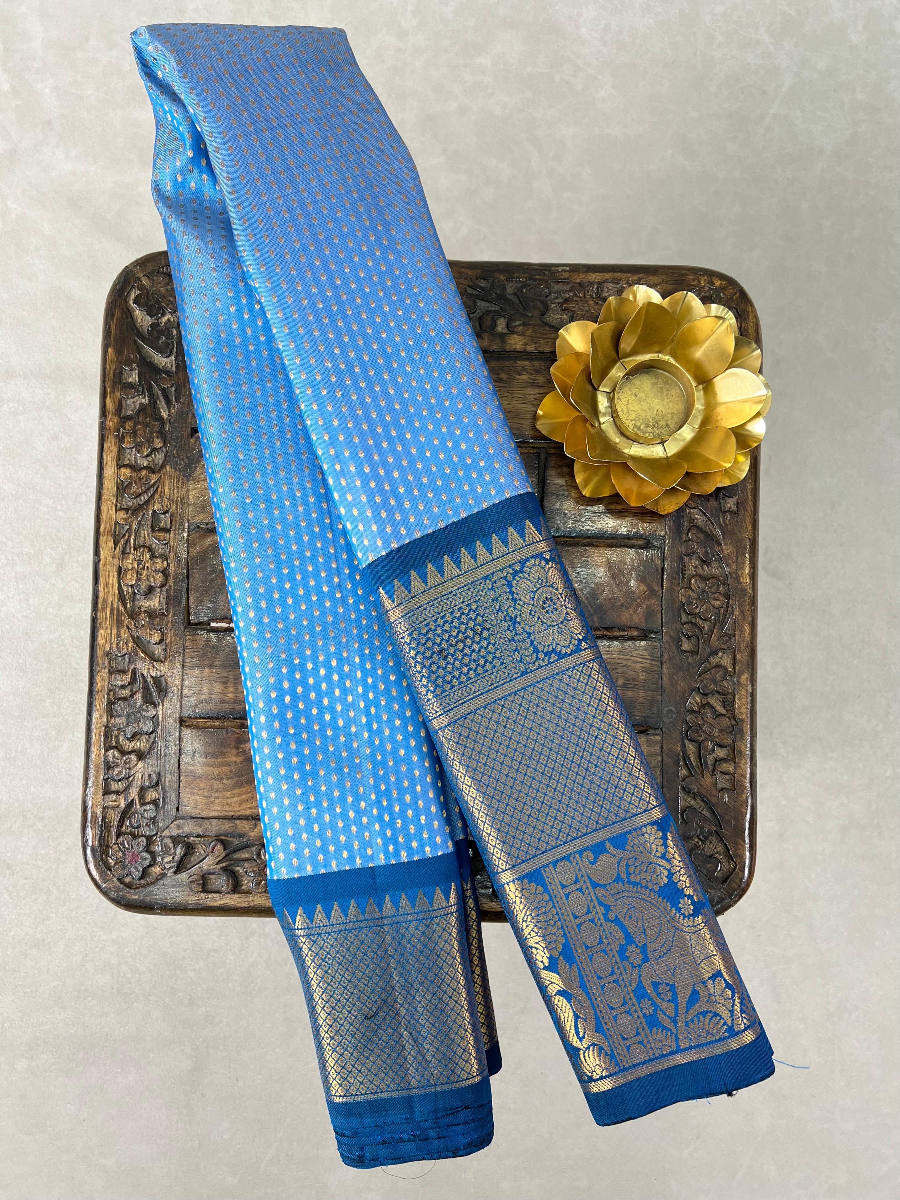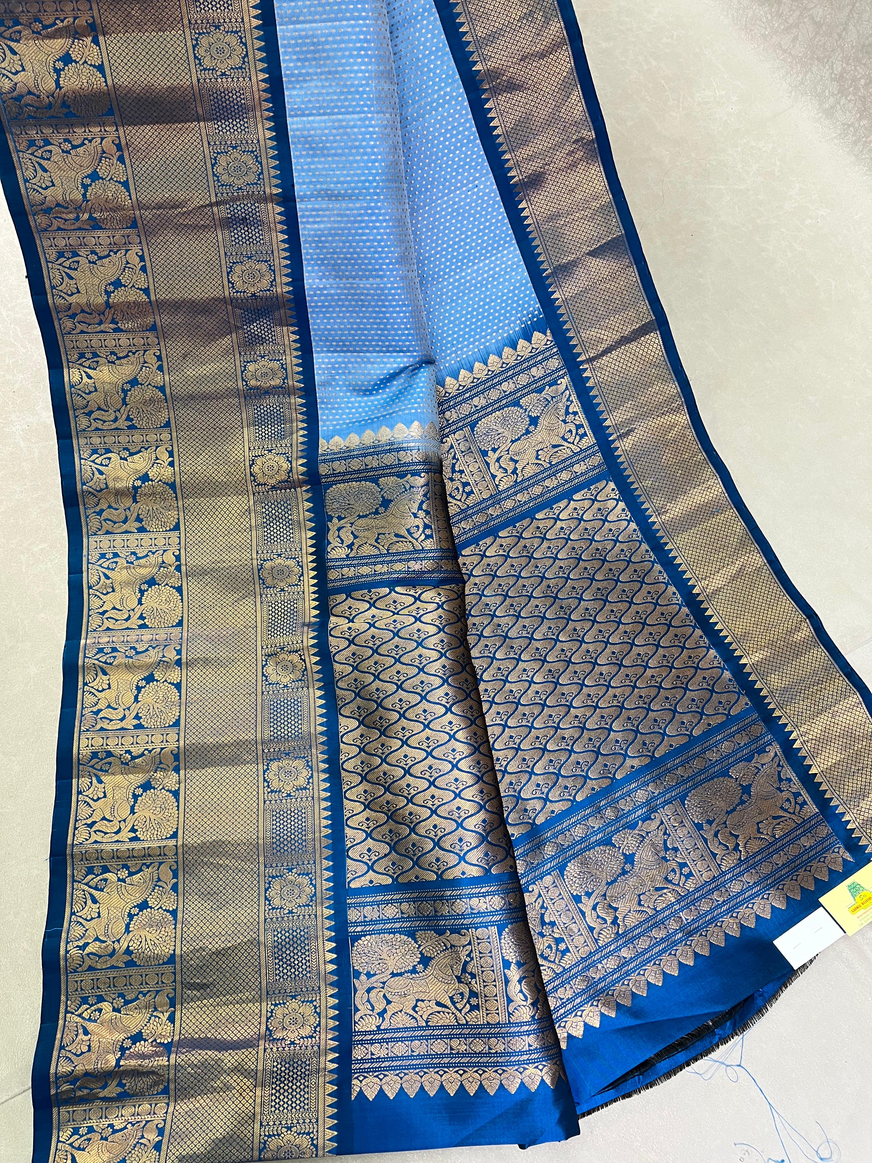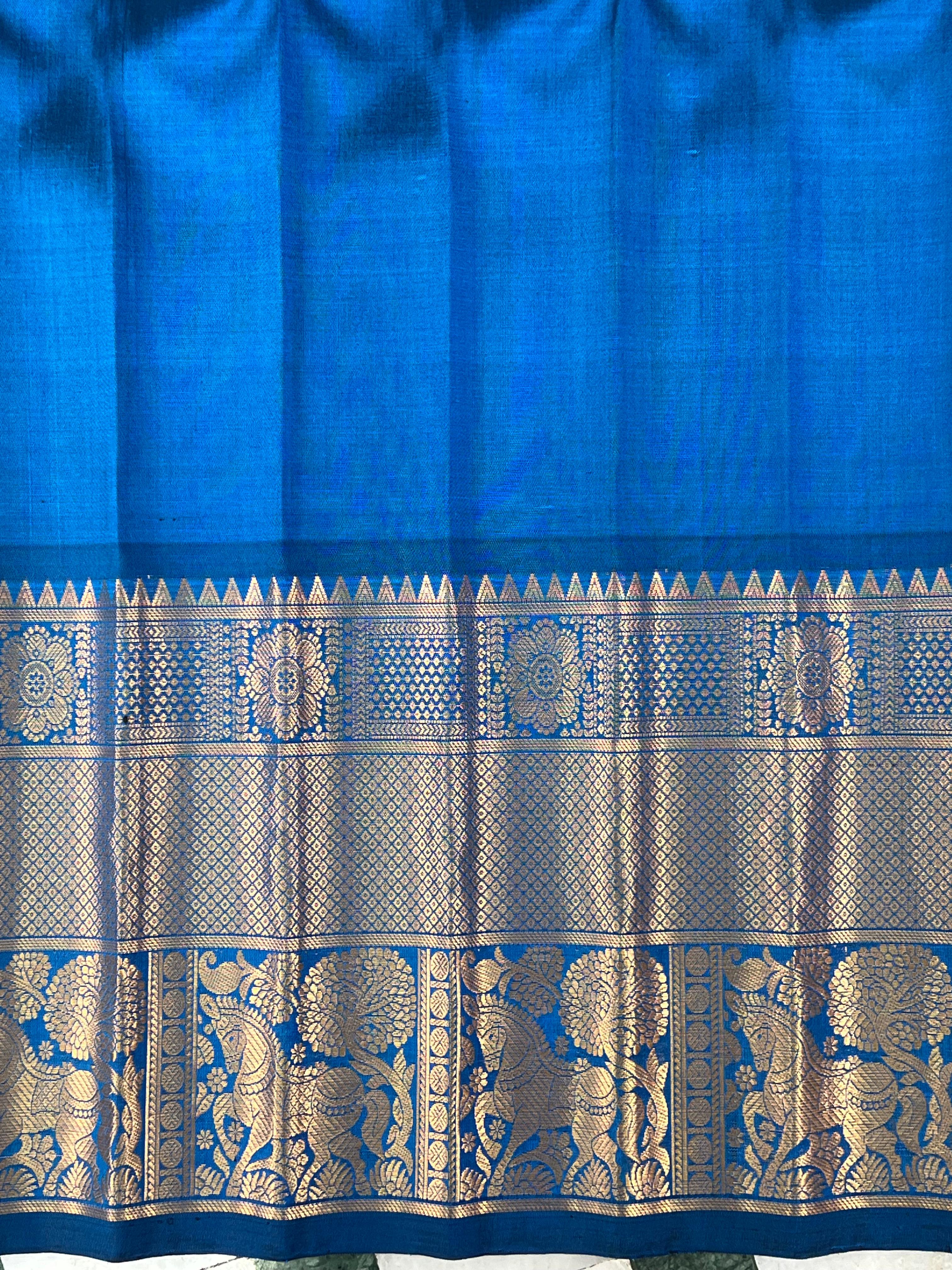 Exuding grace and traditional artistry, this Gadwal Pure Silk Handloom Saree features a soothing pastel blue body adorned with delicate golden zari buttas. The rich peacock blue border and pallu are intricately woven with elegant temple motifs and floral zari designs, adding a royal touch. Perfect for festive occasions and cultural celebrations. Comes with a contrast blouse, making it a perfect choice for festive occasions and grand celebrations!. Silk Mark Certified.