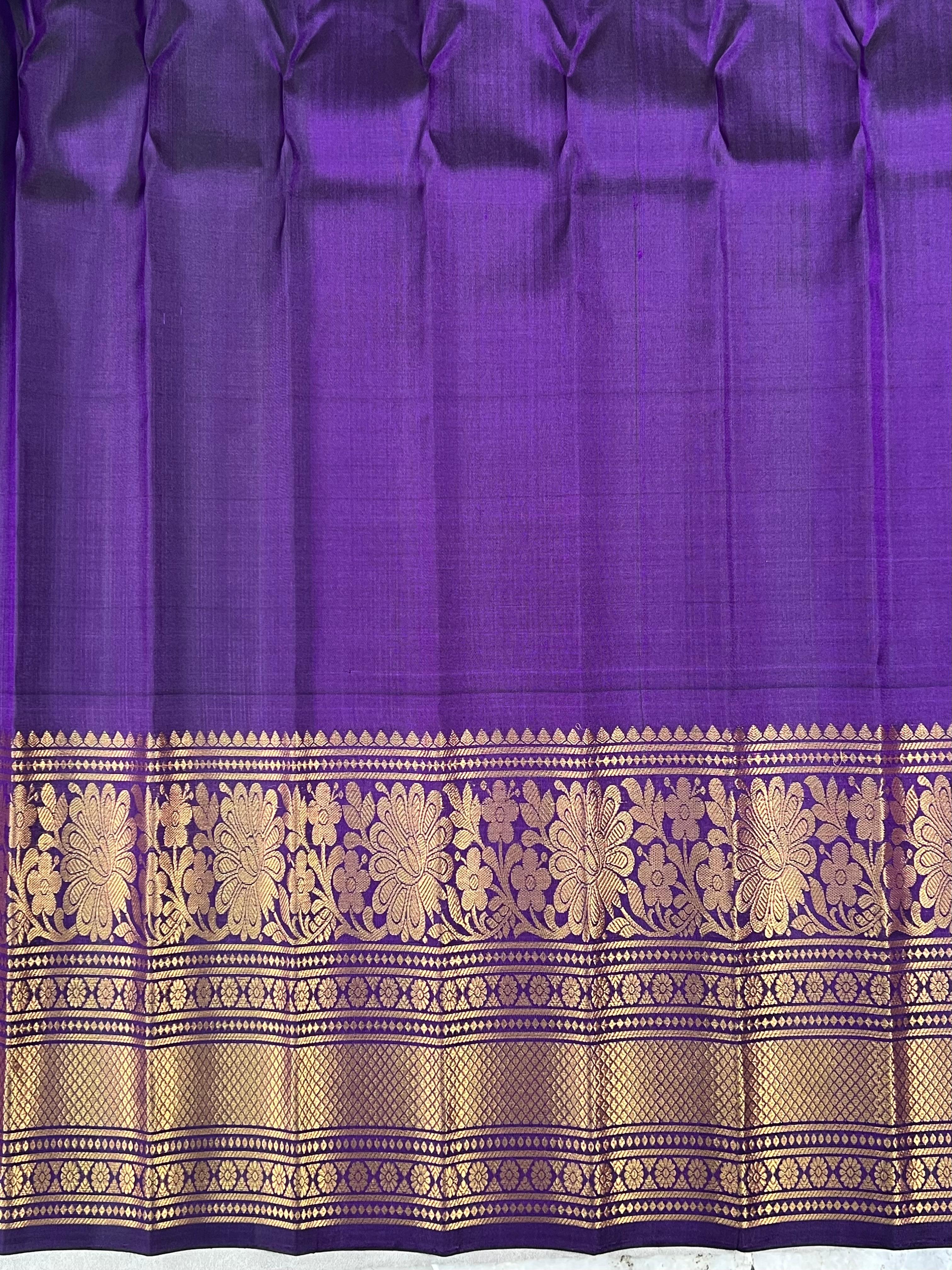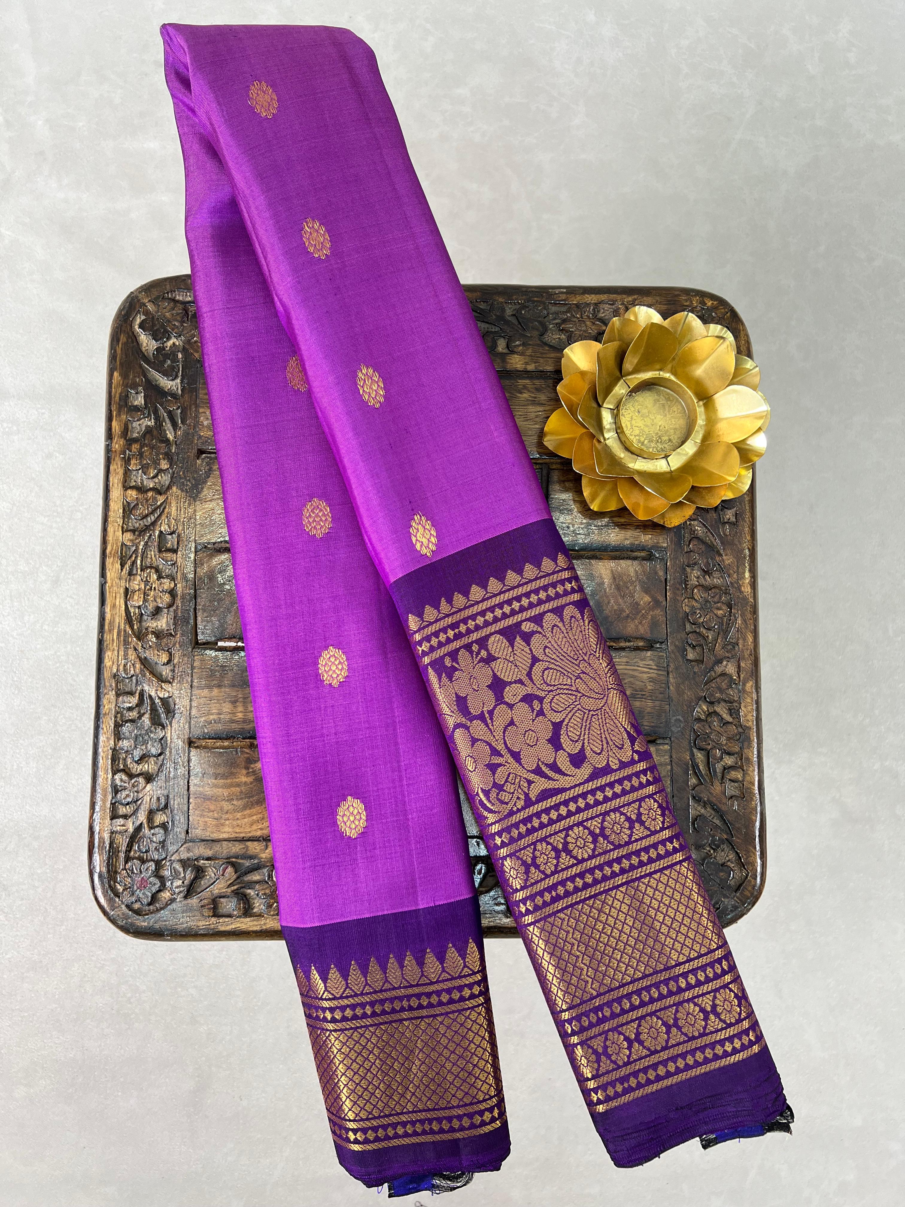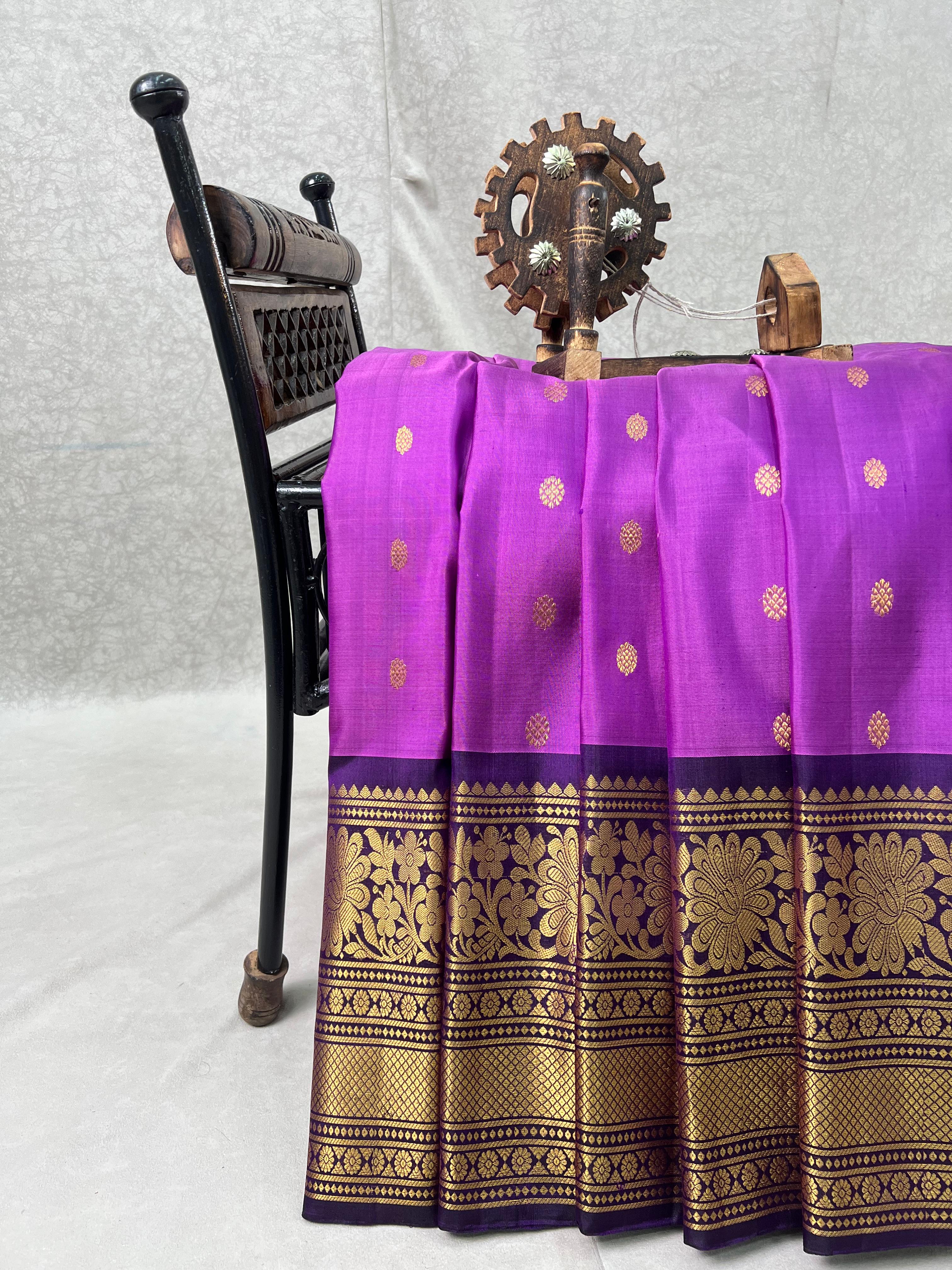 Radiating festive charm, this Gadwal Pure Silk Handloom Saree features a rich purple body adorned with elegant gold zari buttas. The contrasting soft violet border and pallu are intricately woven with floral and geometric zari patterns, adding a touch of regal elegance. A perfect blend of tradition and sophistication, this saree is ideal for weddings, festive occasions, and grand celebrations. Comes with a contrast blouse, making it a perfect choice for festive occasions and grand celebrations!. Silk Mark Certified.